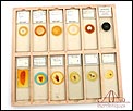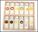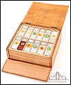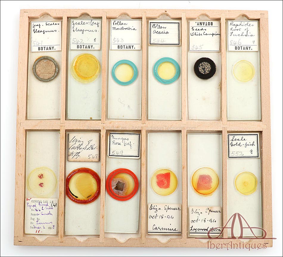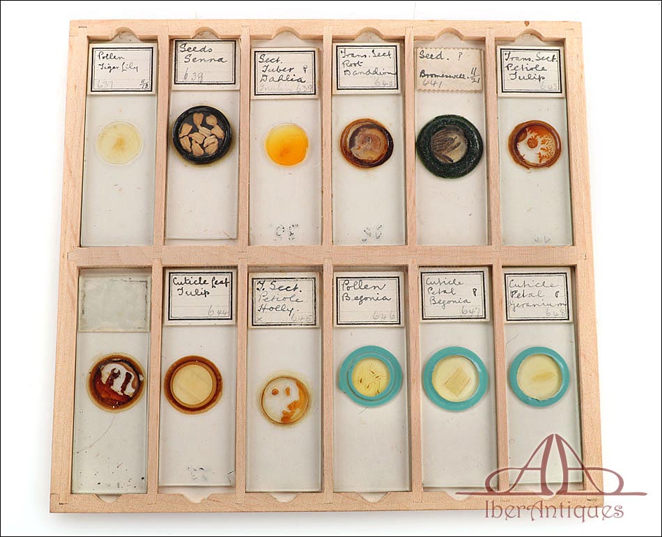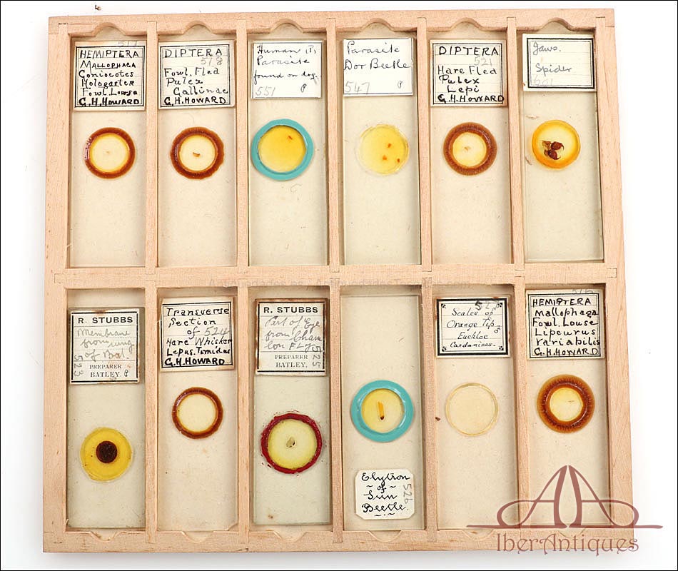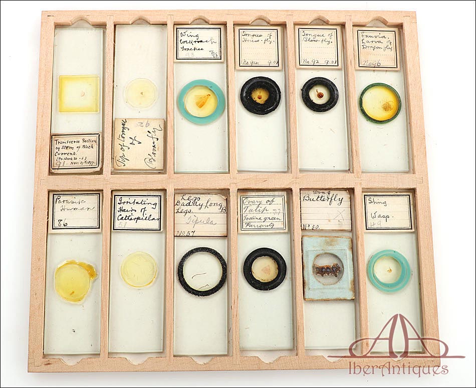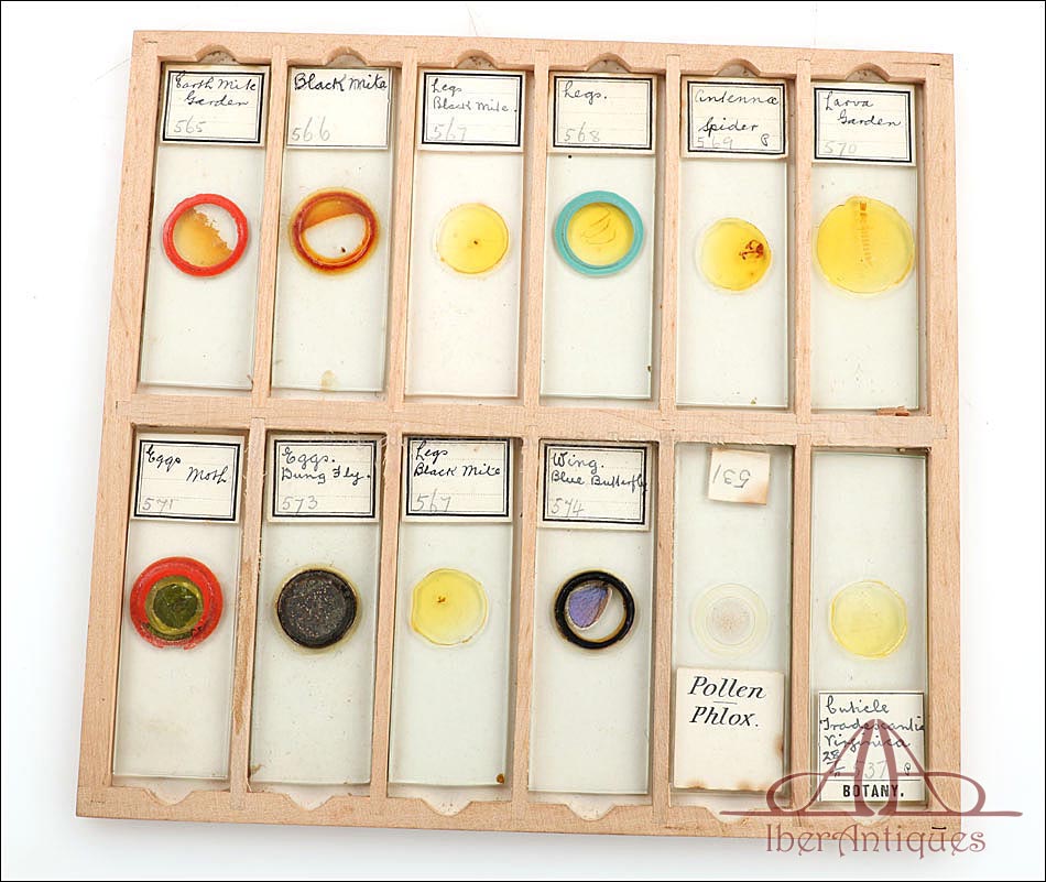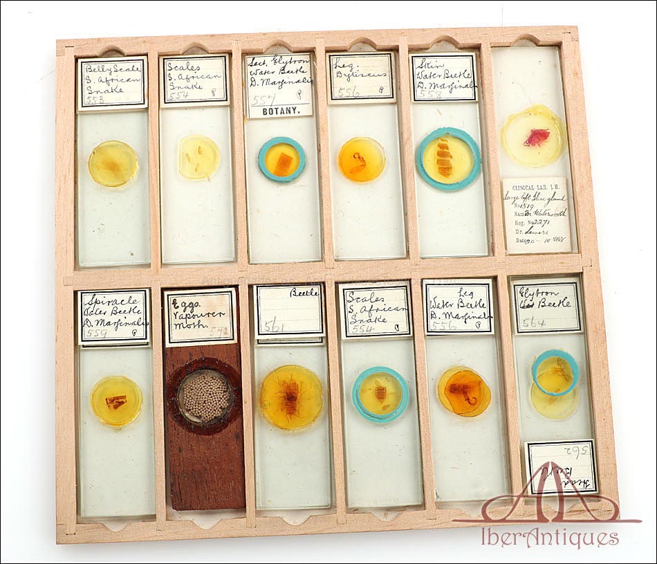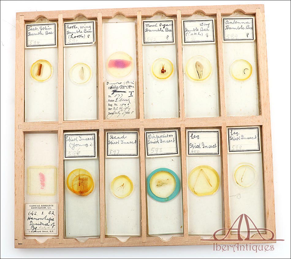 Gran colección de 144 preparados de microscopio antiguos, realizada en Inglaterra en el siglo XIX y muy bien conservada. La colección está completa y tiene un enorme interés, tanto científico como histórico. Está formada por distintos tipos de insectos y partes de plantas, todos ellos etiquetados con sus nombres manuscritos en inglés: polen, pétalos, arañas, escarabajos... Los preparados van montados mayoritariamente sobre placas de vidrio. Están organizados en bandejas que se ajustan en el estuche; la parte delantera es abatible para facilitar su extracción y guardado.