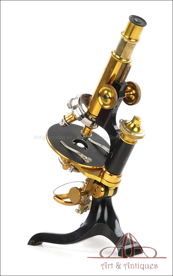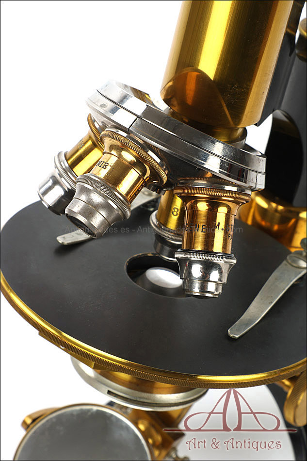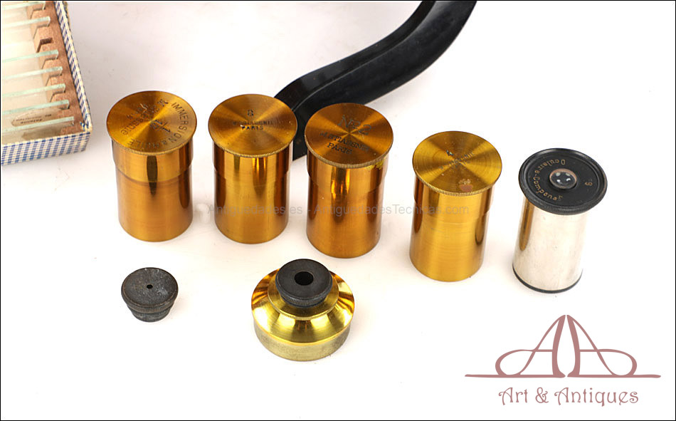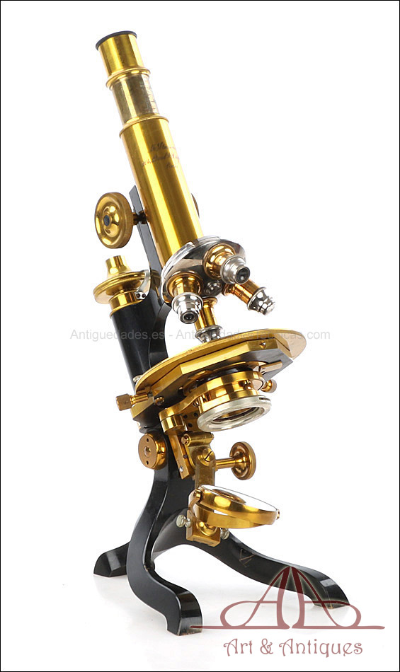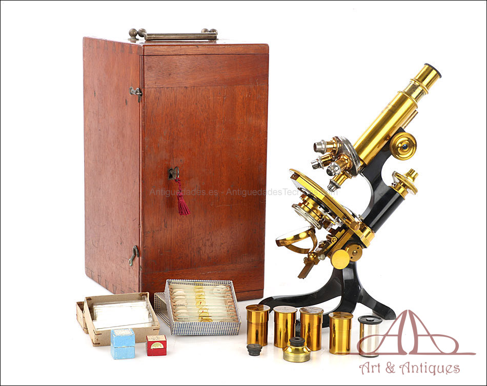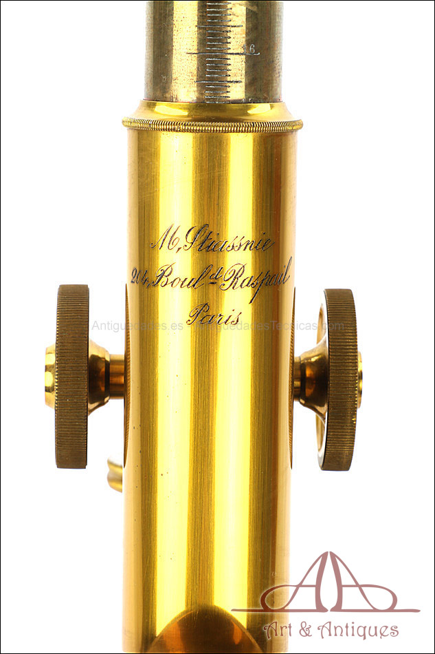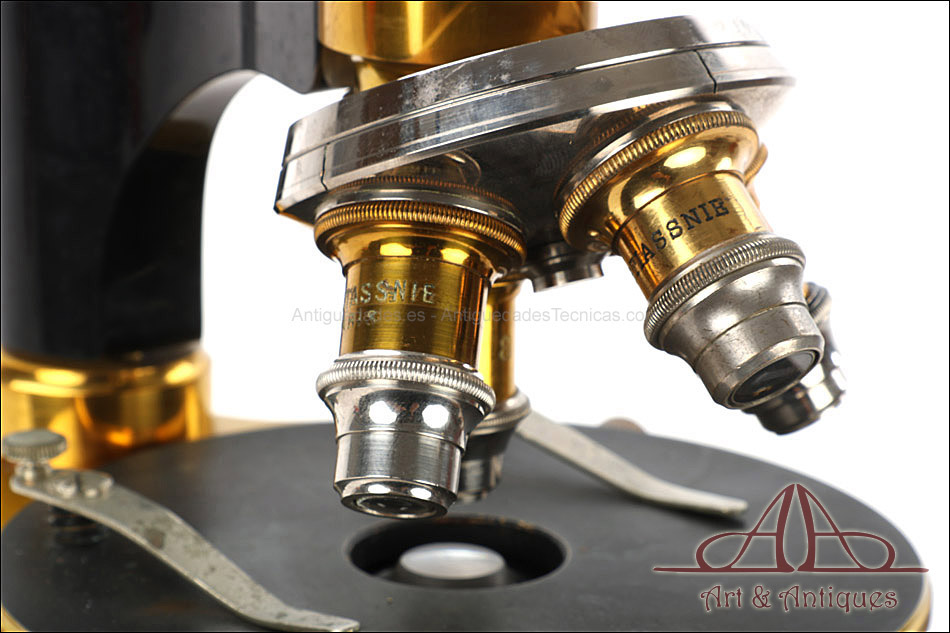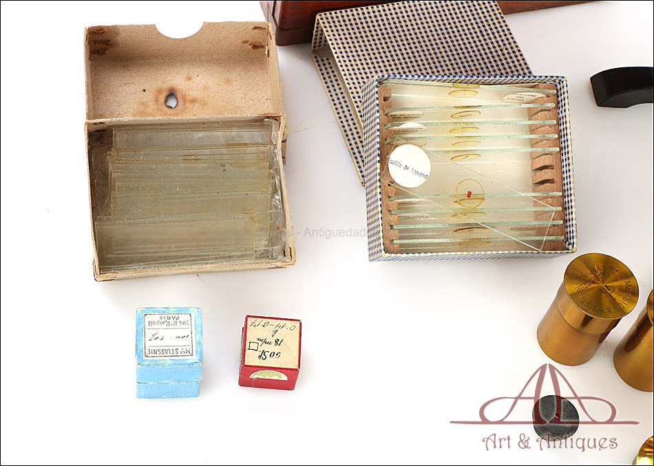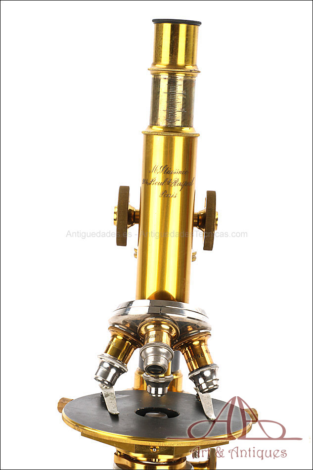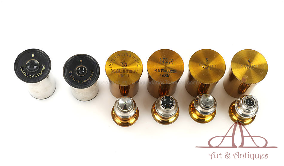 Espectacular microscopio francés Stiassnie fabricado en Francia circa 1890, para uso profesional y en soberbias condiciones. Se presenta en su estuche original de madera de caoba e incluye un juego de 2 oculares y 3 objetivos, todos ellos de la marca. Tanto el microscopio como los accesorios funcionan perfectamente; el pin del diafragma está desprendido y actualmente este dispositivo no funciona, pero se incluye para volverlo a montar si se desea. El resto de las piezas funcionan perfectamente; la cremallera de la torre se desliza con suavidad y permite un correcto enfoque de las muestras. La base de metal esmaltado se muestra brillante y lisa, y la parte superior de latón conserva el barniz original y está en un estado magnífico. La torre lleva grabado a mano el nombre M. Stiassinie y la calle donde se ubicaba el taller en París. El microscopio lleva revólver de 4 lentes e incluye una caja de preparados de época, así como un juego de placas de cristal virgen. El estuche está muy bien conservado, con la cerradura y la llave originales en perfecto funcionamiento.
