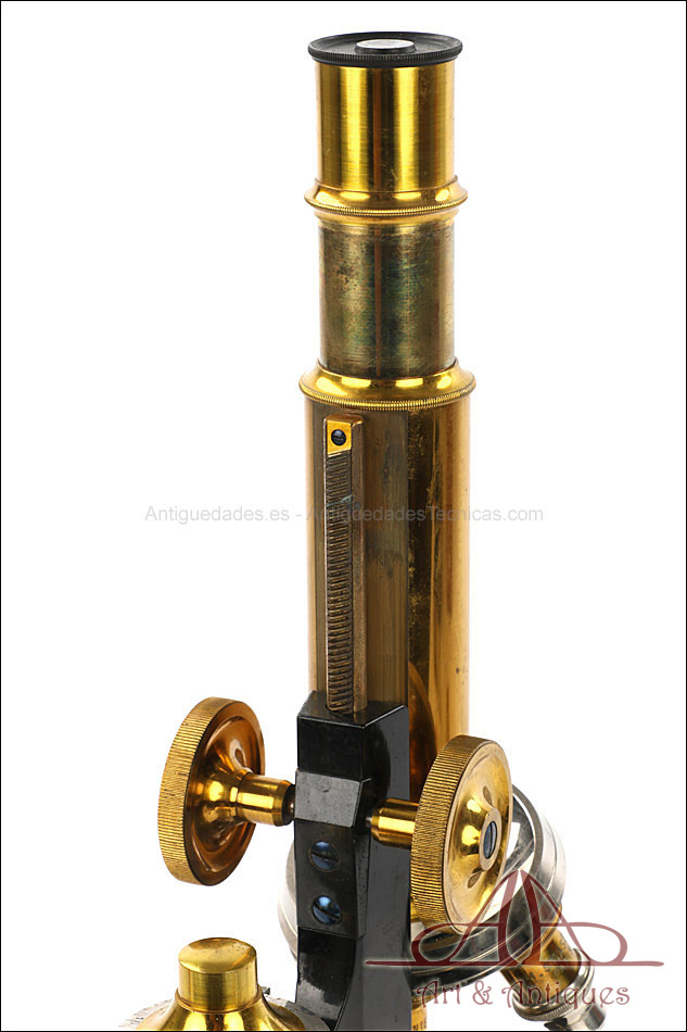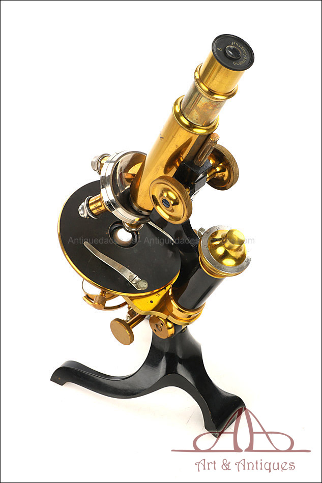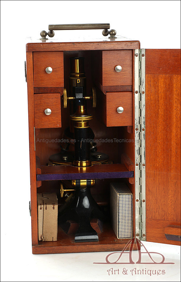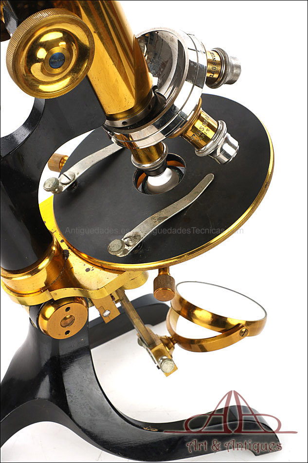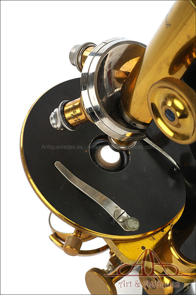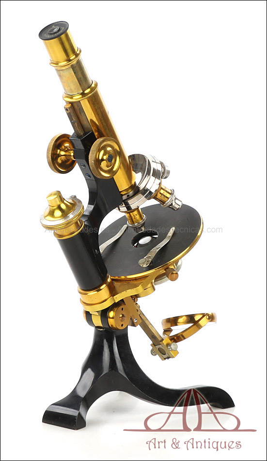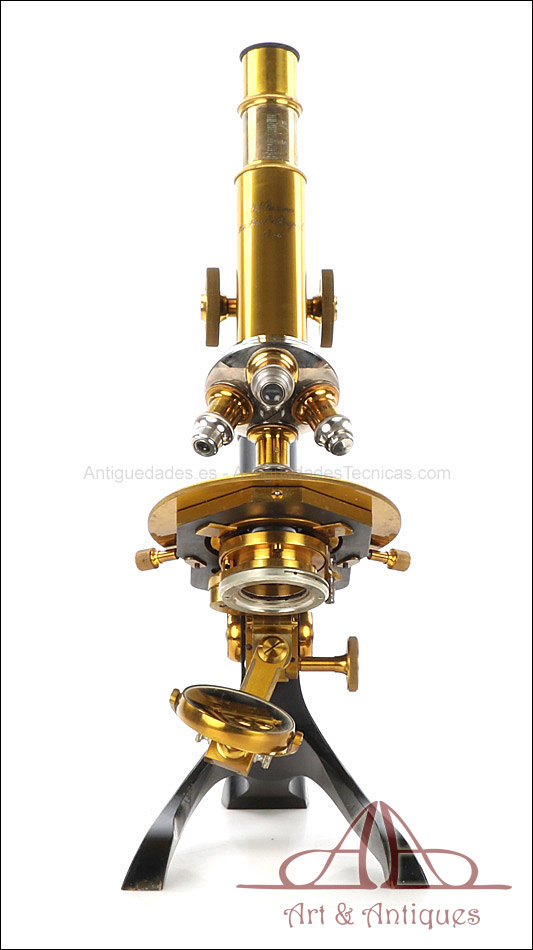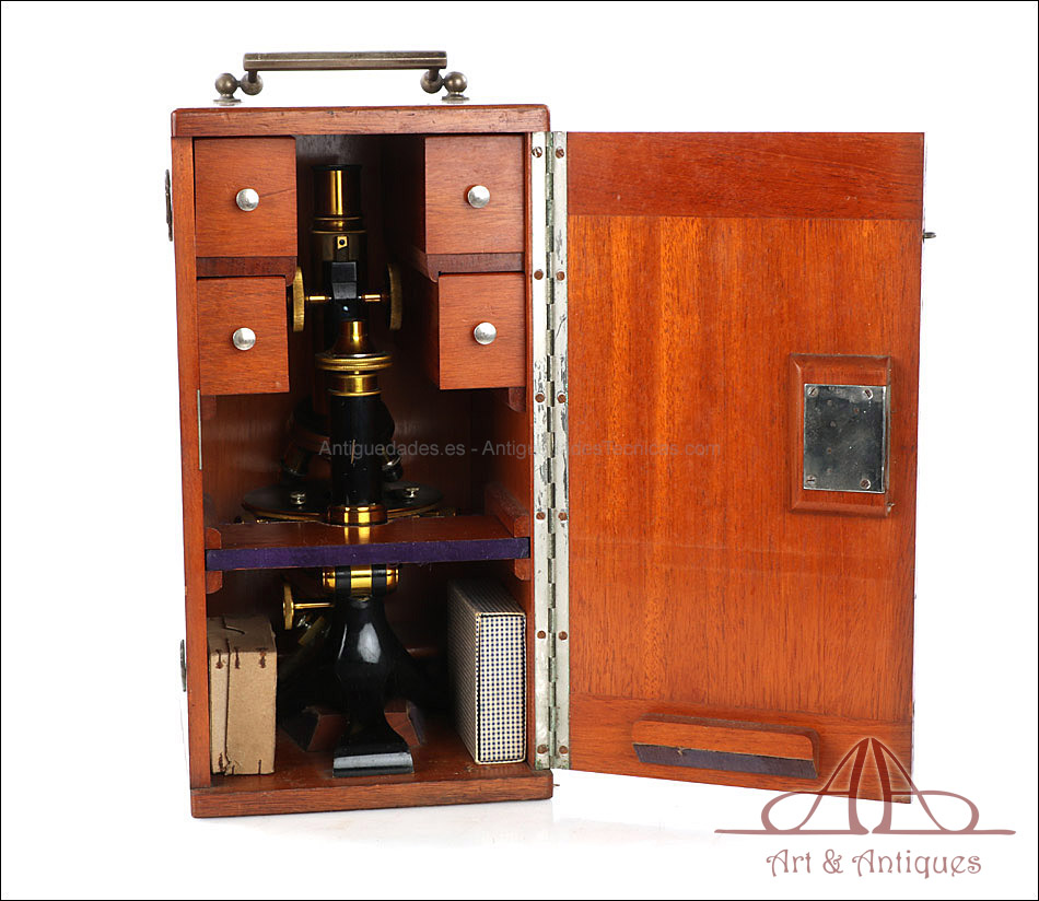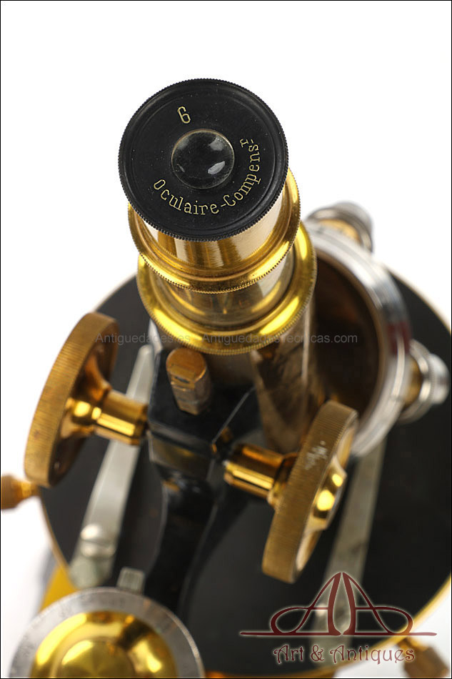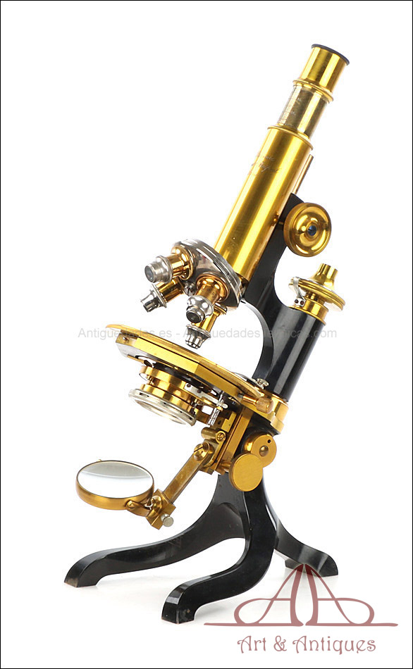 Espectacular microscopio francés Stiassnie fabricado en Francia circa 1890, para uso profesional y en soberbias condiciones. Se presenta en su estuche original de madera de caoba e incluye un juego de 2 oculares y 3 objetivos, todos ellos de la marca. Tanto el microscopio como los accesorios funcionan perfectamente; el pin del diafragma está desprendido y actualmente este dispositivo no funciona, pero se incluye para volverlo a montar si se desea. El resto de las piezas funcionan perfectamente; la cremallera de la torre se desliza con suavidad y permite un correcto enfoque de las muestras. La base de metal esmaltado se muestra brillante y lisa, y la parte superior de latón conserva el barniz original y está en un estado magnífico. La torre lleva grabado a mano el nombre M. Stiassinie y la calle donde se ubicaba el taller en París. El microscopio lleva revólver de 4 lentes e incluye una caja de preparados de época, así como un juego de placas de cristal virgen. El estuche está muy bien conservado, con la cerradura y la llave originales en perfecto funcionamiento.