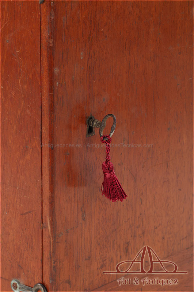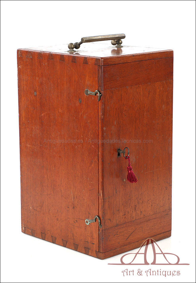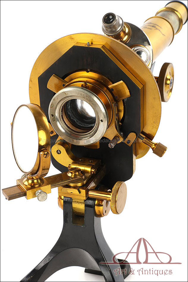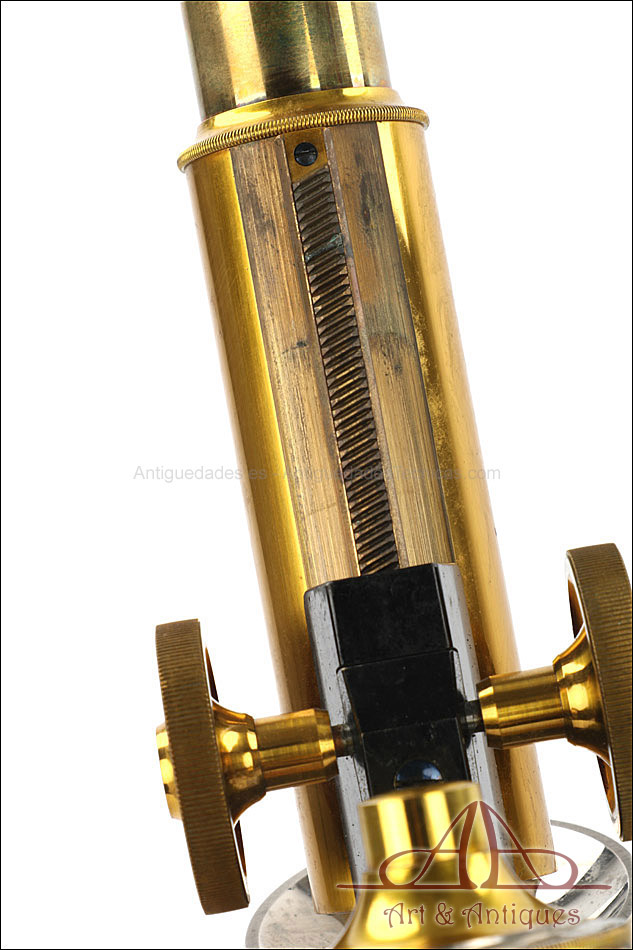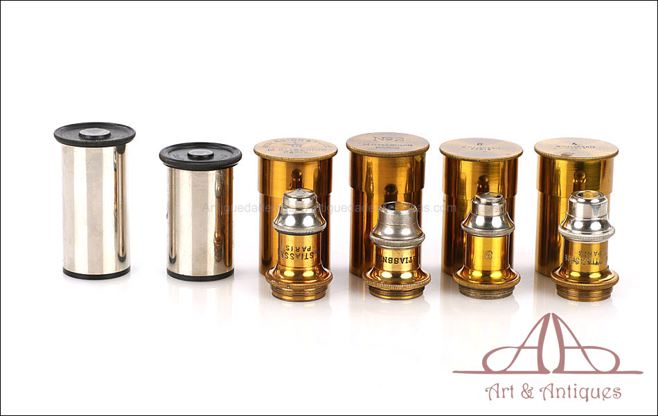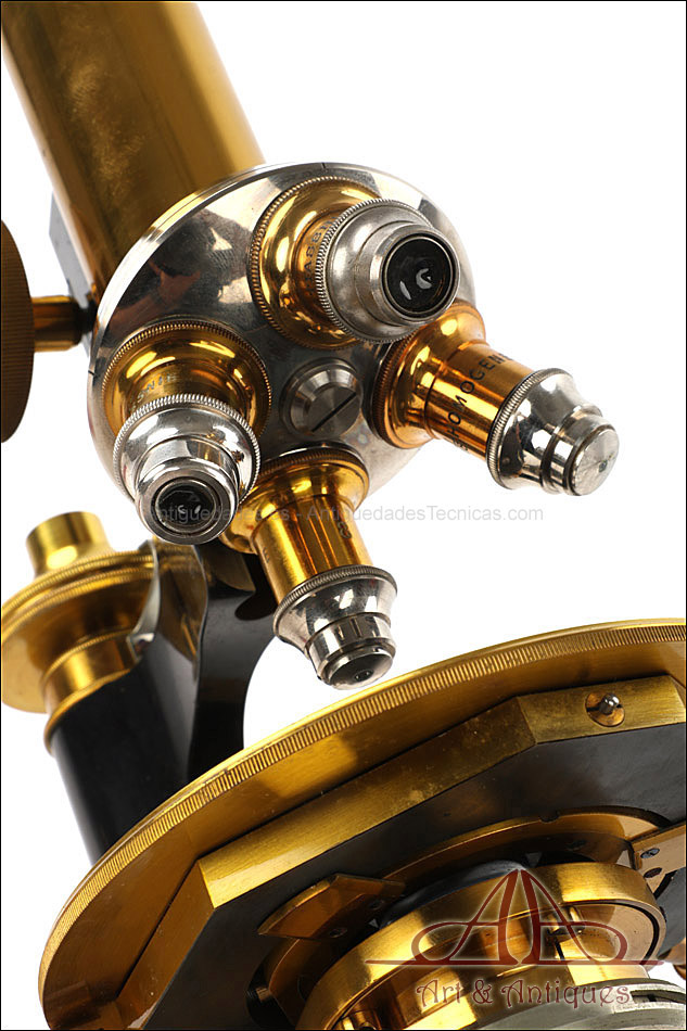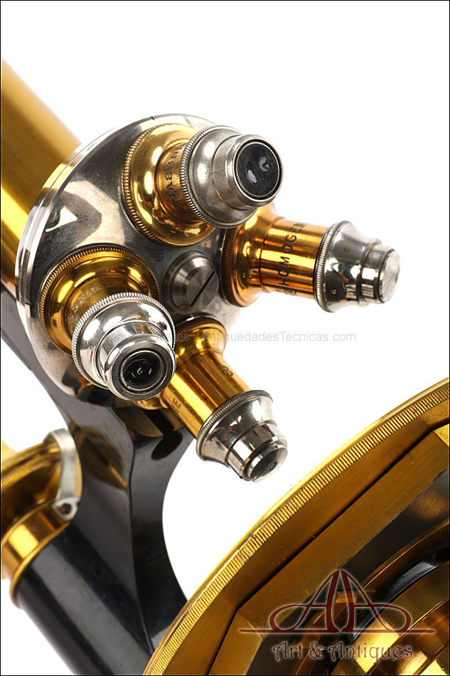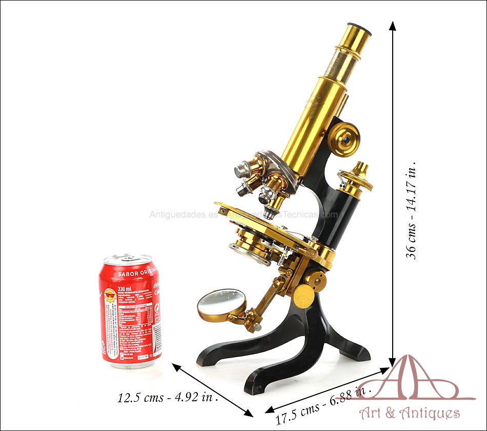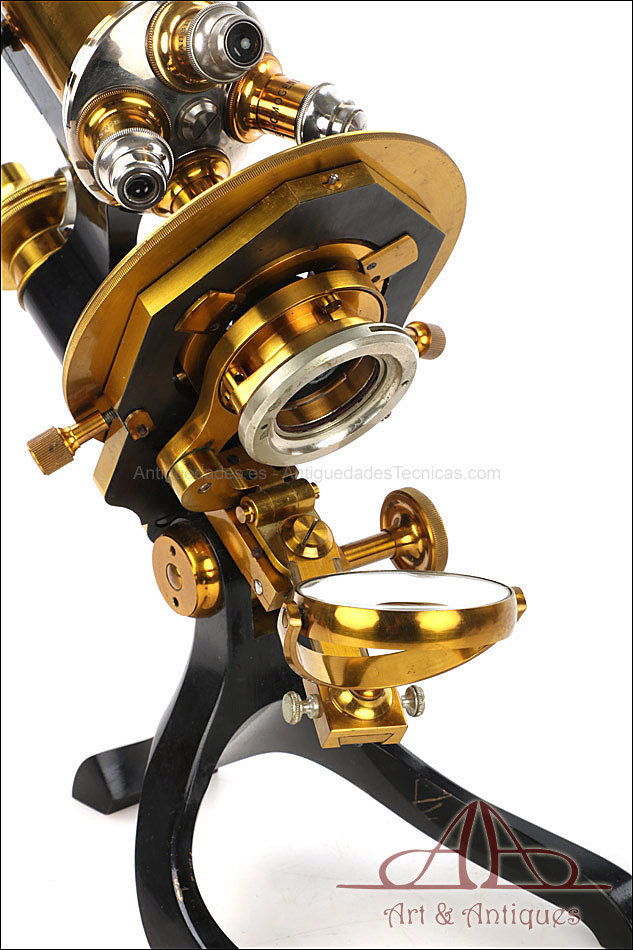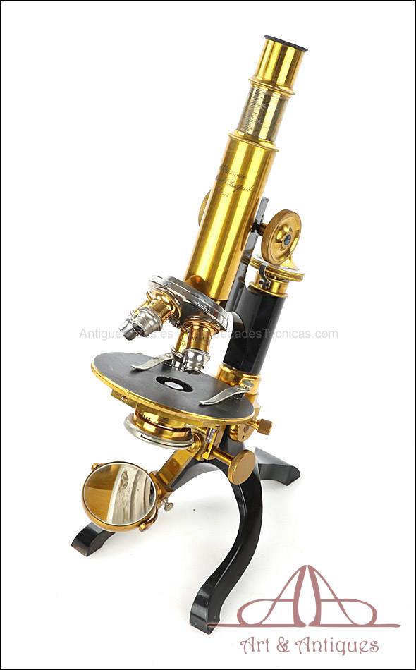 Espectacular microscopio francés Stiassnie fabricado en Francia circa 1890, para uso profesional y en soberbias condiciones. Se presenta en su estuche original de madera de caoba e incluye un juego de 2 oculares y 3 objetivos, todos ellos de la marca. Tanto el microscopio como los accesorios funcionan perfectamente; el pin del diafragma está desprendido y actualmente este dispositivo no funciona, pero se incluye para volverlo a montar si se desea. El resto de las piezas funcionan perfectamente; la cremallera de la torre se desliza con suavidad y permite un correcto enfoque de las muestras. La base de metal esmaltado se muestra brillante y lisa, y la parte superior de latón conserva el barniz original y está en un estado magnífico. La torre lleva grabado a mano el nombre M. Stiassinie y la calle donde se ubicaba el taller en París. El microscopio lleva revólver de 4 lentes e incluye una caja de preparados de época, así como un juego de placas de cristal virgen. El estuche está muy bien conservado, con la cerradura y la llave originales en perfecto funcionamiento.