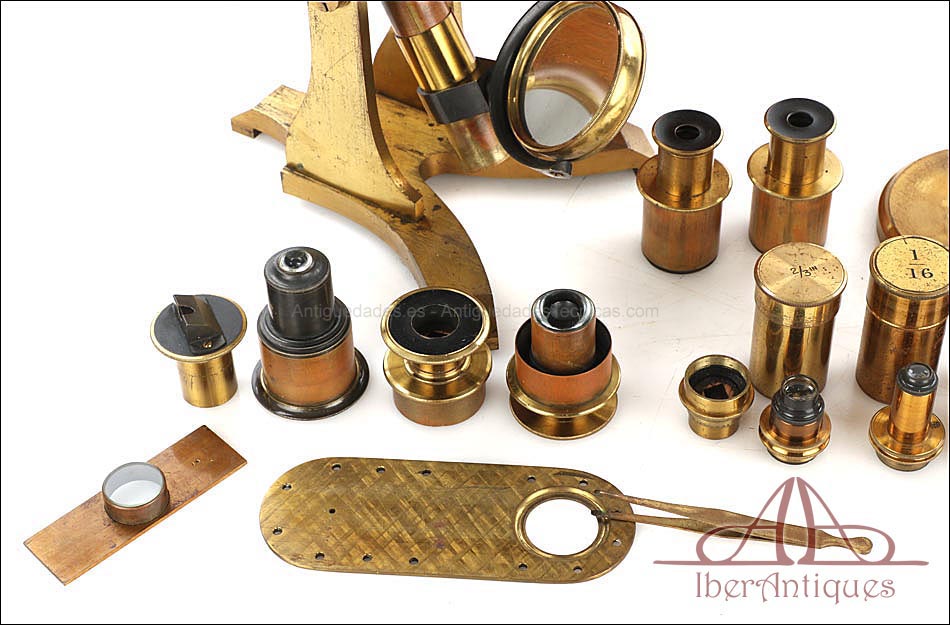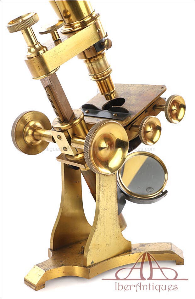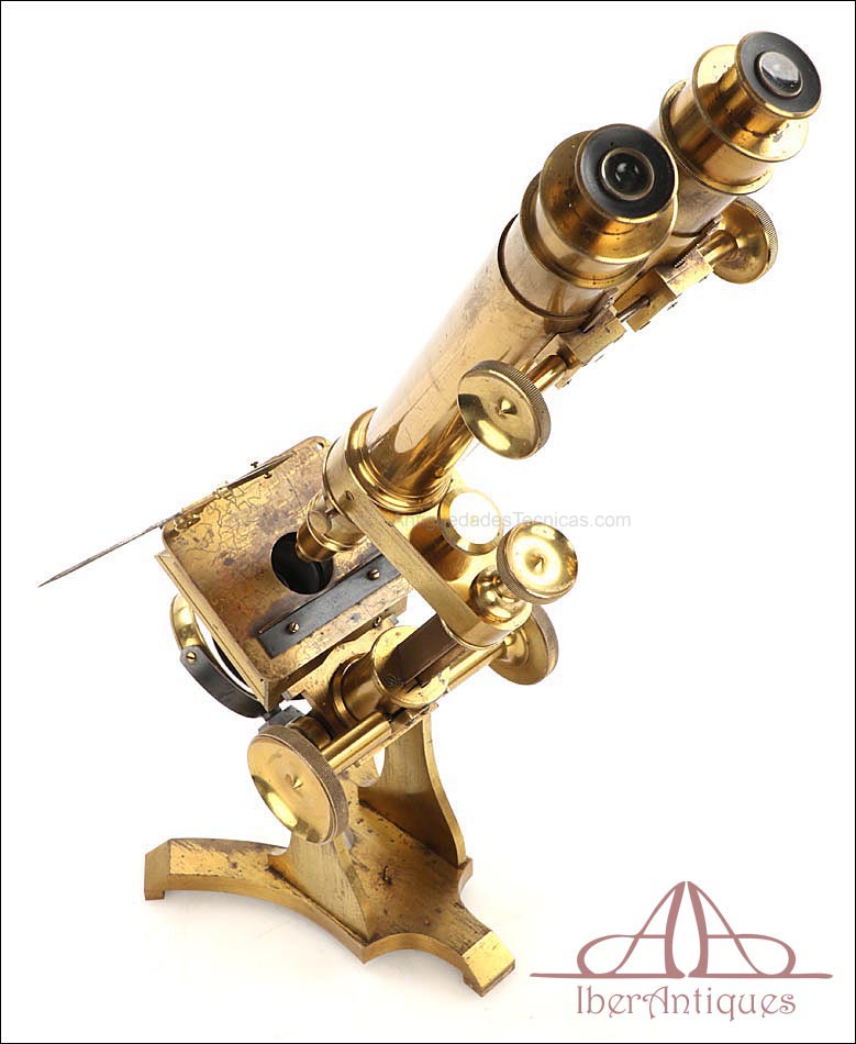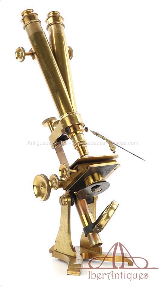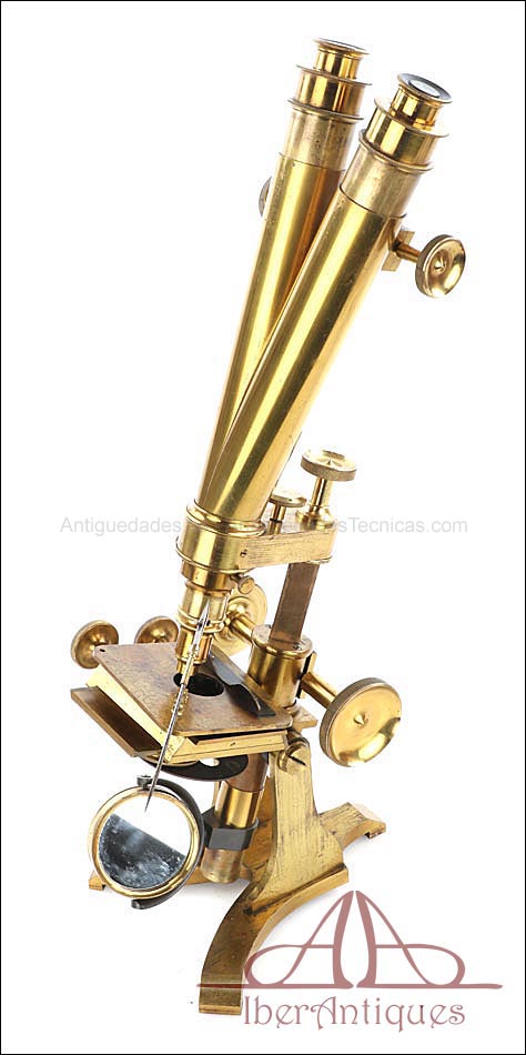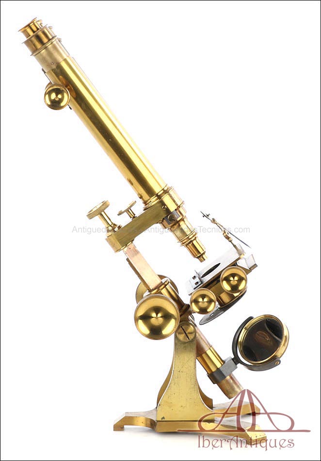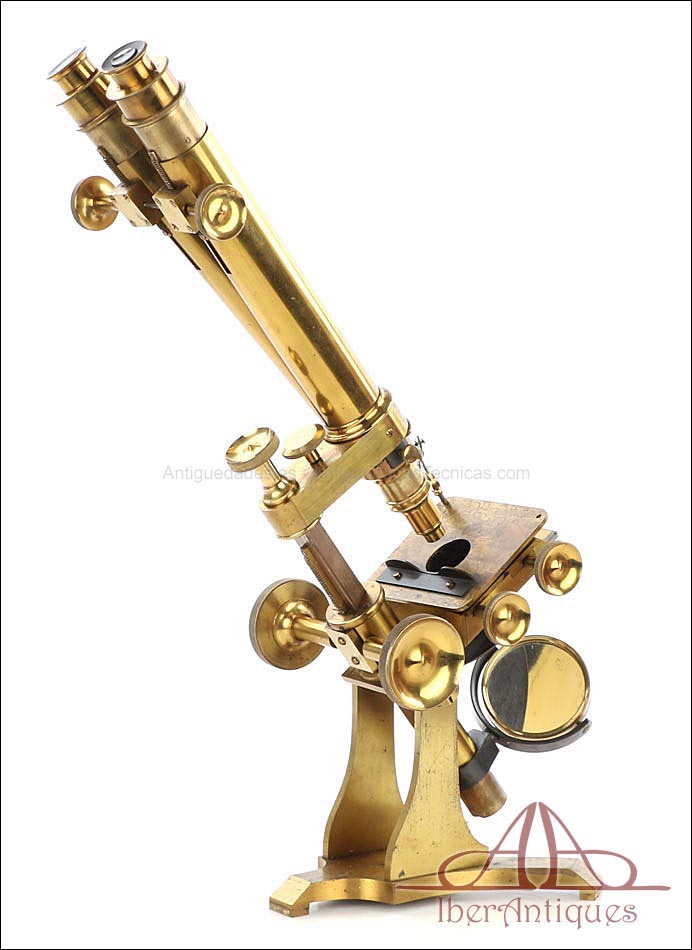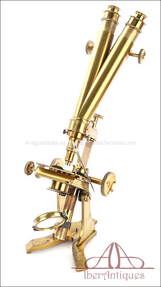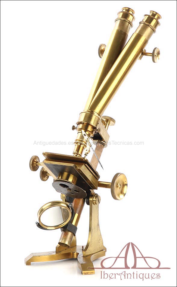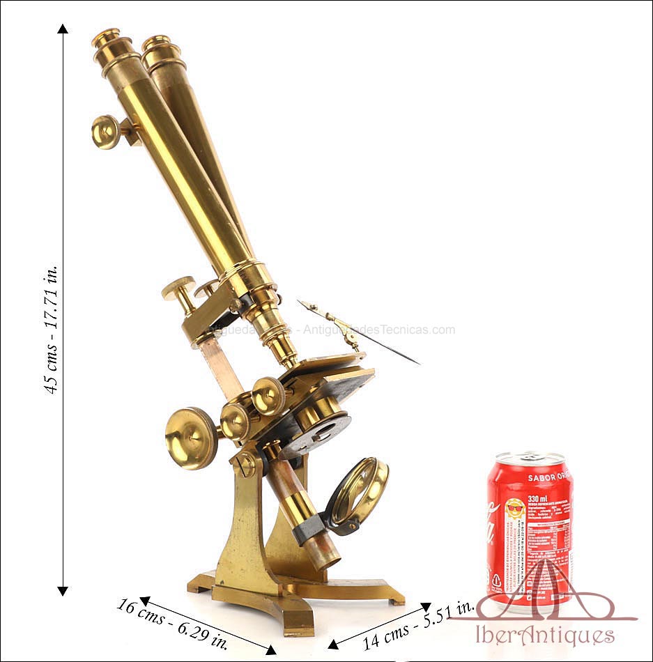 Extraordinario microscopio binocular antiguo súper completo, fabricado en Inglaterra circa 1880 y en excelente estado de conservación. Este instrumento destaca por su antigüedad (cerca de 150 años), su espectacular estética y su gran tamaño. Se presenta en su estuche original de madera de caoba, que conserva la cerradura pero no la llave, y va acompañado de gran número de accesorios de época en muy buenas condiciones. El microscopio es de latón, al igual que los accesorios; el metal conserva el barniz original, que le aporta una hermosa y cálida pátina. El prisma está en muy buen estado, al igual el espejo de doble cara (cóncavo y plano) y las cremalleras. Estas se deslizan con facilidad, permitiendo una fantástica experiencia para el usuario.