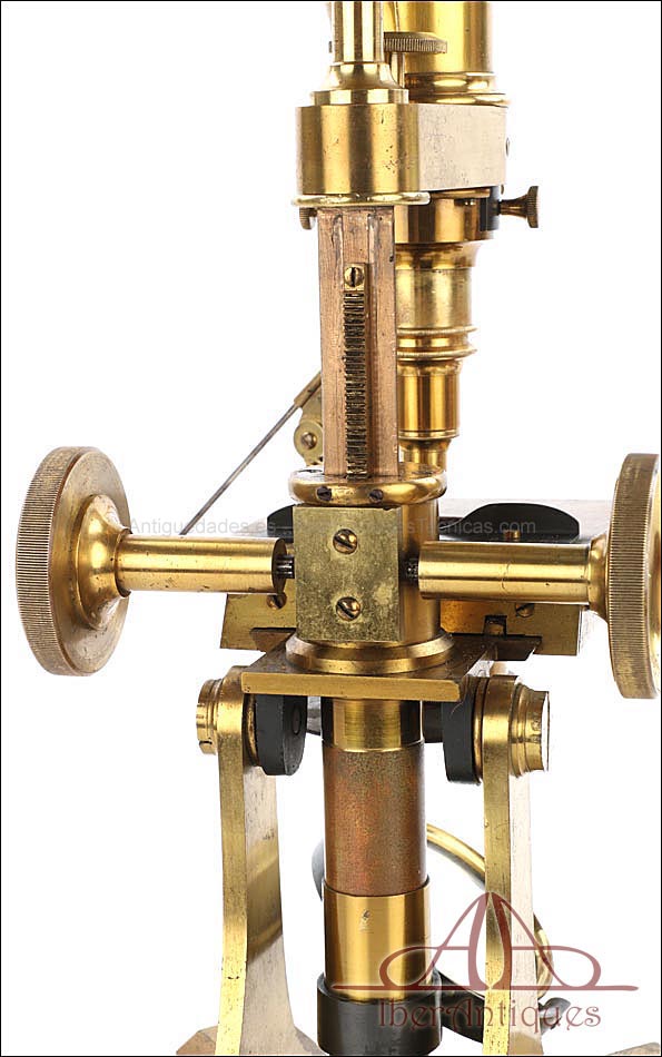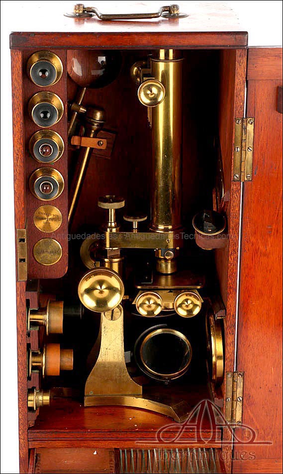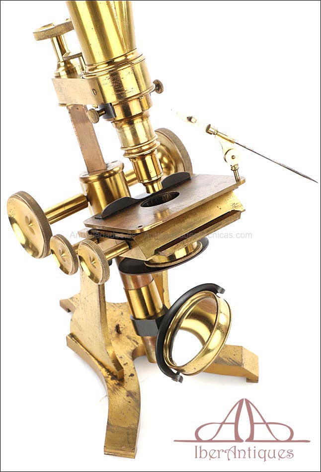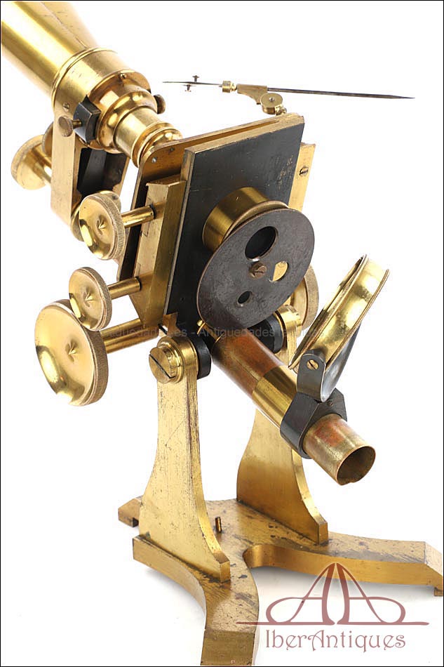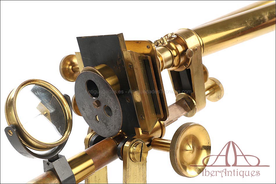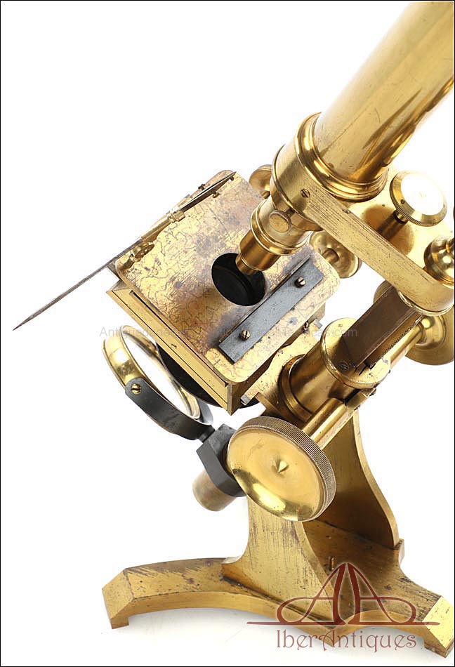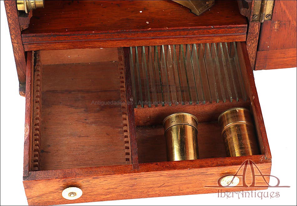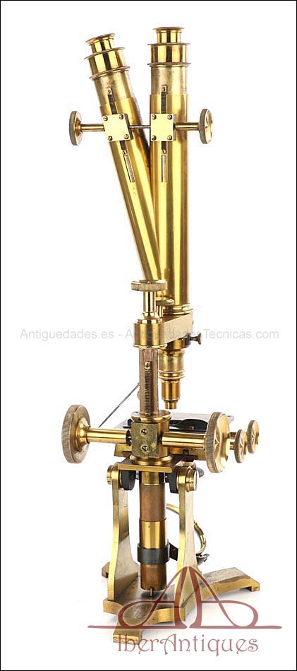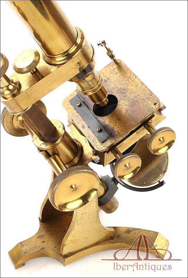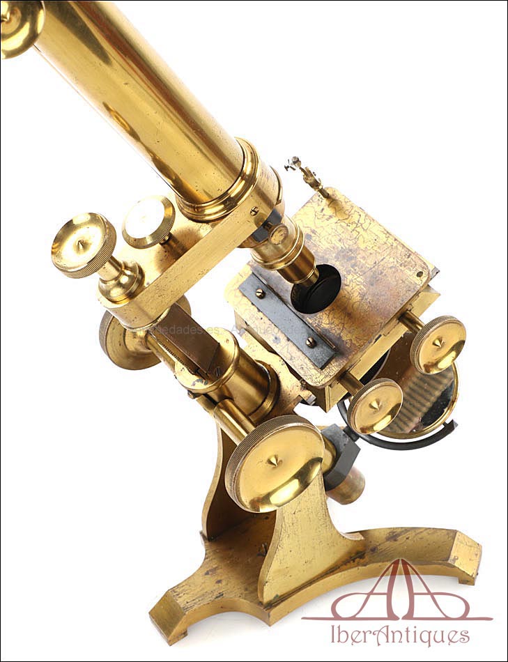 Extraordinario microscopio binocular antiguo súper completo, fabricado en Inglaterra circa 1880 y en excelente estado de conservación. Este instrumento destaca por su antigüedad (cerca de 150 años), su espectacular estética y su gran tamaño. Se presenta en su estuche original de madera de caoba, que conserva la cerradura pero no la llave, y va acompañado de gran número de accesorios de época en muy buenas condiciones. El microscopio es de latón, al igual que los accesorios; el metal conserva el barniz original, que le aporta una hermosa y cálida pátina. El prisma está en muy buen estado, al igual el espejo de doble cara (cóncavo y plano) y las cremalleras. Estas se deslizan con facilidad, permitiendo una fantástica experiencia para el usuario.