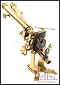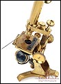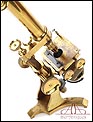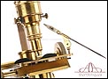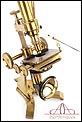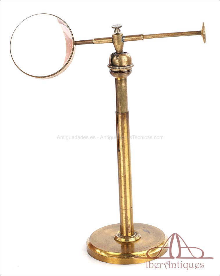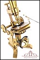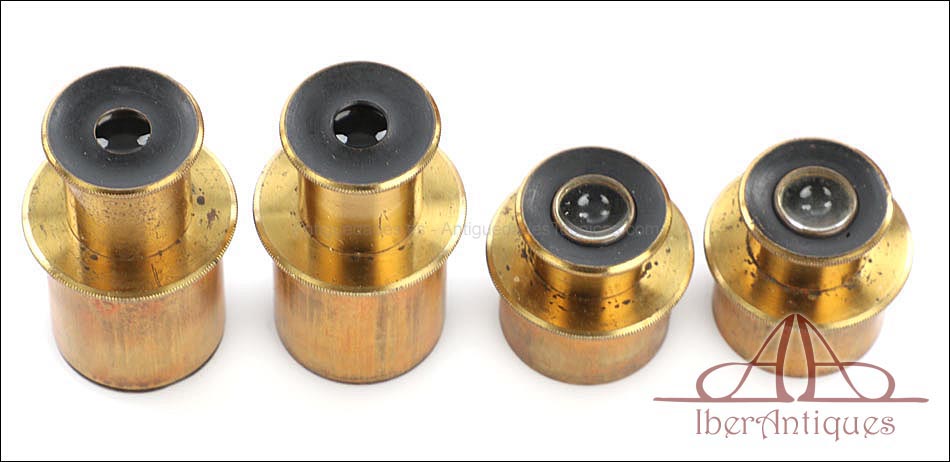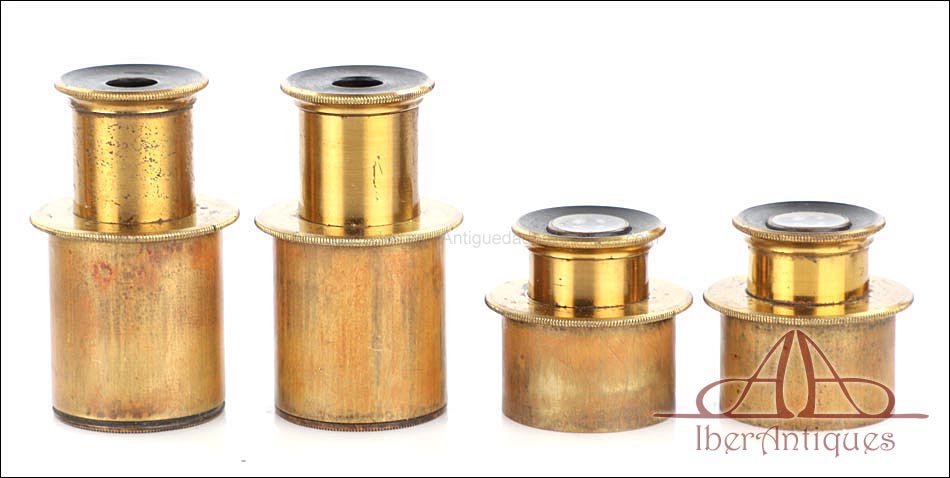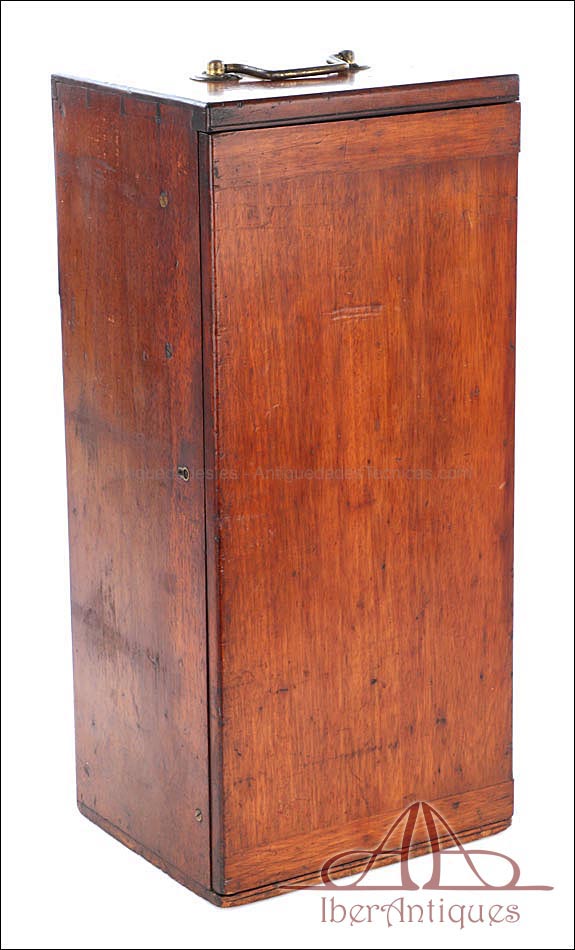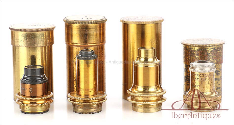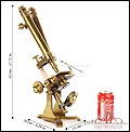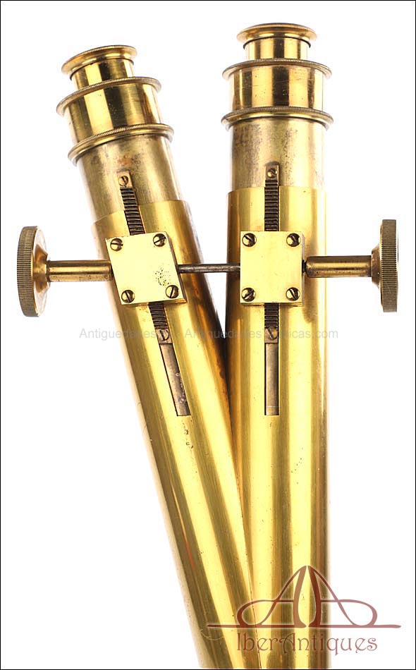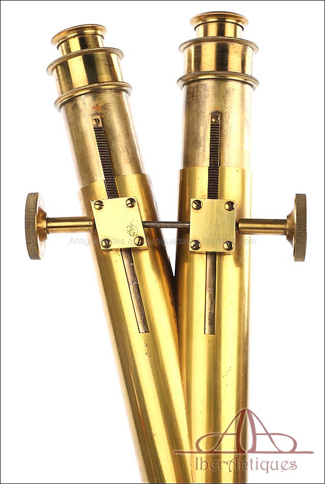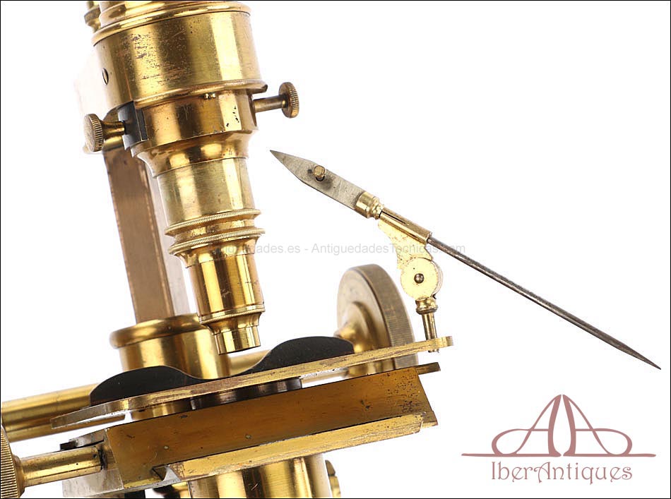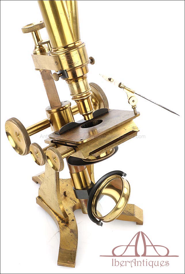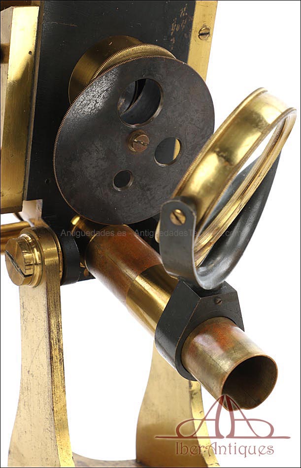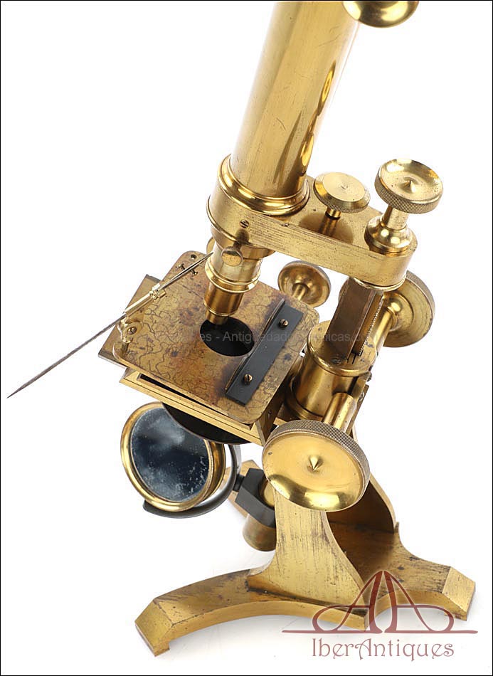 Extraordinario microscopio binocular antiguo súper completo, fabricado en Inglaterra circa 1880 y en excelente estado de conservación. Este instrumento destaca por su antigüedad (cerca de 150 años), su espectacular estética y su gran tamaño. Se presenta en su estuche original de madera de caoba, que conserva la cerradura pero no la llave, y va acompañado de gran número de accesorios de época en muy buenas condiciones. El microscopio es de latón, al igual que los accesorios; el metal conserva el barniz original, que le aporta una hermosa y cálida pátina. El prisma está en muy buen estado, al igual el espejo de doble cara (cóncavo y plano) y las cremalleras. Estas se deslizan con facilidad, permitiendo una fantástica experiencia para el usuario.