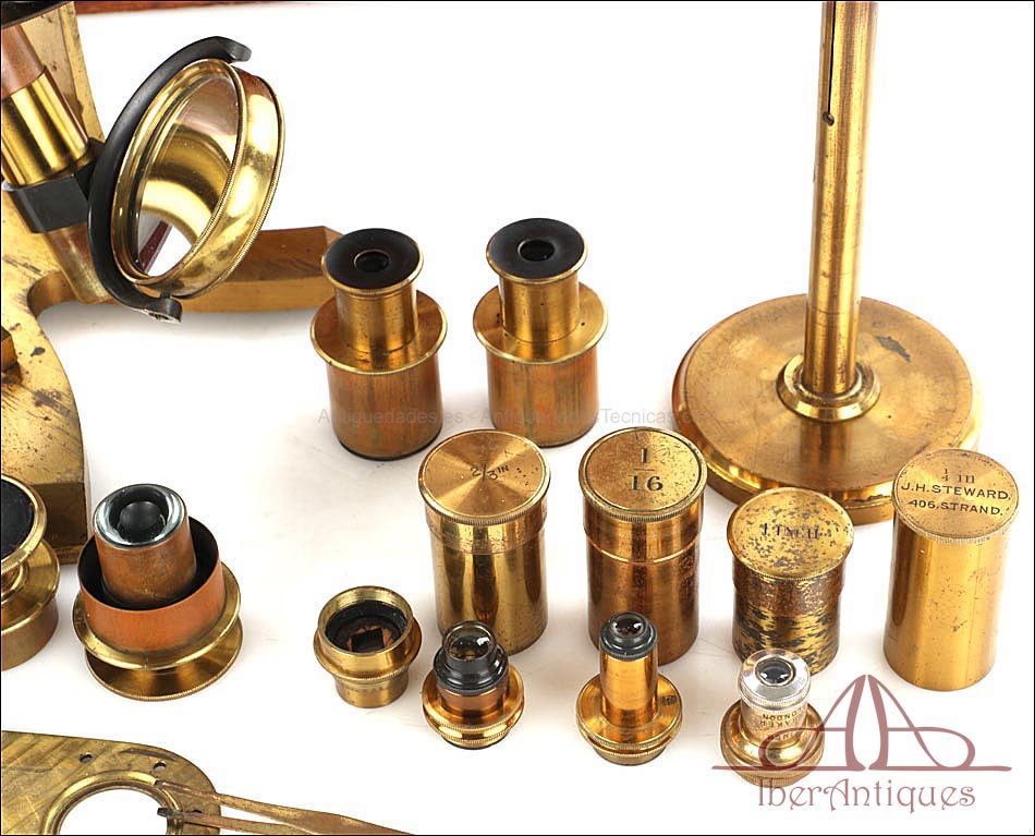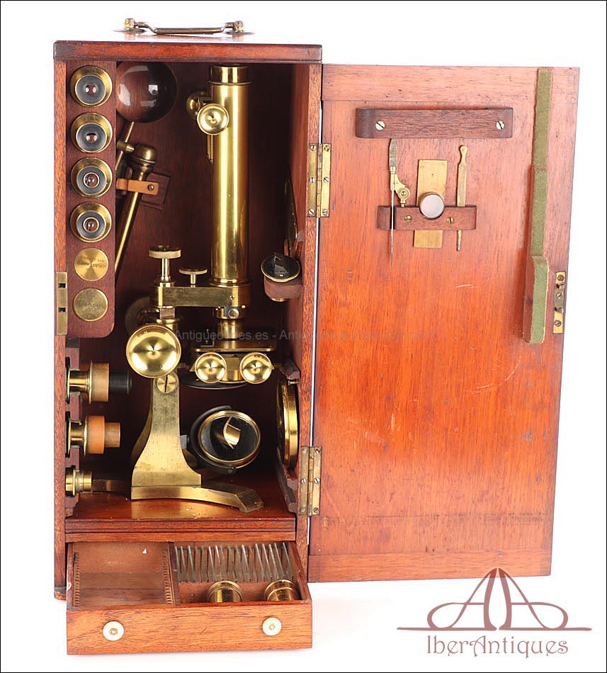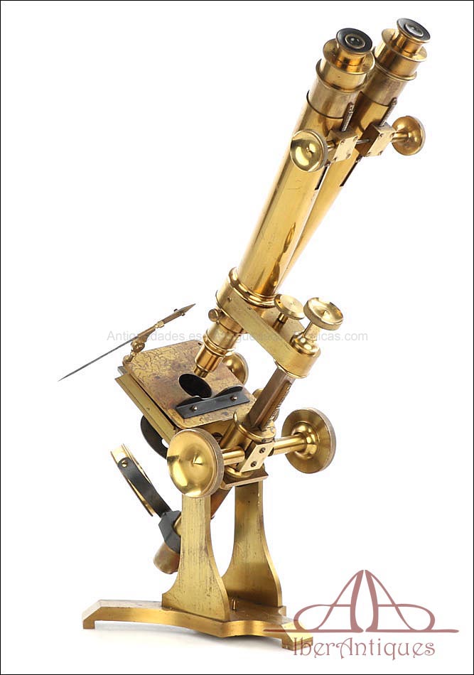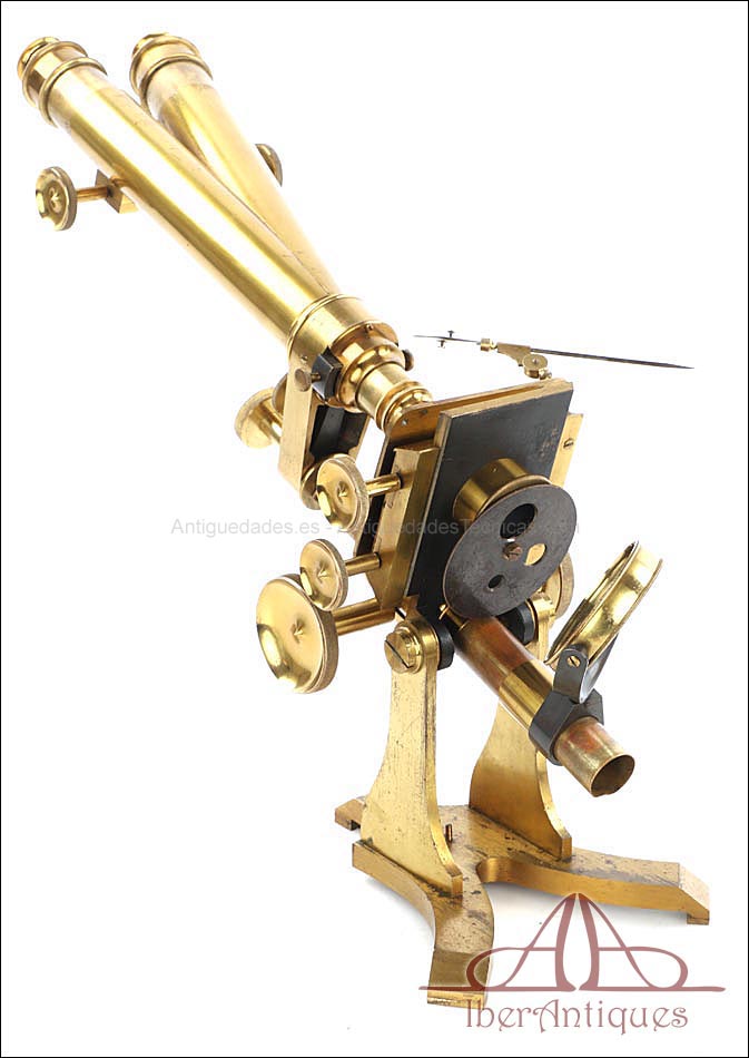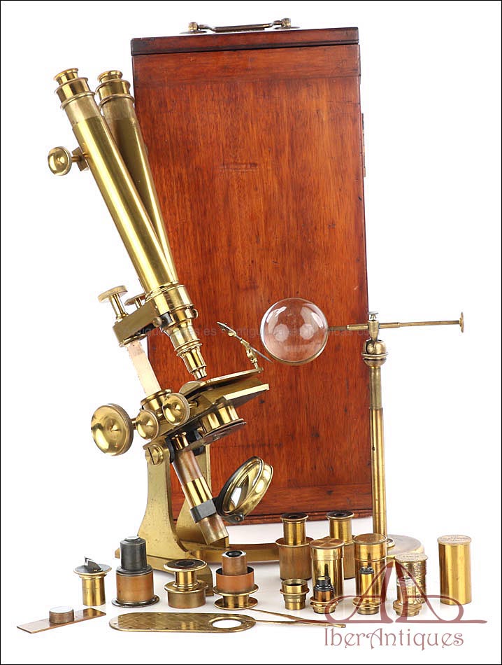 Extraordinario Microscopio Binocular Antiguo. Súper Completo. Inglaterra, Circa 1880 |