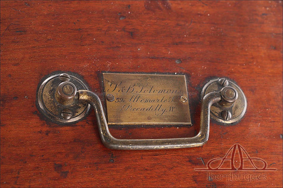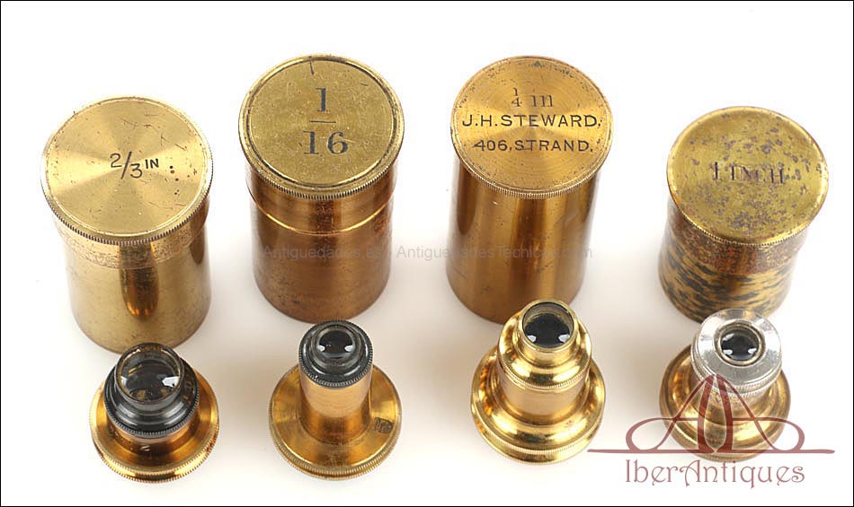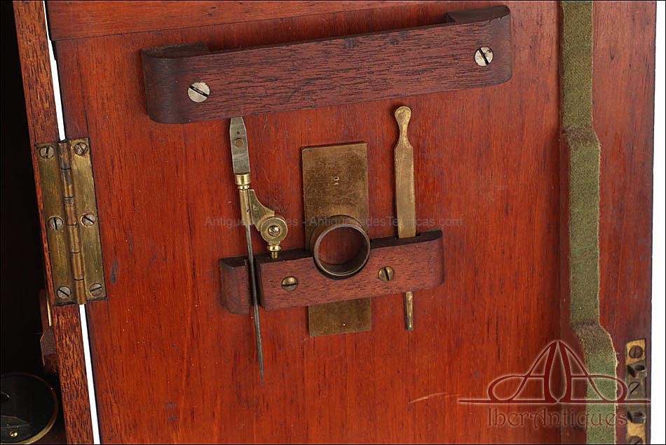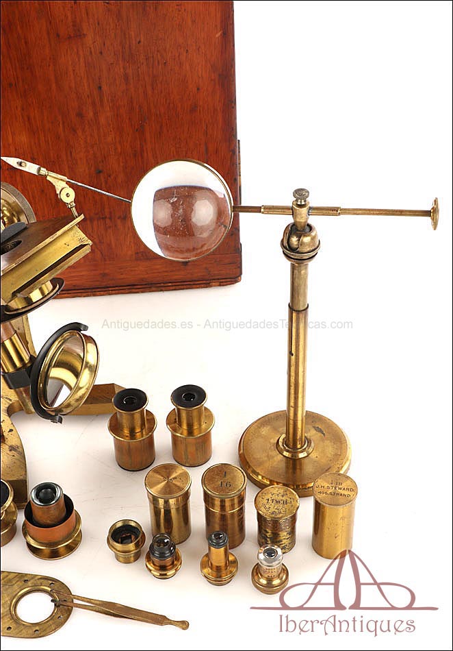 Los accesorios que acompañan al microscopio incluyen 2 juegos de oculares, 4 objetivos, una lente de concentración tipo ‘bull’s eye’, una live box para observar especímenes vivos, pinzas y pletinas de cristal para la preparación de muestras, además de otros accesorios. Uno de los estuches de los objetivos lleva grabado el nombre del fabricante inglés H. STEWARD. El microscopio incorpora también una pletina mecánica para poder mover las placas sin tener que tocarlas con los dedos, con precisión milimétrica. En cuanto al estuche, está fabricado en madera de caoba maciza y se conserva en muy buenas condiciones. Lleva asa superior, cajón interior con dos tiradores, soportes para los accesorios y una placa con el nombre del distribuidor en Inglaterra, J. & B. Solomons de Londres.