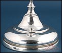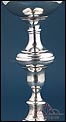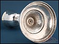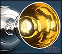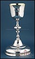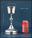 El diseño del cáliz es sobrio, contenido y de gran equilibrio visual. Se alza sobre una base circular con suaves molduras, que da paso a un tallo torneado con varios nudos, aportando ritmo y verticalidad al conjunto. La copa, completamente lisa, destaca por su perfil limpio, ligeramente acampanado y con el interior dorado, como corresponde a las piezas destinadas al uso litúrgico. El dorado interior resplandece con un tono cálido y profundo que contrasta maravillosamente con el exterior pulido en plata brillante.