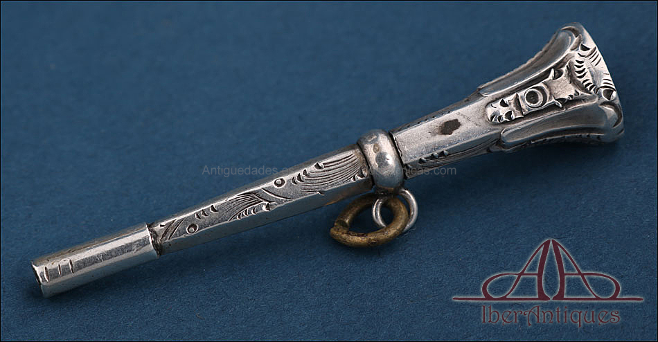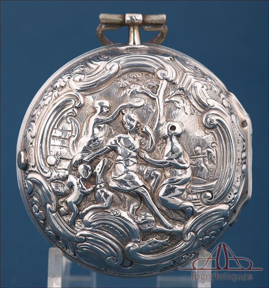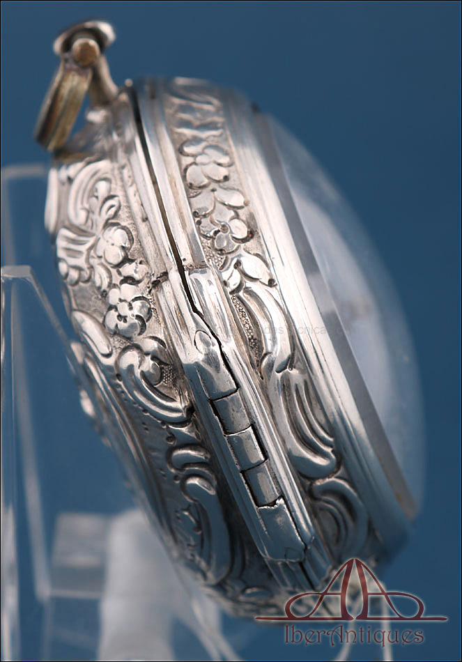 Excepcional reloj de bolsillo catalino antiguo con dos cajas y llave de plata, fabricado por J. Richards en Londres en 1785. Se trata de una pieza con más de doscientos años de historia, que ha llegado a nosotros en buenas condiciones y funcionando. La caja exterior lleva decoración repujada; en la tapa posterior podemos ver una escena campestre donde se representa una especie de celebración. En el centro, una mujer joven es coronada por una figura mientras otra se arrodilla frente a ella; a la izquierda, abajo, un niño juega con un perro. La caja interior lleva esfera blanca con números romanos negros y agujas ‘poire’ en metal azul cobalto. El interior de la tapa trasera lleva varios contrastes, entre ellos el de Londres de 1785. La hermosa y compleja maquinaria, muy bien conservada, está firmada a mano con el nombre y la dirección del taller del relojero: J. Richards, No. 810, London. El reloj va acompañado de su llave original, una preciosa pieza de plata antigua con decoración grabada a mano.
