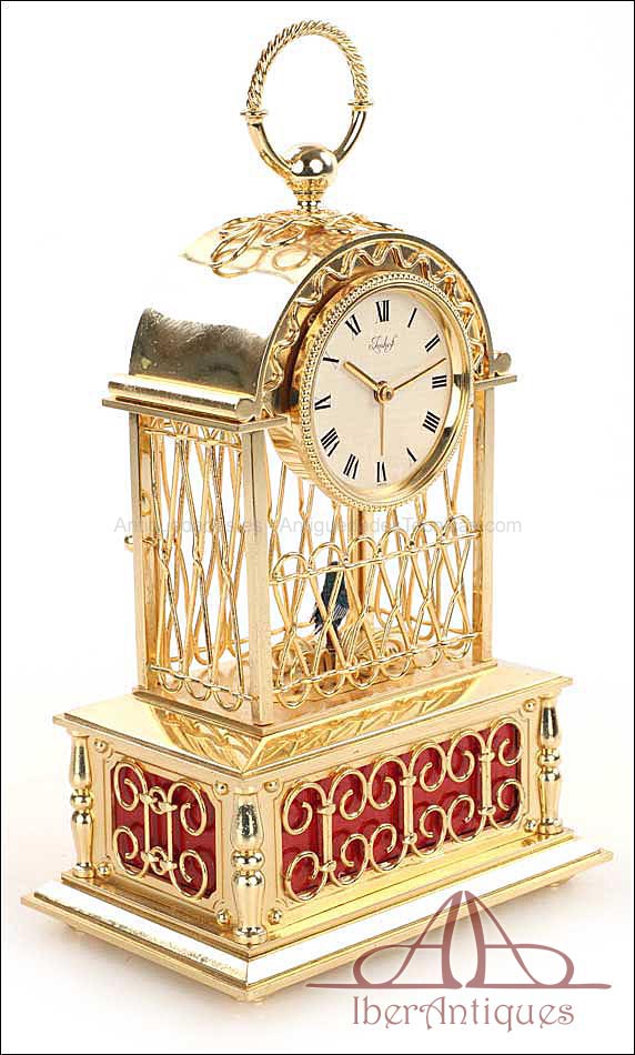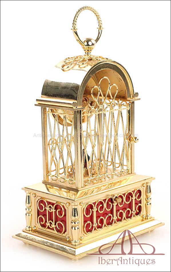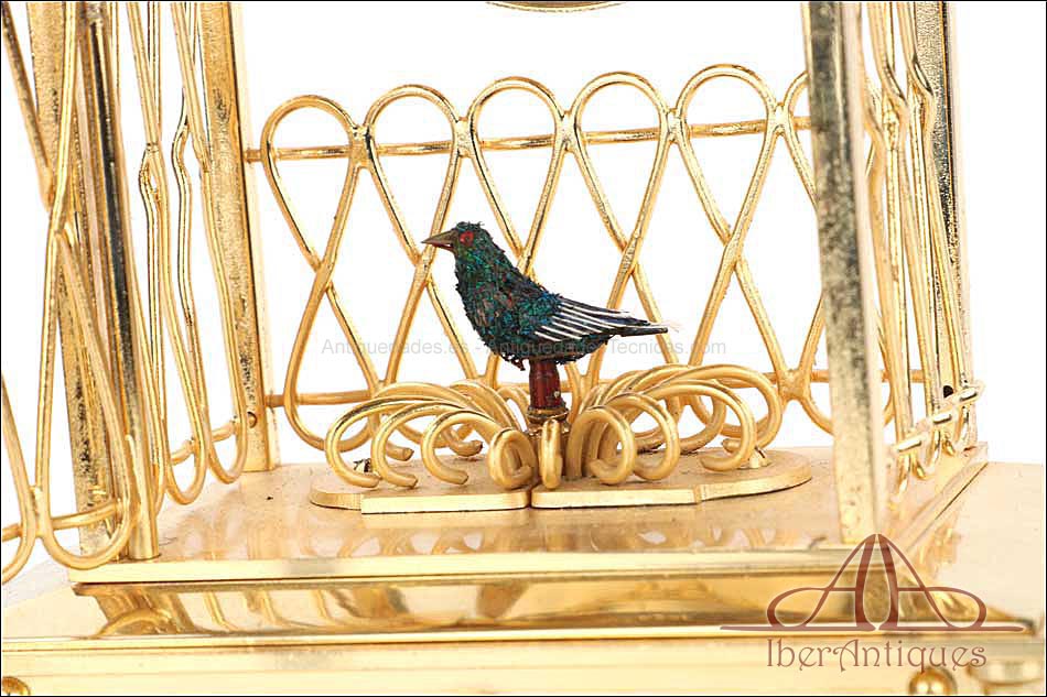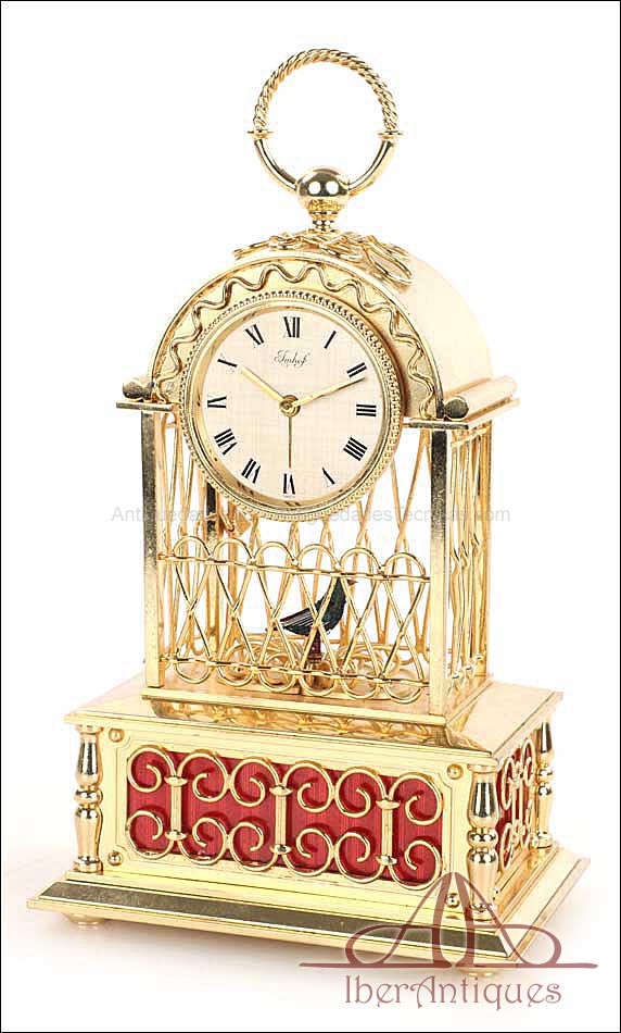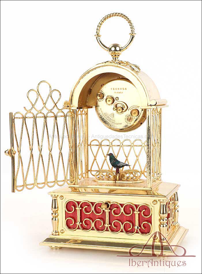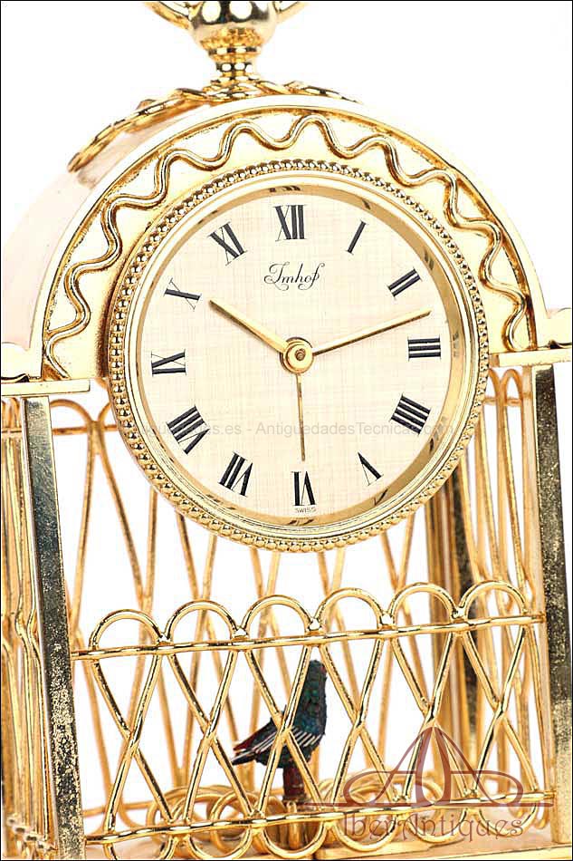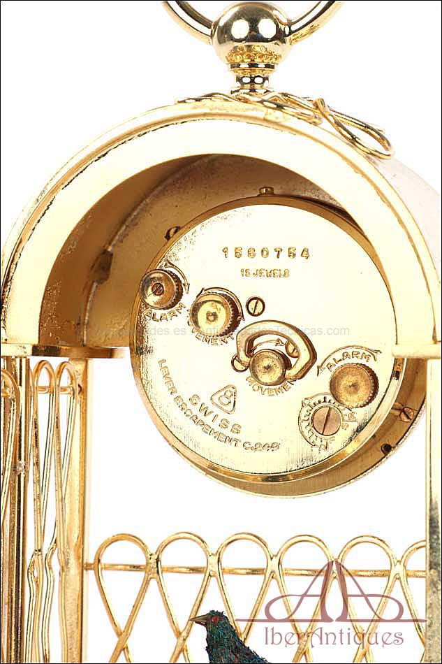 Raro reloj de sobremesa Imhof con pájaro cantor autómata, fabricado en Suiza en los años 60 y en excelente estado de conservación. Se trata de una pieza exclusiva y poco convencional, de extrema delicadeza y un encanto fuera de lo común. El reloj está chapado en oro y tiene forma de jaula, con la parte superior curva y una base rectangular y amplia. La esfera y el mecanismo se encuentran en la parte superior; bajo el reloj se halla el pájaro autómata, con mecanismo propio e independiente situado en el interior de la base. Cuando se le da cuerda (en la base) y se presiona el botón trasero, el pájaro se mueve a izquierda y a derecha, abre el pico, agita las alas y canta. Por su parte, el reloj está firmado por la casa suiza Imhof impreso en la posición de las 12, números romanos negros, agujas doradas y función de alarma. En su parte posterior vemos el número de serie 1560754. Bajo la base podemos ver otro número de serie, 70387, y una rejilla que deja salir el canto del pájaro autómata.