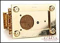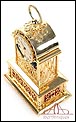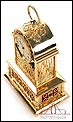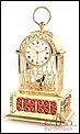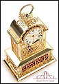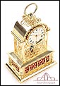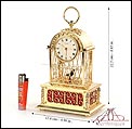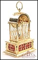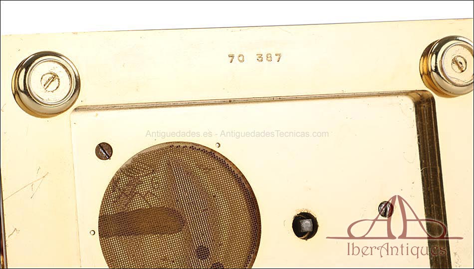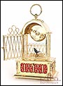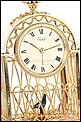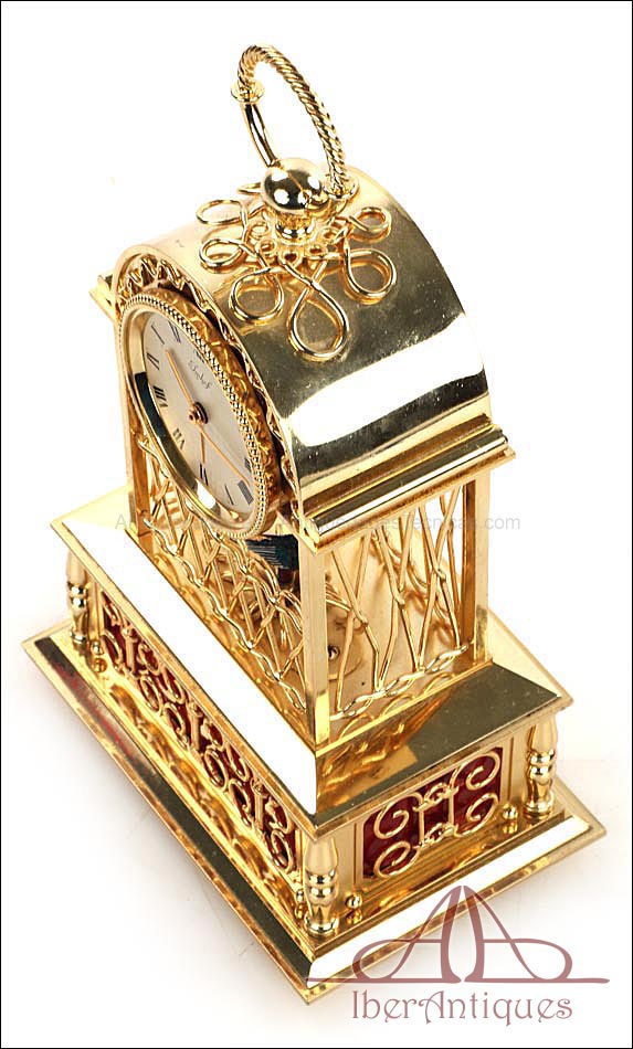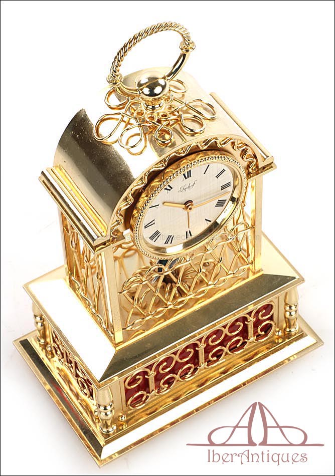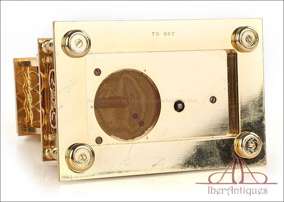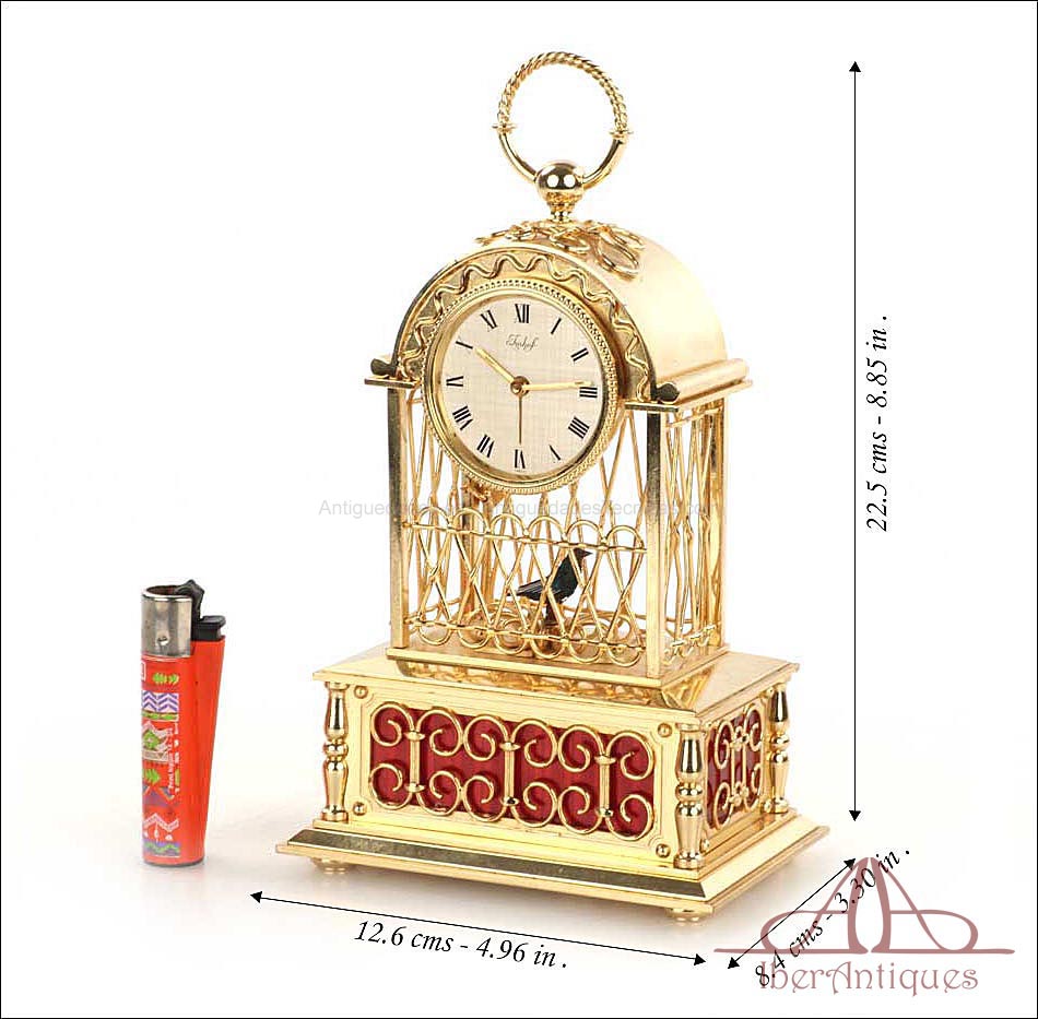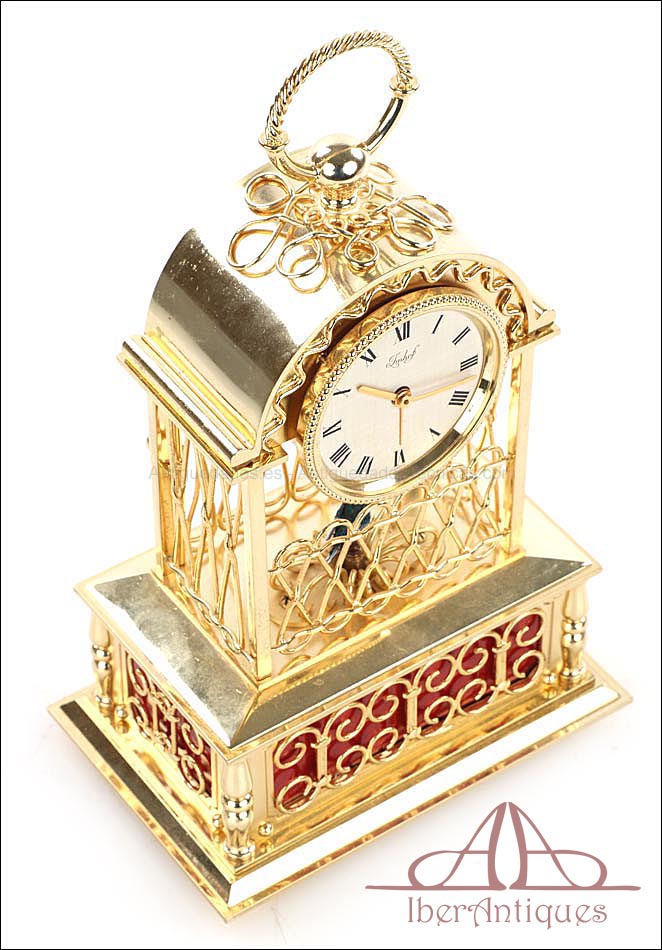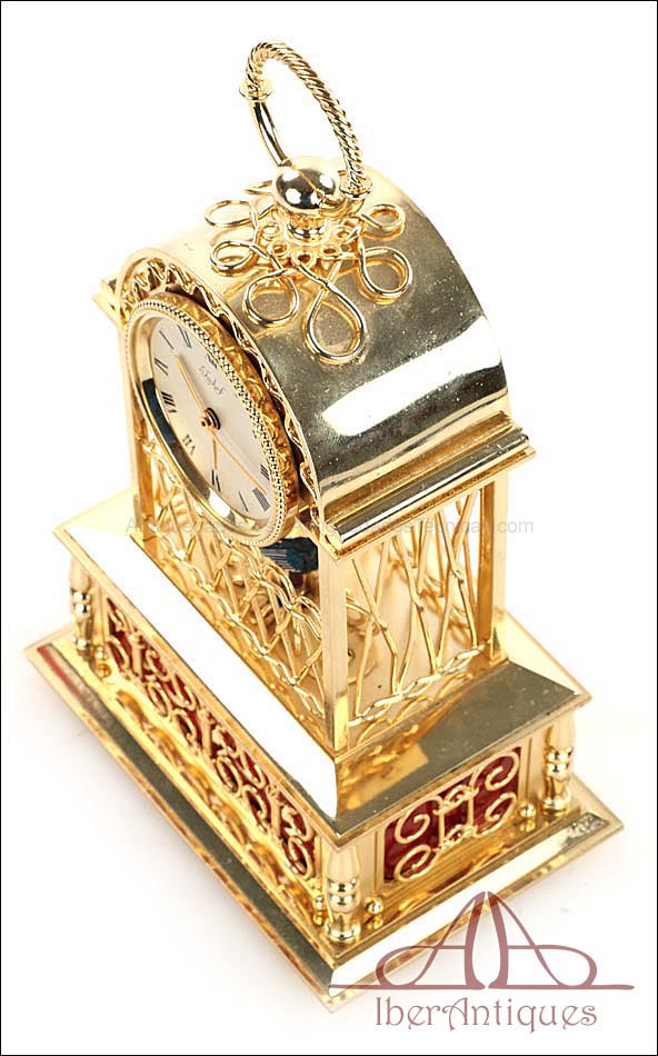 Raro reloj de sobremesa Imhof con pájaro cantor autómata, fabricado en Suiza en los años 60 y en excelente estado de conservación. Se trata de una pieza exclusiva y poco convencional, de extrema delicadeza y un encanto fuera de lo común. El reloj está chapado en oro y tiene forma de jaula, con la parte superior curva y una base rectangular y amplia. La esfera y el mecanismo se encuentran en la parte superior; bajo el reloj se halla el pájaro autómata, con mecanismo propio e independiente situado en el interior de la base. Cuando se le da cuerda (en la base) y se presiona el botón trasero, el pájaro se mueve a izquierda y a derecha, abre el pico, agita las alas y canta. Por su parte, el reloj está firmado por la casa suiza Imhof impreso en la posición de las 12, números romanos negros, agujas doradas y función de alarma. En su parte posterior vemos el número de serie 1560754. Bajo la base podemos ver otro número de serie, 70387, y una rejilla que deja salir el canto del pájaro autómata.
