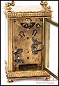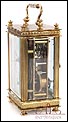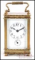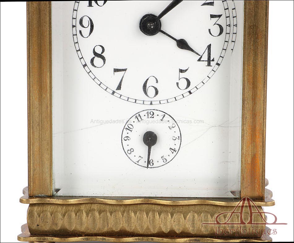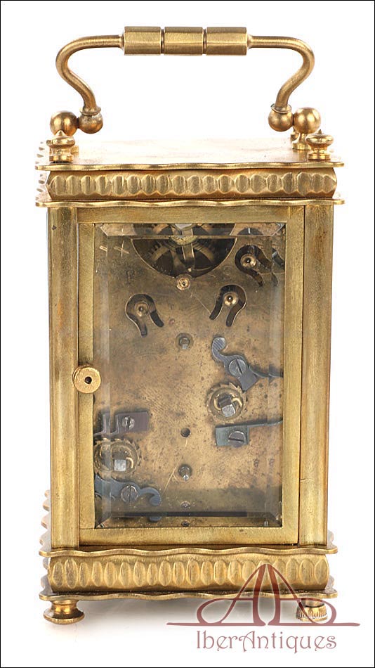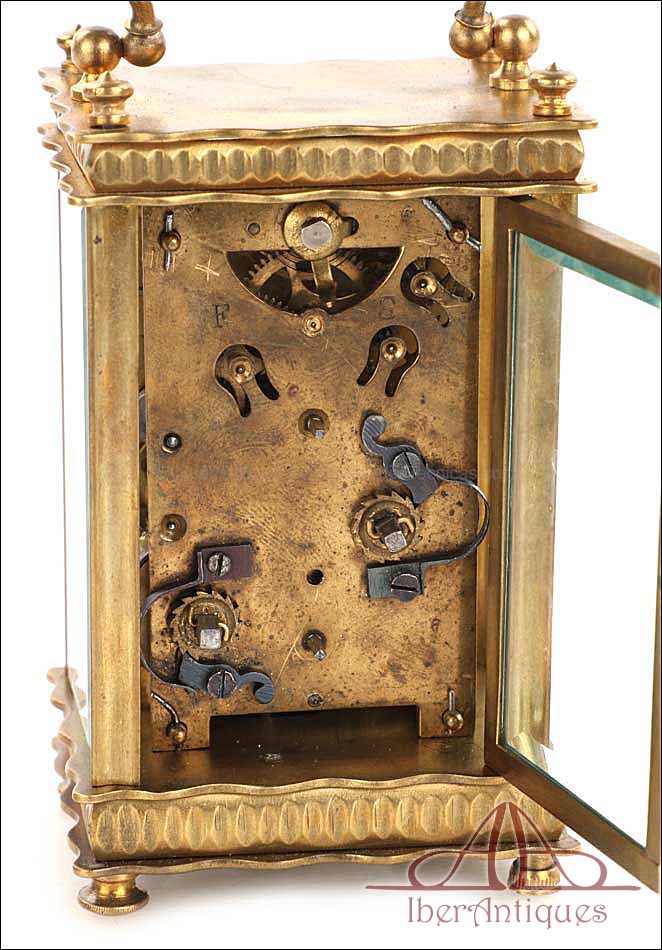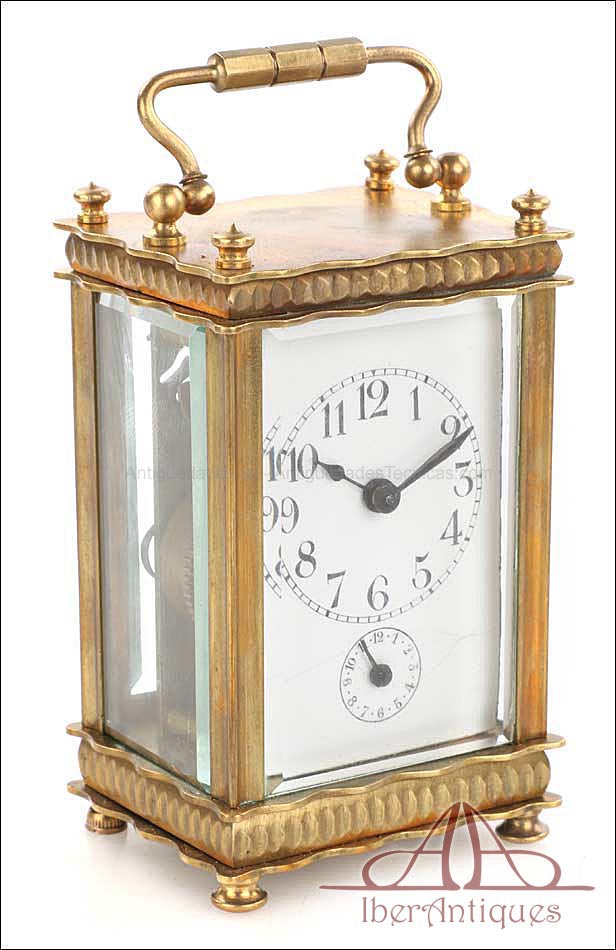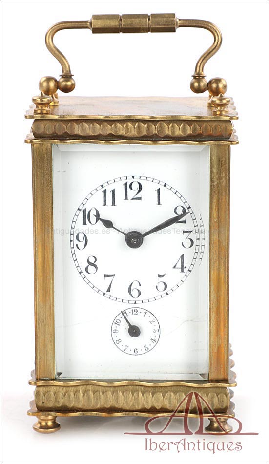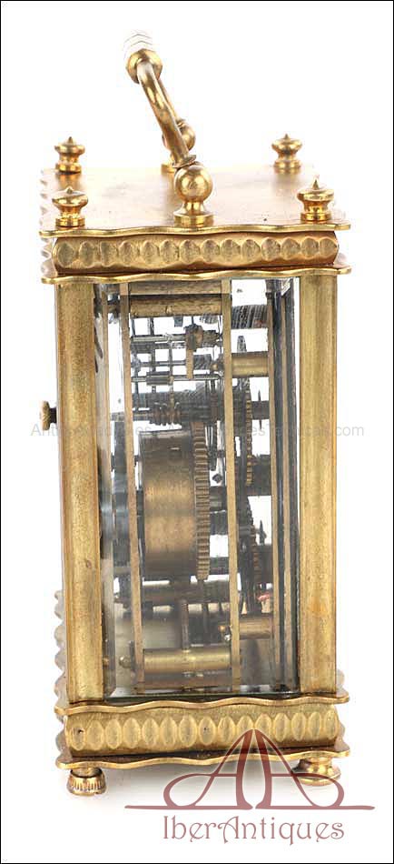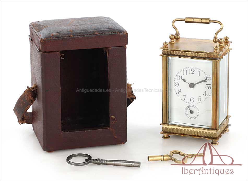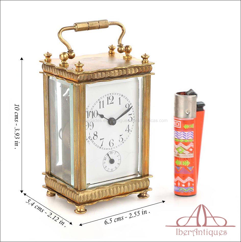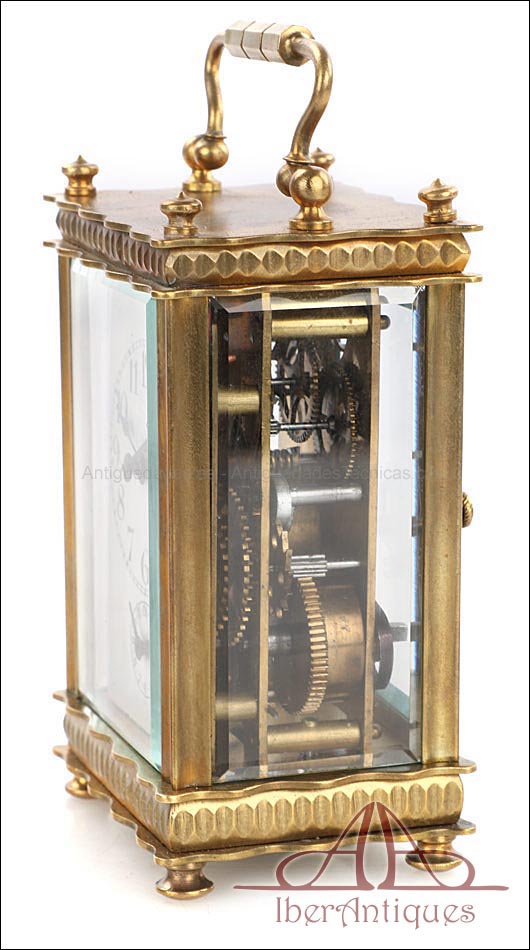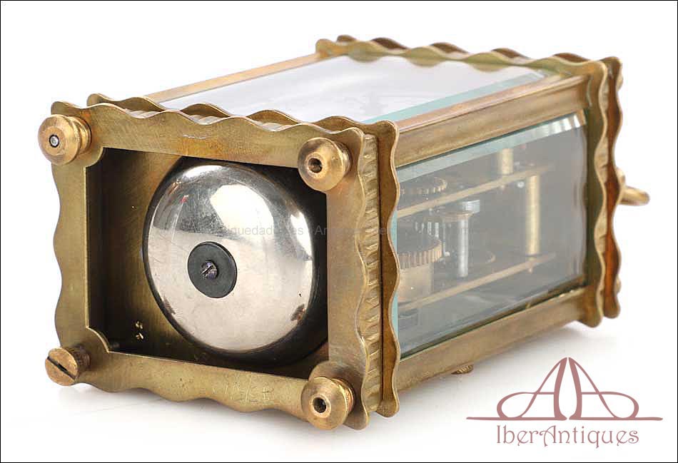 Este exquisito reloj de carruaje, también conocido como reloj de oficial, es una auténtica joya de la relojería francesa del siglo XIX. Procedente de Francia y conservado en un estado notable tanto en funcionamiento como en estética, este reloj combina la funcionalidad con la elegancia de la época. Su caja rectangular está realizada en latón con un hermoso acabado patinado por el tiempo, coronada por un asa superior articulada que evoca su uso original en viajes y desplazamientos. Las paredes, de cristal biselado en sus cuatro lados, permiten admirar el fino mecanismo interior, completamente visible desde el lateral.