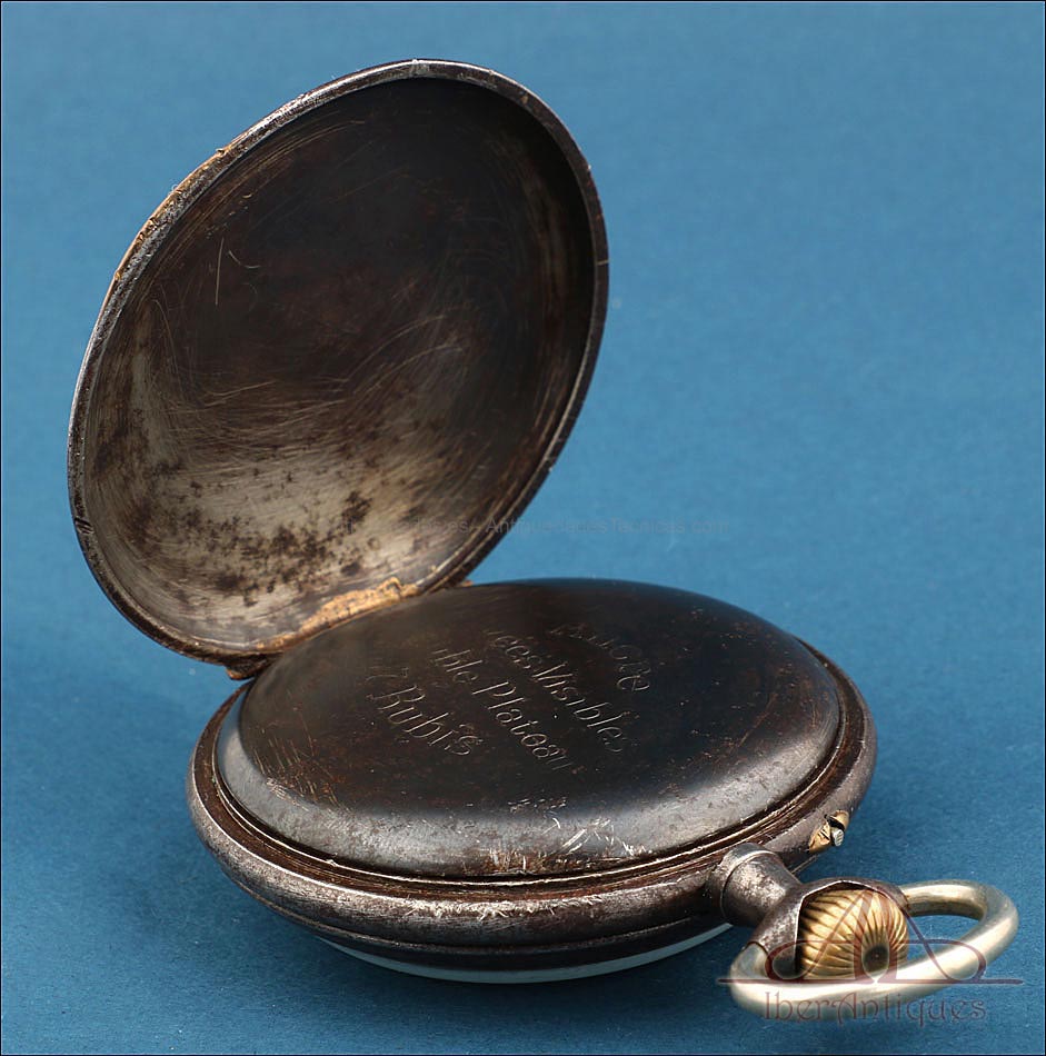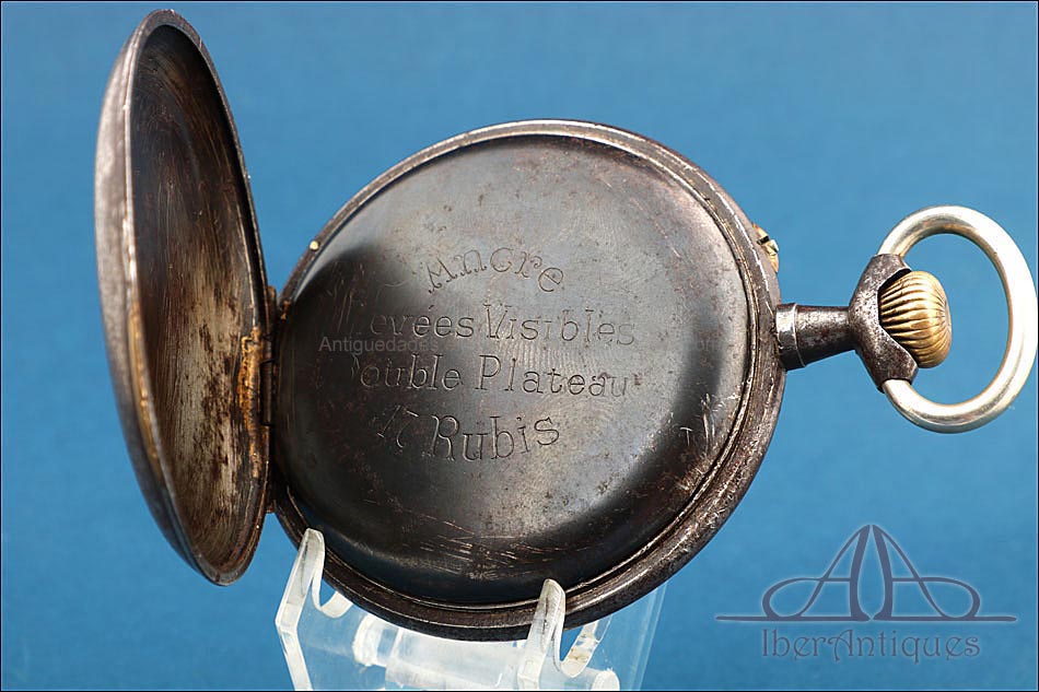 La tapa trasera se abre para descubrir una maquinaria visible a través de su segundo fondo protector. La inscripción grabada en su interior nos revela que cuenta con escape de áncora, doble platina y un movimiento de 17 rubíes, lo cual indica una calidad mecánica considerable. A pesar del paso del tiempo, el reloj permanece en funcionamiento, detalle que suma atractivo tanto para coleccionistas como para aficionados a la relojería antigua.