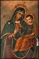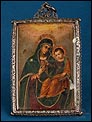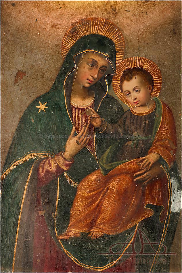 La imagen de la Virgen con el Niño refleja el estilo Eleousa o "Madonna de la Ternura", en donde el gesto amoroso entre Madre e Hijo transmite una dulzura y melancolía que conmueve. Los rostros ovalados, los pliegues dorados en el manto y las aureolas radiadas ejecutadas con pincel fino son características típicas de los talleres devocionales italianos populares de finales del siglo XVIII.