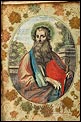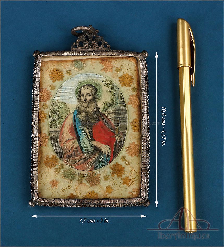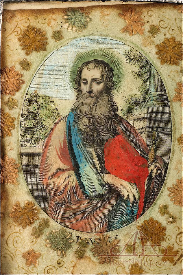 En el reverso encontramos un grabado antiguo, también de finales del siglo XVIII, que representa a San Pablo Apóstol, portando su tradicional espada y un rollo. Esta imagen está ricamente adornada con un fondo de hojas doradas, aplicadas manualmente sobre el papel, un detalle que embellece aún más su presentación y demuestra la dedicación artesanal.
