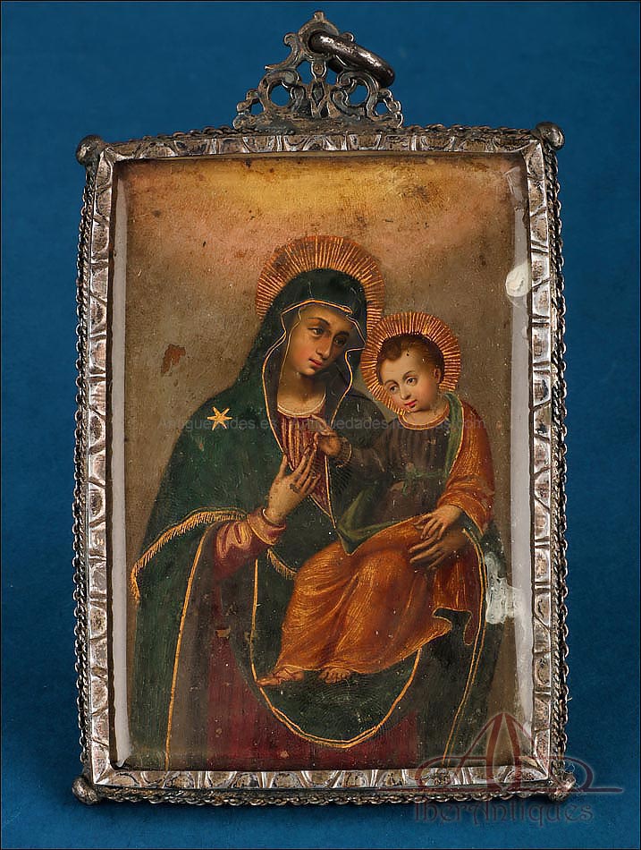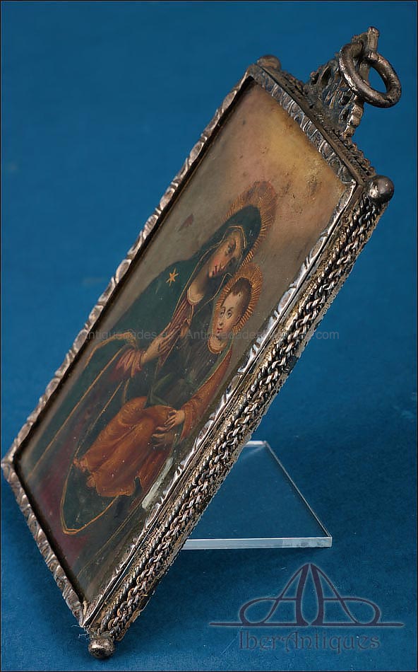 Este relicario pertenece a la tradición de los relicarios portátiles, surgidos con fuerza a finales de la Edad Media y el Renacimiento, impulsados por el fervor religioso y la práctica de las peregrinaciones. Su principal función era proteger y venerar reliquias, imágenes sagradas o fragmentos de objetos de culto. Durante los siglos XVII y XVIII, especialmente en Italia, los talleres devocionales elaboraron numerosos relicarios con marcos de metales nobles como la plata y cristal, destinados a albergar óleos, grabados o pequeños relicarios secundarios. Estas piezas se vendían en santuarios, iglesias importantes o ferias religiosas, y servían tanto para el uso litúrgico como doméstico. El norte de Italia, con centros artísticos activos en Emilia-Romaña y Lombardía, destacó particularmente en la producción de este tipo de arte sacro. El uso del óleo sobre tabla para representar a la Virgen, en combinación con grabados coloreados, otorgaba a estas piezas un carácter accesible pero profundamente devocional. Hoy en día, los relicarios antiguos bien conservados son muy valorados en el mercado del arte sacro, no solo por su estética, sino también por su enorme valor histórico y espiritual.
