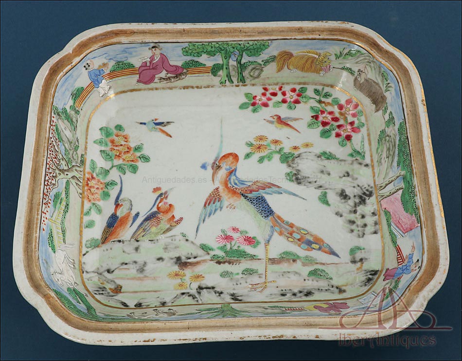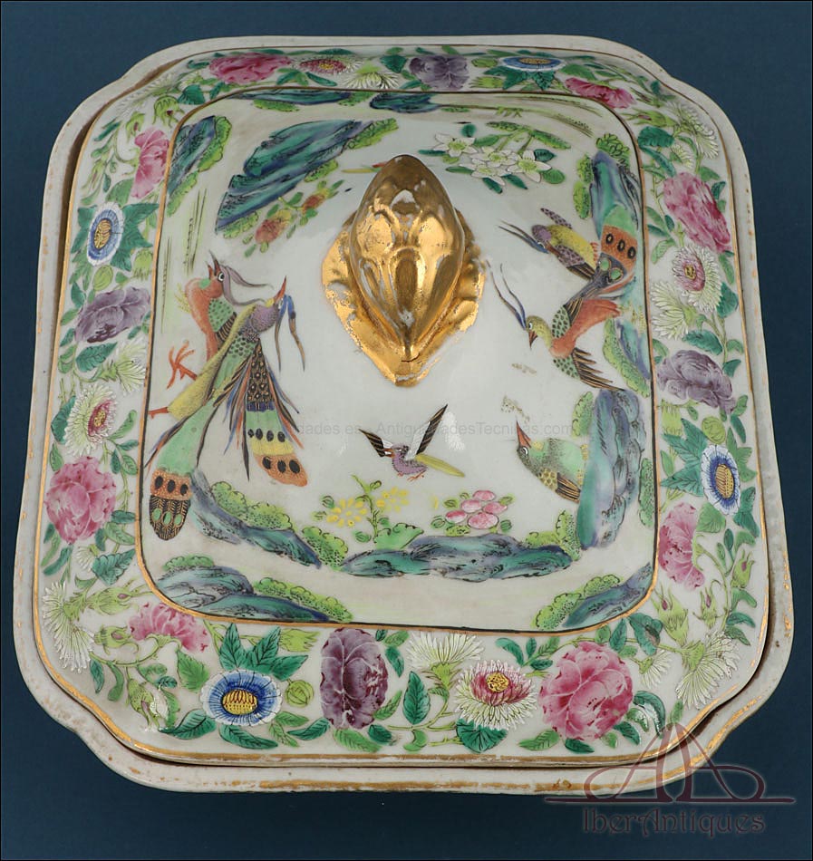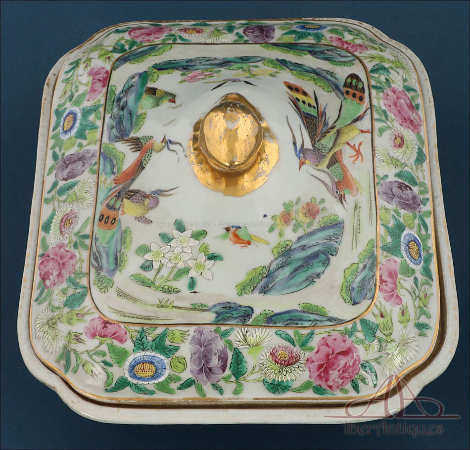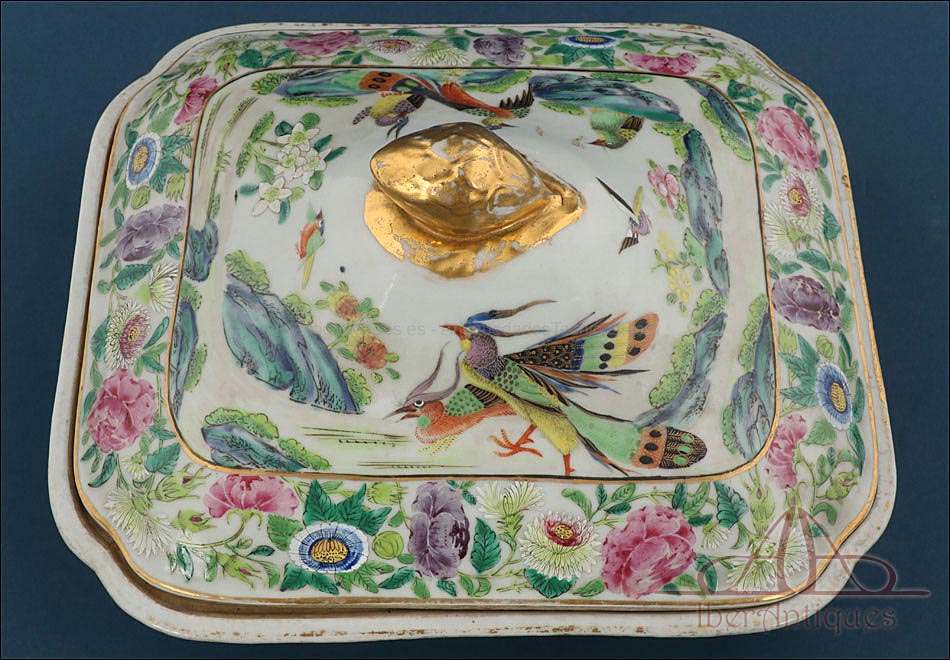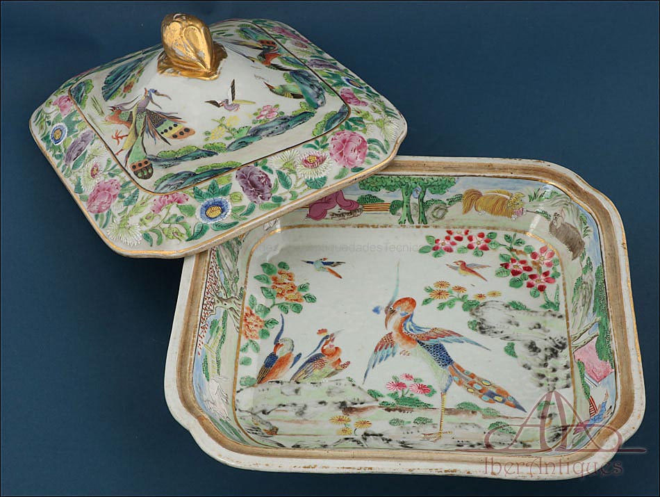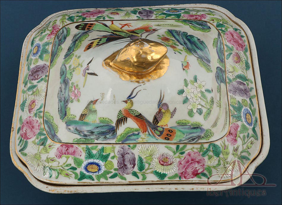 Esta espectacular fuente con tapa es una pieza de porcelana china antigua, realizada durante el siglo XIX, en pleno período Qing. Su forma rectangular y elegante, junto con su delicada decoración, la convierten en un objeto decorativo de gran belleza y rareza. Se trata de una pieza manufacturada con la clara intención de exportarla a Europa, motivo por el cual no presenta marcas de autor, algo habitual en muchas porcelanas chinas de este tipo. Su superficie está completamente pintada a mano con una profusión de motivos tradicionales: aves fénix de largo plumaje y vivos colores, vegetación exótica, flores abiertas y cerradas, rocas de formas sinuosas y pequeños grupos humanos que evocan escenas bucólicas y cortesanas propias del imaginario chino.