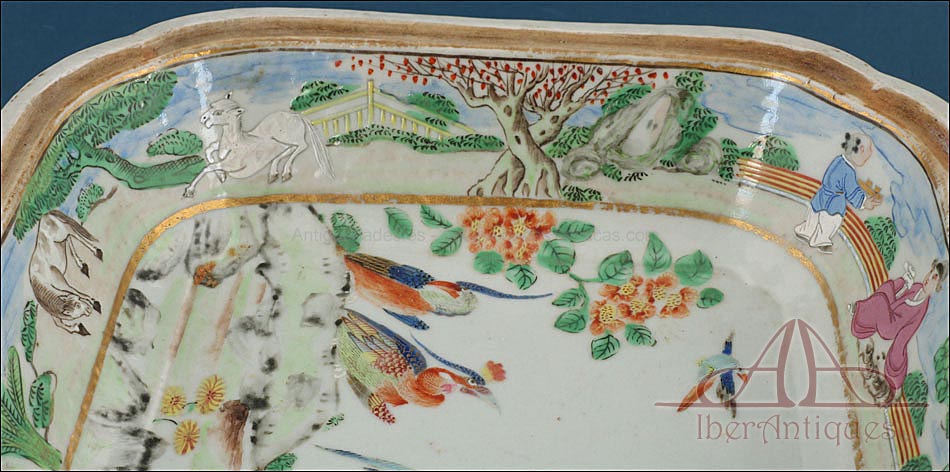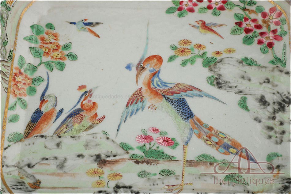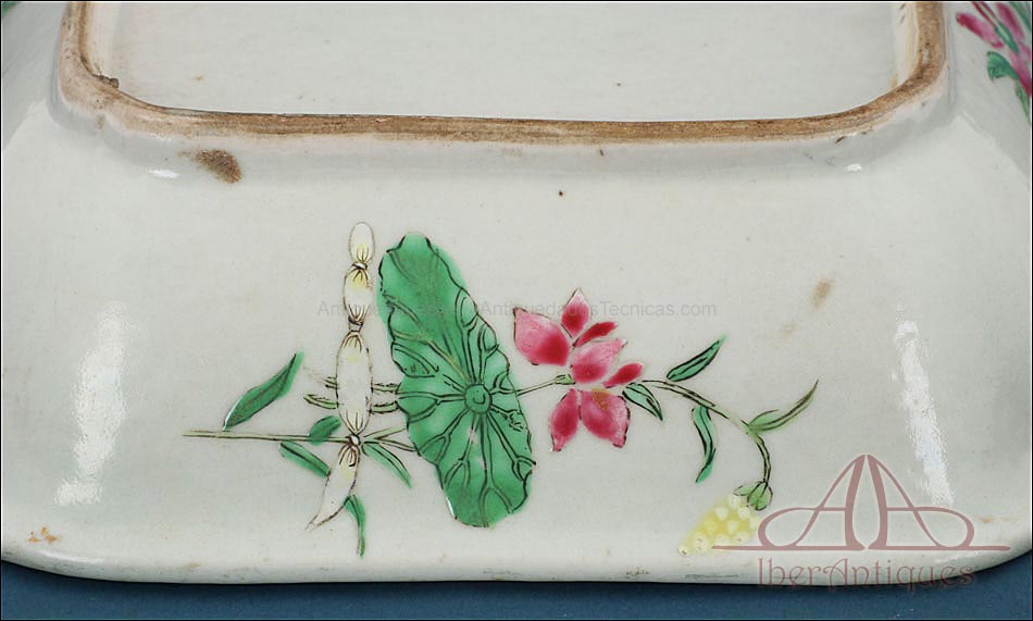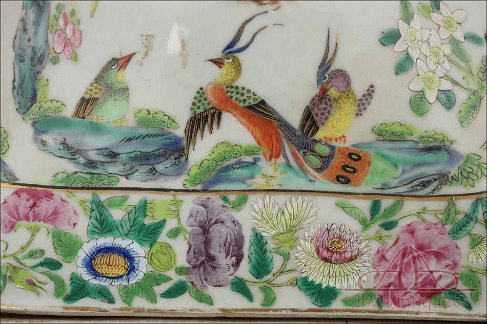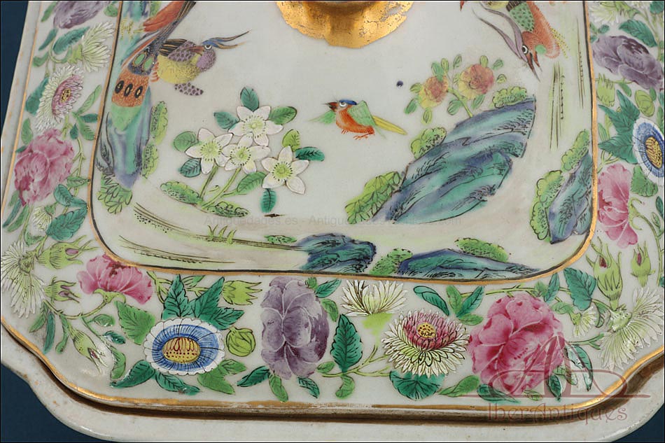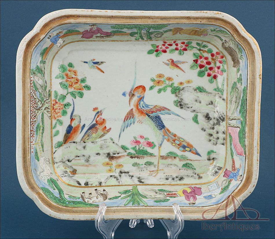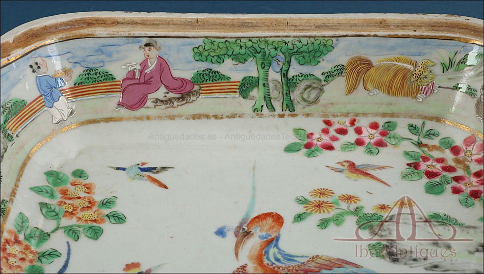 Esta espectacular fuente con tapa es una pieza de porcelana china antigua, realizada durante el siglo XIX, en pleno período Qing. Su forma rectangular y elegante, junto con su delicada decoración, la convierten en un objeto decorativo de gran belleza y rareza. Se trata de una pieza manufacturada con la clara intención de exportarla a Europa, motivo por el cual no presenta marcas de autor, algo habitual en muchas porcelanas chinas de este tipo. Su superficie está completamente pintada a mano con una profusión de motivos tradicionales: aves fénix de largo plumaje y vivos colores, vegetación exótica, flores abiertas y cerradas, rocas de formas sinuosas y pequeños grupos humanos que evocan escenas bucólicas y cortesanas propias del imaginario chino.