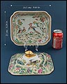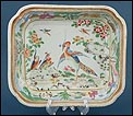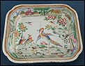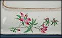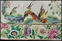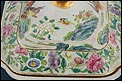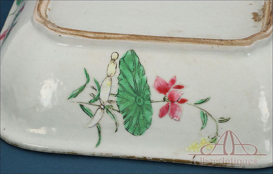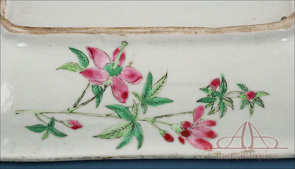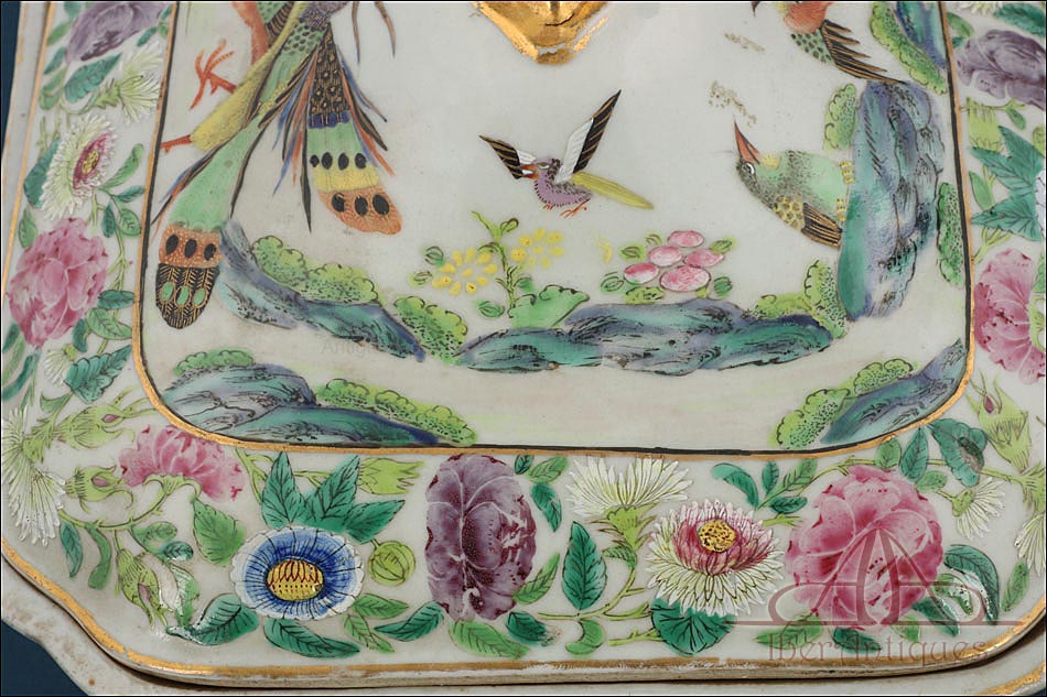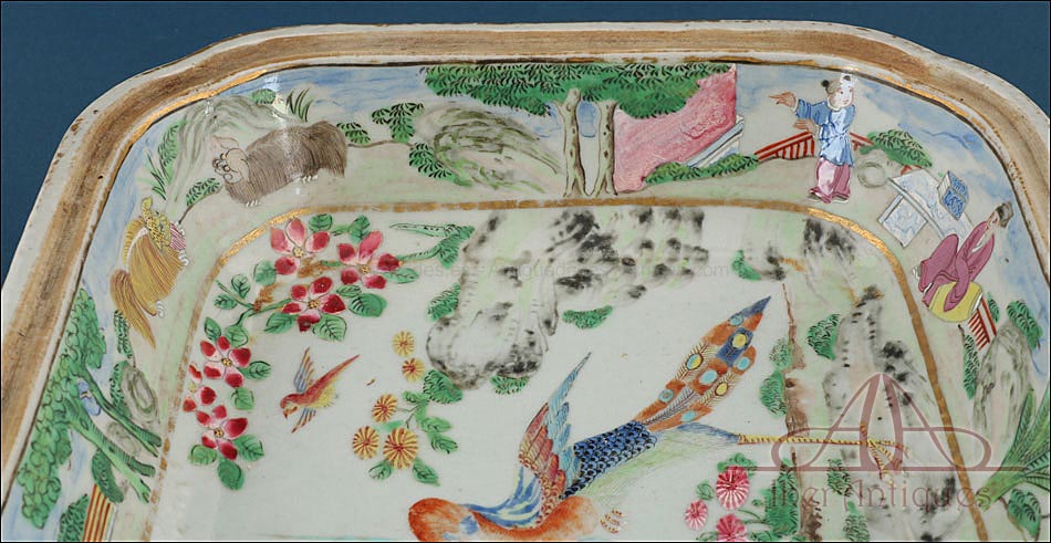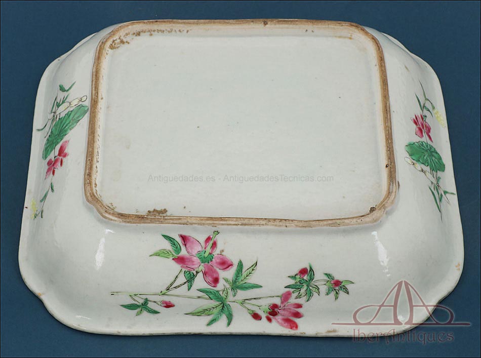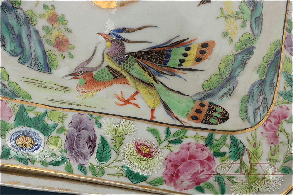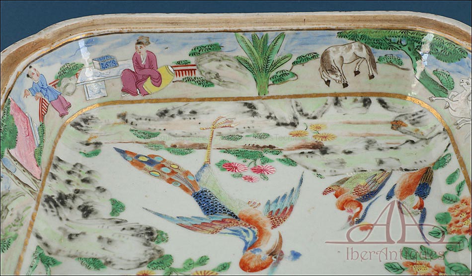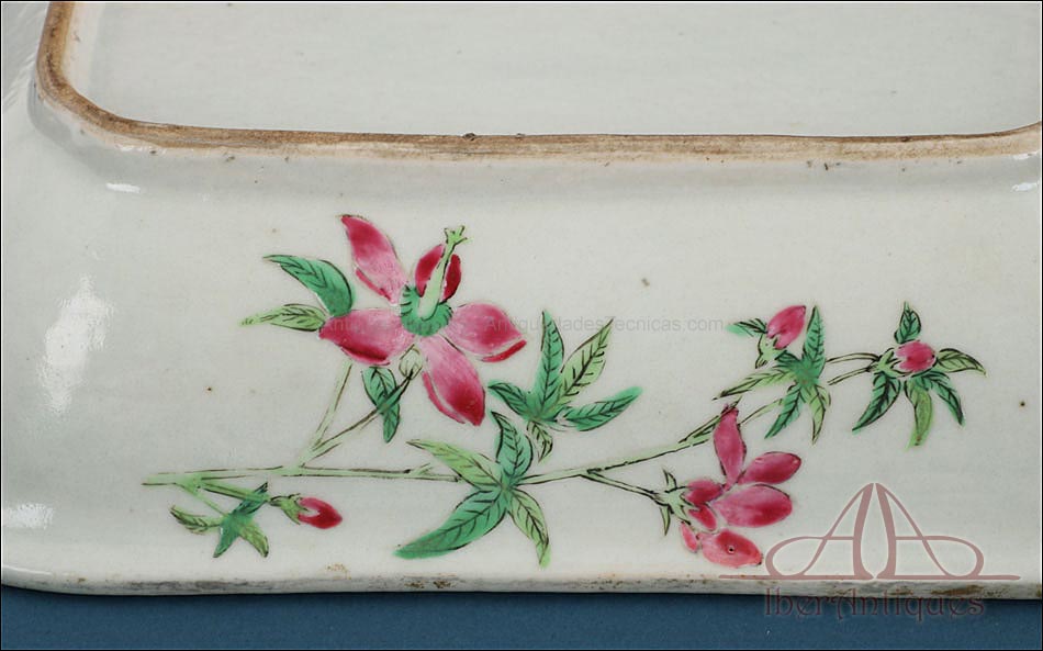 Esta espectacular fuente con tapa es una pieza de porcelana china antigua, realizada durante el siglo XIX, en pleno período Qing. Su forma rectangular y elegante, junto con su delicada decoración, la convierten en un objeto decorativo de gran belleza y rareza. Se trata de una pieza manufacturada con la clara intención de exportarla a Europa, motivo por el cual no presenta marcas de autor, algo habitual en muchas porcelanas chinas de este tipo. Su superficie está completamente pintada a mano con una profusión de motivos tradicionales: aves fénix de largo plumaje y vivos colores, vegetación exótica, flores abiertas y cerradas, rocas de formas sinuosas y pequeños grupos humanos que evocan escenas bucólicas y cortesanas propias del imaginario chino.