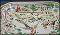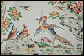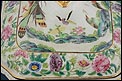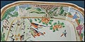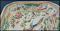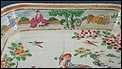 El interior de la fuente reproduce una escena encantadora: aves y flores se integran en paisajes naturales que incluyen árboles en flor, montañas estilizadas y figuras humanas en actitud contemplativa, junto a animales como perros o caballos, todo ello representado en un estilo típicamente oriental. Esta fusión de naturaleza, espiritualidad y delicadeza cromática es una de las características más apreciadas de la porcelana de exportación de este período. El borde interior también cuenta con una cenefa que enmarca la escena con equilibrio visual, usando tonos suaves en verdes, rosas, naranjas y azules.