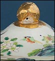 La tapa presenta una magnífica escena central con aves fénix multicolores, rodeada por una cenefa de flores grandes, rosas, peonías y crisantemos, cuidadosamente delineadas y sombreadas con pinceladas finas. El pomo, dorado al fuego y con forma orgánica, ha sido restaurado con gran esmero y discreción, manteniendo la armonía estética del conjunto. Esta intervención, que apenas se nota a simple vista, garantiza que la pieza mantenga su integridad visual sin comprometer su autenticidad. La decoración en toda la fuente es simétrica y perfectamente equilibrada, resultado del trabajo artesanal de pintores expertos que trabajaban en talleres especializados durante el reinado de la dinastía Qing.