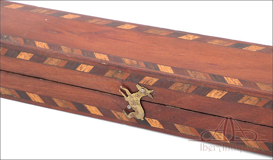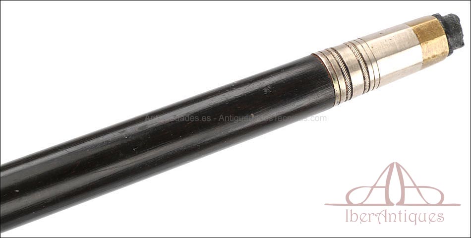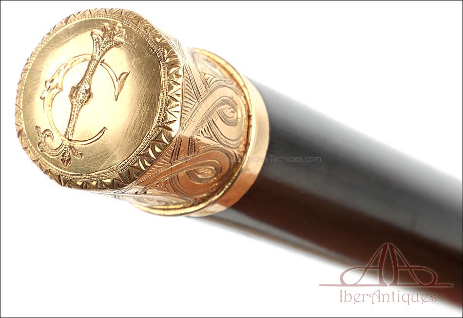 Antiguo bastón en estuche de presentación y pomo de oro macizo de 18K, fabricado circa 1900 y en muy buenas condiciones. Este hermoso conjunto destila nobleza y elegancia, siendo una pieza ideal para su exposición. El bastón lleva pomo de oro de 18K sin contrastes ni marcas, pero ha sido testado al ácido para comprobar la calidad del metal. Está decorado con cenefas grabadas a mano; en la parte superior hay un monograma con las letras C y J, posiblemente las de su propietario original. La puntera de metal lleva también dos finas cenefas de cordón grabadas a mano. El palo del bastón lleva un acabado ebonizado en muy buen estado de conservación, que hace un precioso contraste con el pomo de oro. El estuche es también una pieza muy hermosa: se trata de una caja de madera de caoba maciza, con incrustaciones de marquetería en la tapa y los laterales. Aún conserva los refuerzos de latón originales, así como dos bonitos cierre en forma de animal. El interior está forrado de seda de color hueso, algo desgastada por el paso del tiempo pero aún completa.