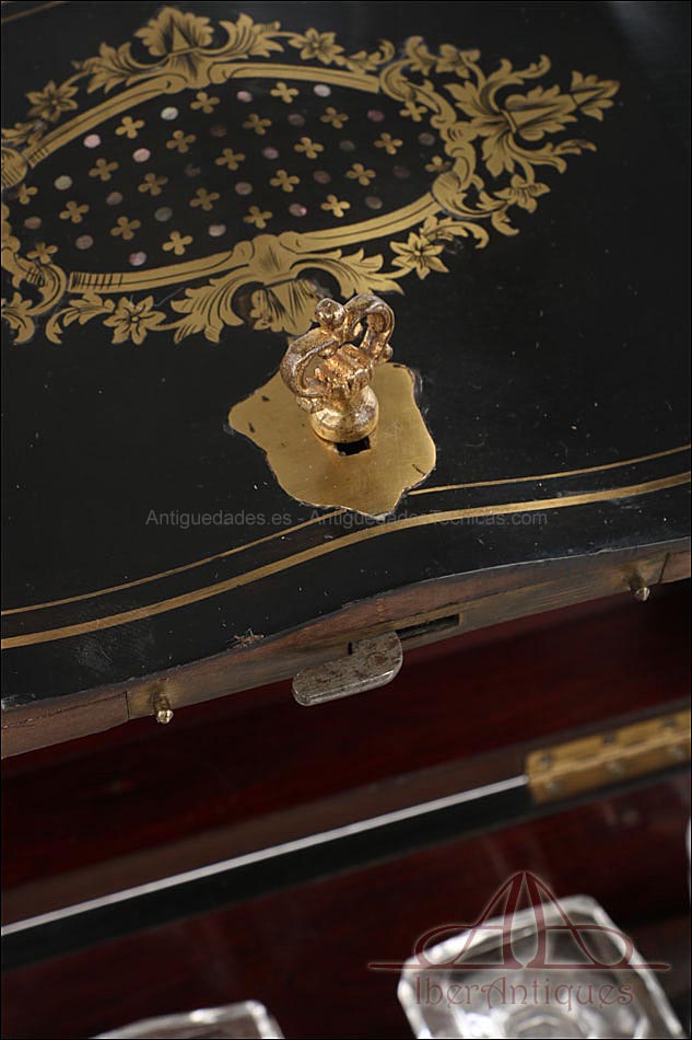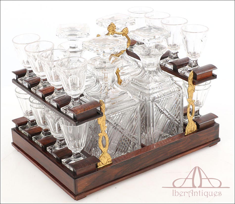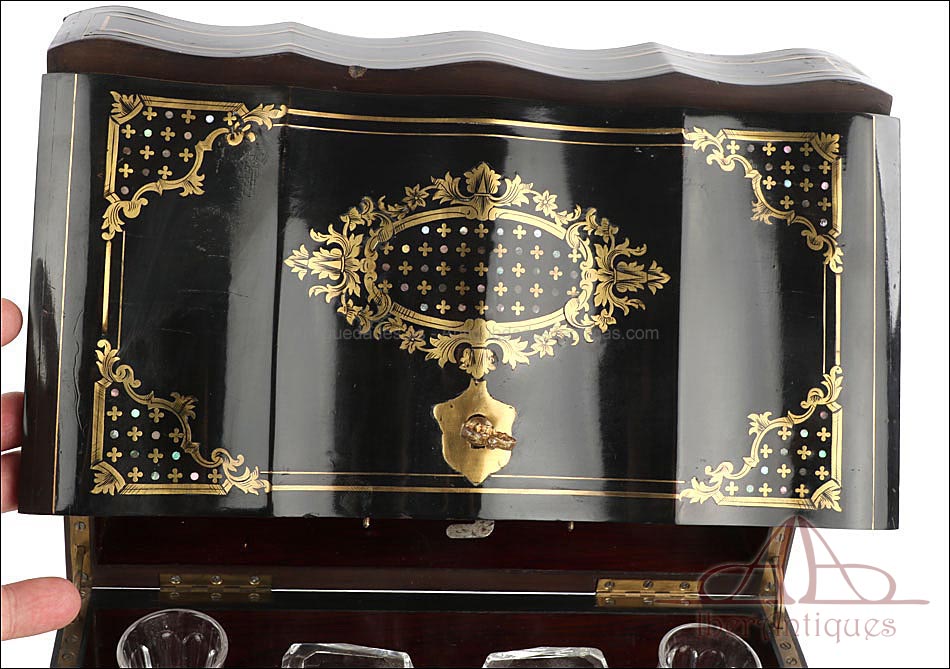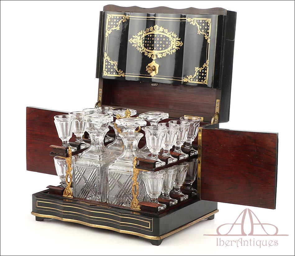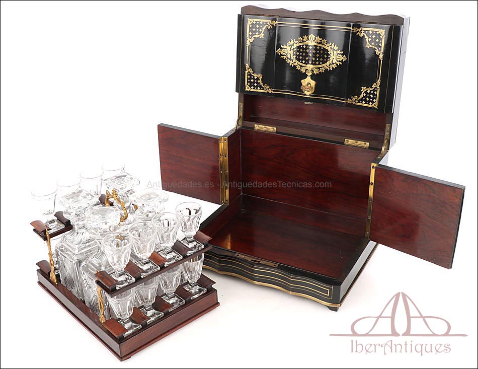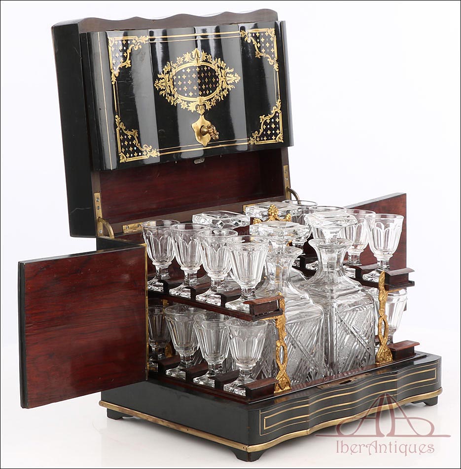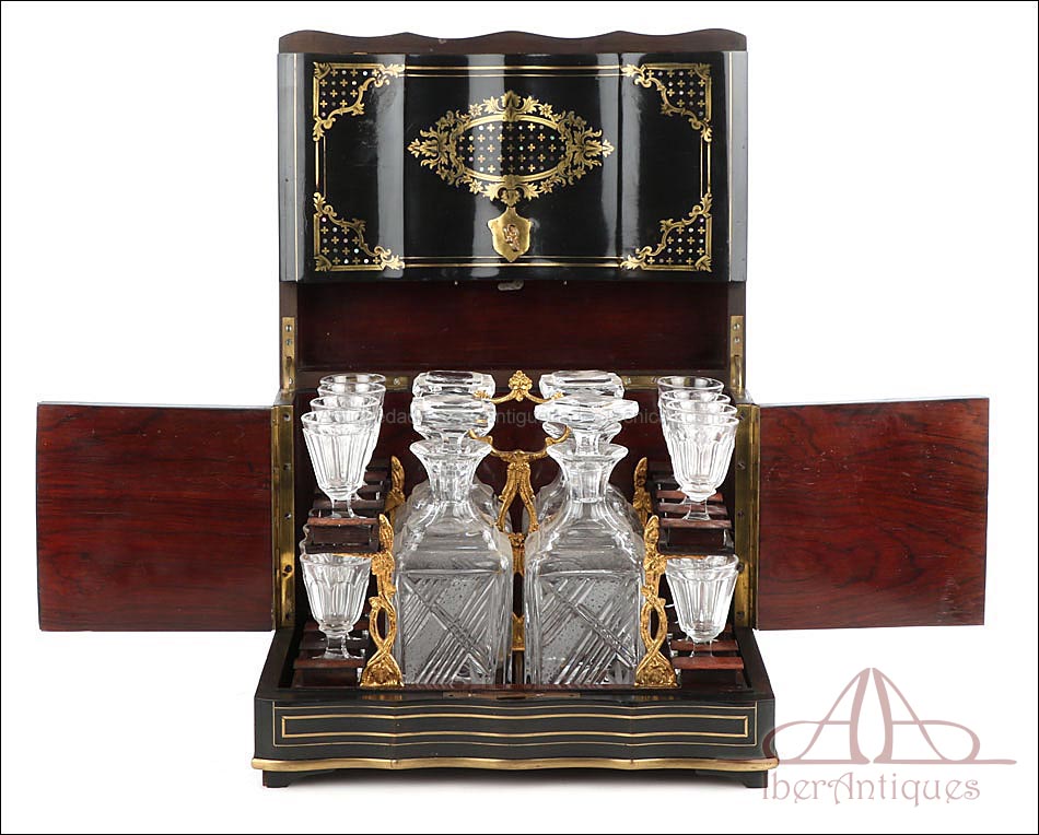 Antigua licorera francesa con marquetería y llave original con cristalería completa de época y en muy buen estado de conservación. Este pequeño y delicado mueble es una auténtica joya, tanto por su belleza como por su funcionalidad. La cristalería está formada por 20 piezas, 16 copas y 4 botellas. No todas las copas son del mismo modelo aunque es difícil apreciarlo al tratarse de diseños muy similares. En total encontramos 8 piezas de un modelo, 7 de otro y una copa con un diseño ligeramente distinto. La licorera es de madera de caoba maciza, chapada en ébano y con un precioso barnizado a muñequilla tanto por el exterior como por el interior. La tapa y el frontal llevan una preciosa marquetería en latón y madreperla, completa y muy bien conservada. El soporte donde se colocan las cuatro botellas y las copas es también de caoba, con asa y separadores de latón repujado y también en buenas condiciones. La licorera conserva la cerradura y la llave originales en excelente estado de funcionamiento.