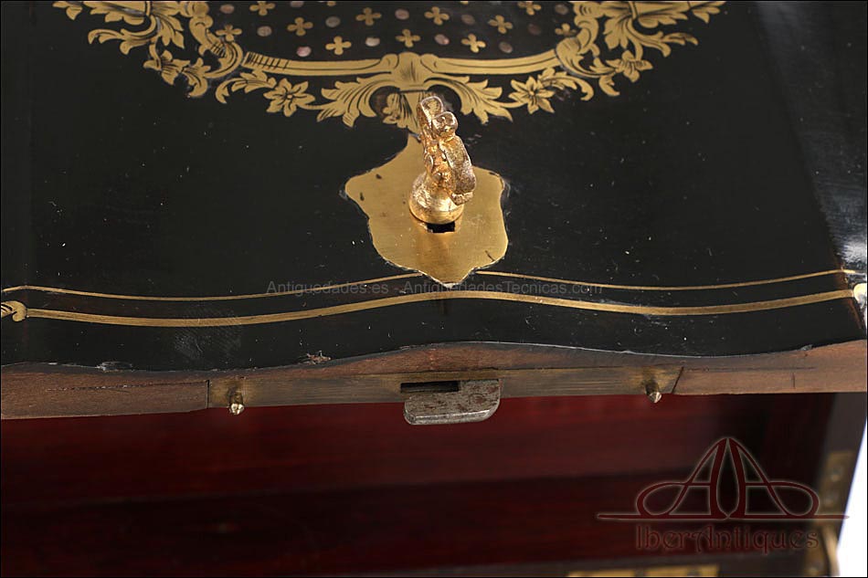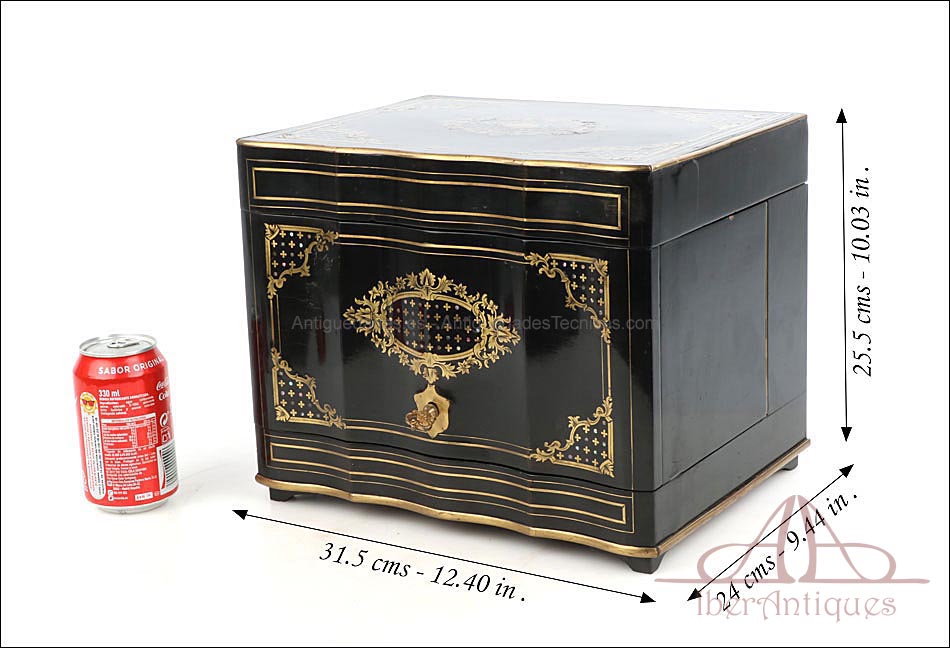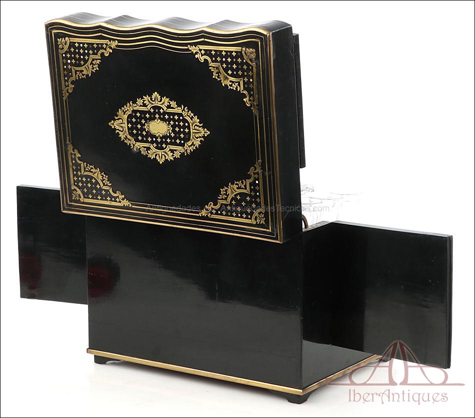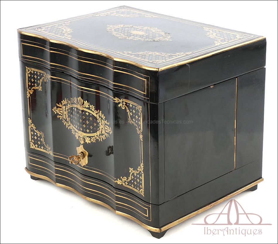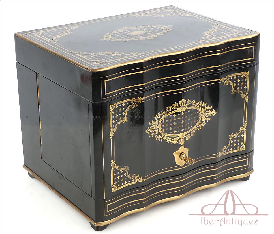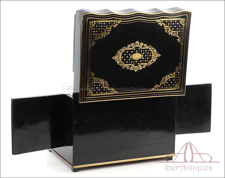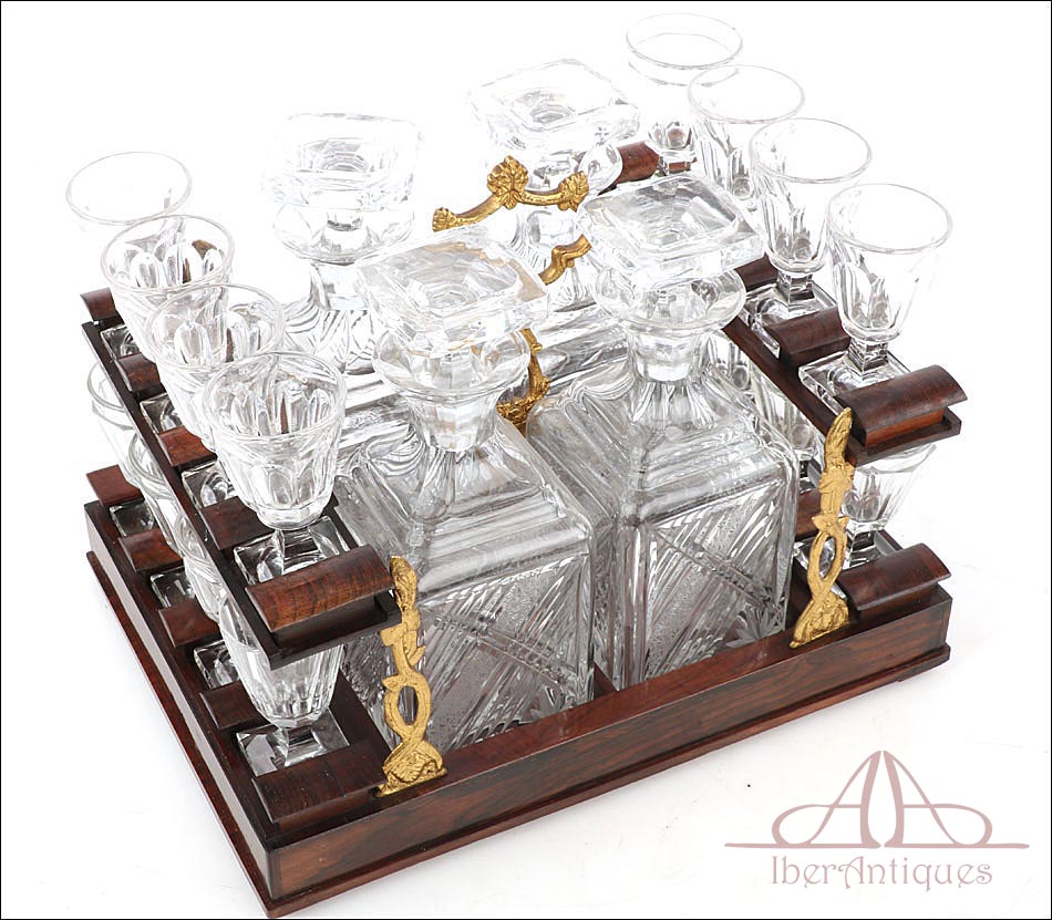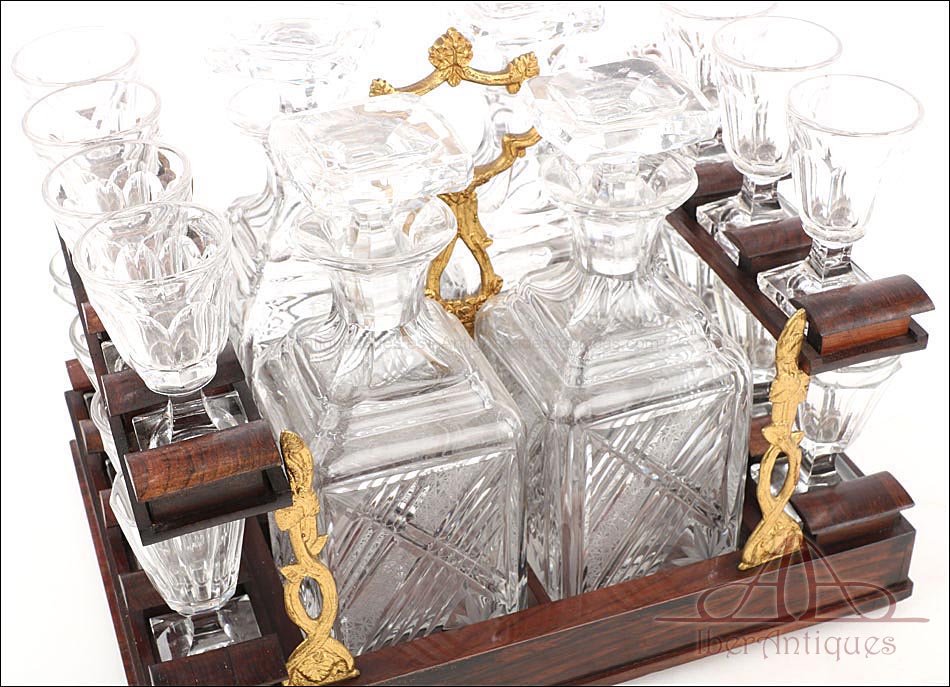 Antigua licorera francesa con marquetería y llave original con cristalería completa de época y en muy buen estado de conservación. Este pequeño y delicado mueble es una auténtica joya, tanto por su belleza como por su funcionalidad. La cristalería está formada por 20 piezas, 16 copas y 4 botellas. No todas las copas son del mismo modelo aunque es difícil apreciarlo al tratarse de diseños muy similares. En total encontramos 8 piezas de un modelo, 7 de otro y una copa con un diseño ligeramente distinto. La licorera es de madera de caoba maciza, chapada en ébano y con un precioso barnizado a muñequilla tanto por el exterior como por el interior. La tapa y el frontal llevan una preciosa marquetería en latón y madreperla, completa y muy bien conservada. El soporte donde se colocan las cuatro botellas y las copas es también de caoba, con asa y separadores de latón repujado y también en buenas condiciones. La licorera conserva la cerradura y la llave originales en excelente estado de funcionamiento.