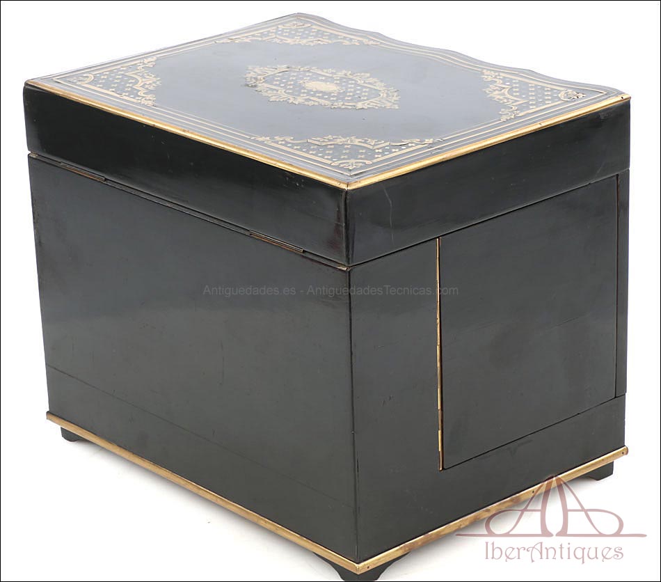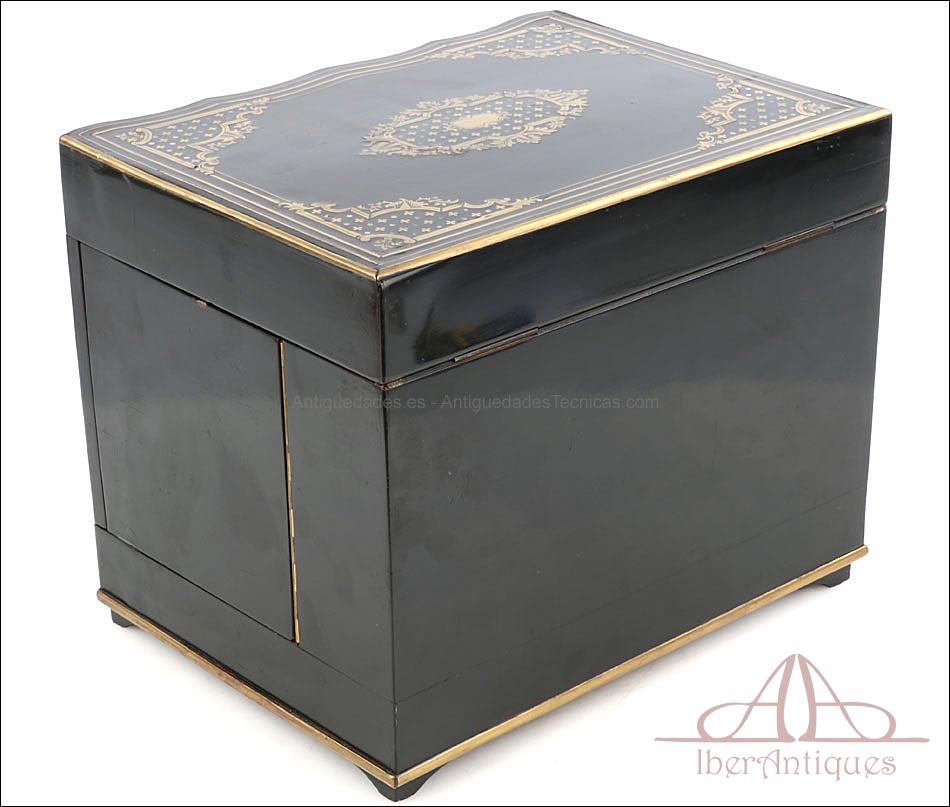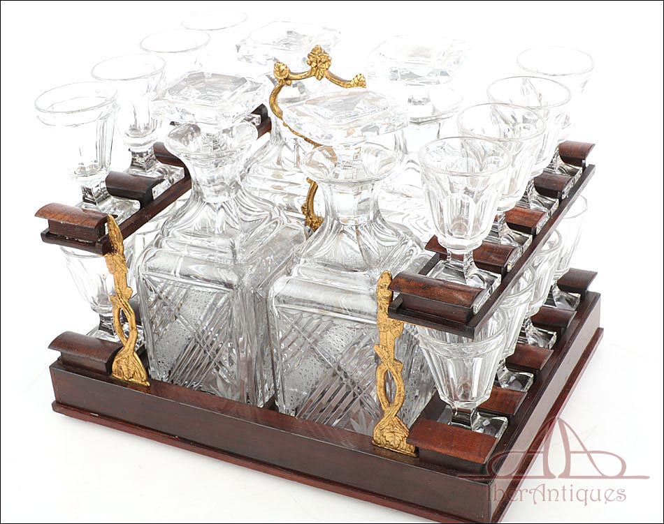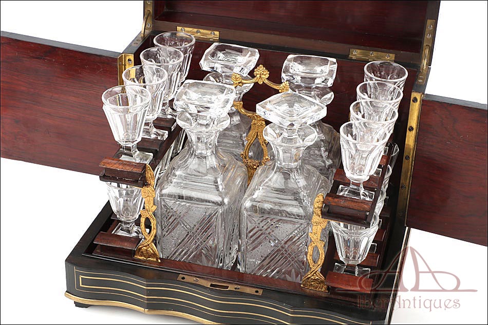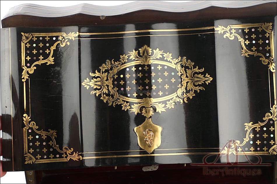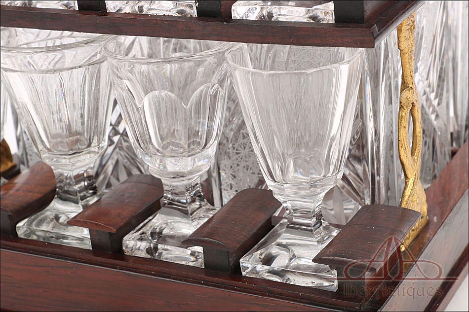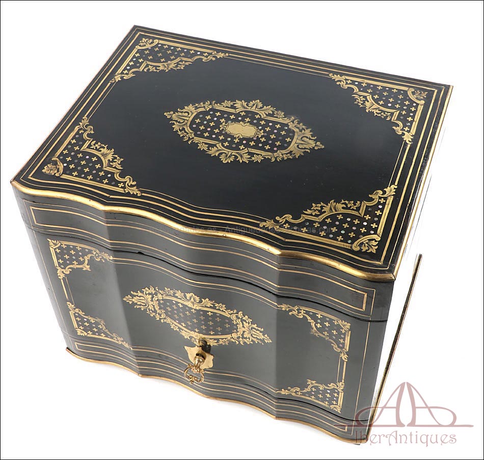 Antigua licorera francesa con marquetería y llave original con cristalería completa de época y en muy buen estado de conservación. Este pequeño y delicado mueble es una auténtica joya, tanto por su belleza como por su funcionalidad. La cristalería está formada por 20 piezas, 16 copas y 4 botellas. No todas las copas son del mismo modelo aunque es difícil apreciarlo al tratarse de diseños muy similares. En total encontramos 8 piezas de un modelo, 7 de otro y una copa con un diseño ligeramente distinto. La licorera es de madera de caoba maciza, chapada en ébano y con un precioso barnizado a muñequilla tanto por el exterior como por el interior. La tapa y el frontal llevan una preciosa marquetería en latón y madreperla, completa y muy bien conservada. El soporte donde se colocan las cuatro botellas y las copas es también de caoba, con asa y separadores de latón repujado y también en buenas condiciones. La licorera conserva la cerradura y la llave originales en excelente estado de funcionamiento.