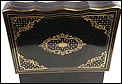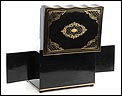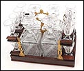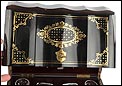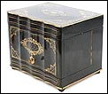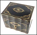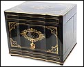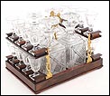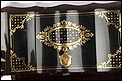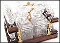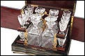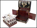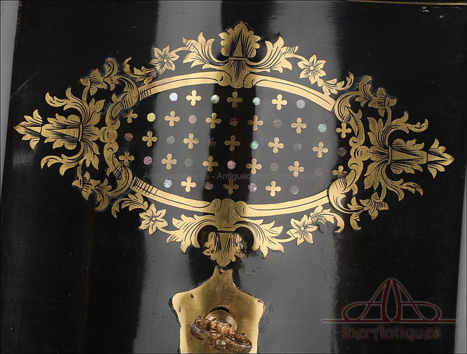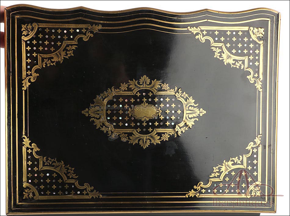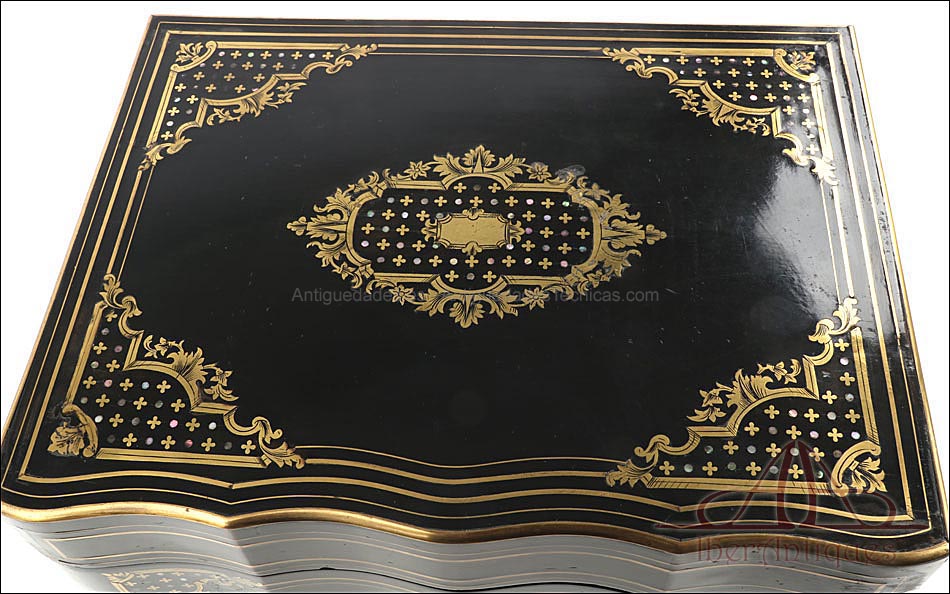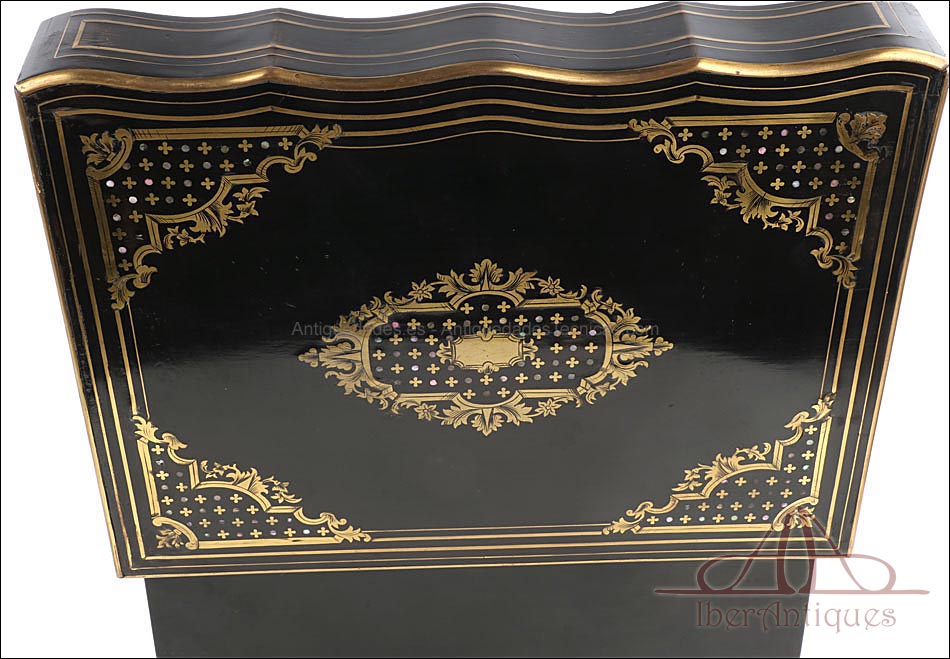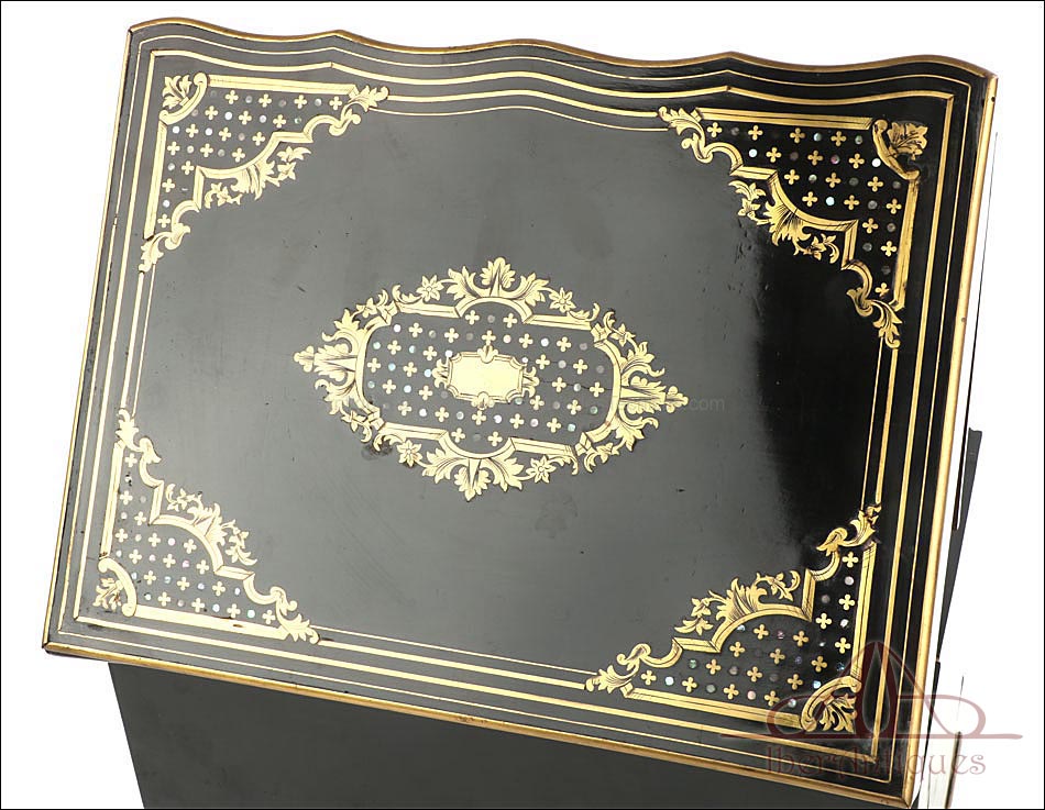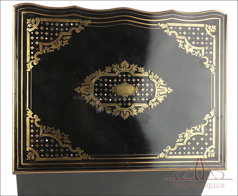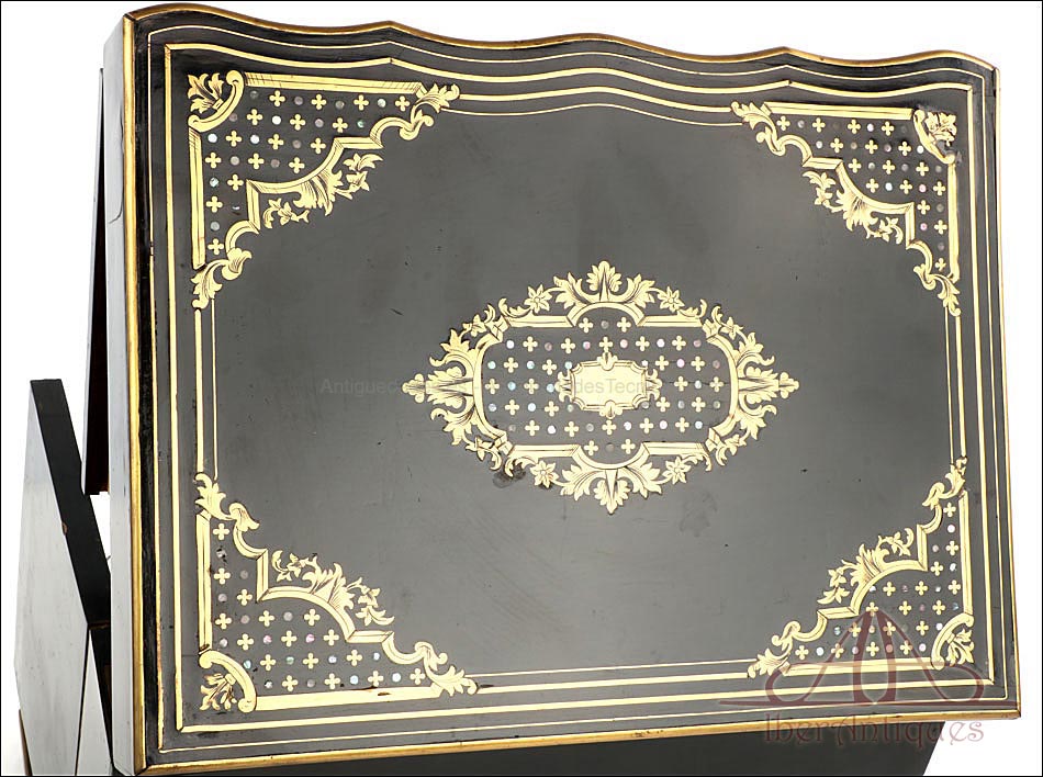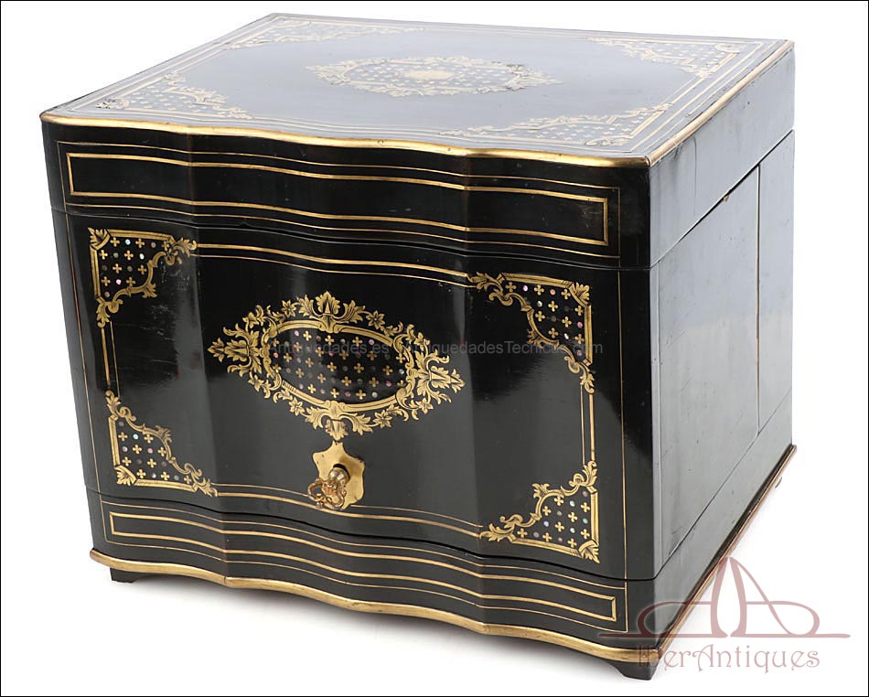 Antigua licorera francesa con marquetería y llave original con cristalería completa de época y en muy buen estado de conservación. Este pequeño y delicado mueble es una auténtica joya, tanto por su belleza como por su funcionalidad. La cristalería está formada por 20 piezas, 16 copas y 4 botellas. No todas las copas son del mismo modelo aunque es difícil apreciarlo al tratarse de diseños muy similares. En total encontramos 8 piezas de un modelo, 7 de otro y una copa con un diseño ligeramente distinto. La licorera es de madera de caoba maciza, chapada en ébano y con un precioso barnizado a muñequilla tanto por el exterior como por el interior. La tapa y el frontal llevan una preciosa marquetería en latón y madreperla, completa y muy bien conservada. El soporte donde se colocan las cuatro botellas y las copas es también de caoba, con asa y separadores de latón repujado y también en buenas condiciones. La licorera conserva la cerradura y la llave originales en excelente estado de funcionamiento.