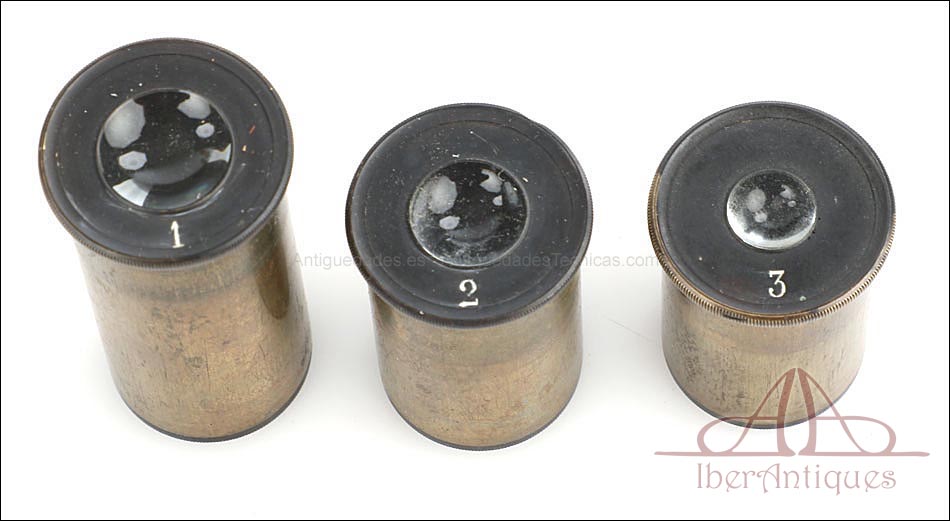 Muy antiguo microscopio de latón Nachet mod. 11 fabricado en Francia circa 1890, en excelentes condiciones y buen estado de funcionamiento. Este precioso aparato tiene cerca de 150 años de antigüedad, y aun así sigue siendo apto para visualizar muestras y preparados. Todas sus piezas se mueven de forma suave, incluido el sistema de enfoque fino, lo que permite ajustar al máximo su precisión. El microscopio está fabricado íntegramente en latón y conserva la laca protectora original, así como la hermosa pátina que le aporta. En la base podemos ver la firma del fabricante y su dirección en París grabadas en mayúsculas: NACHET ET FILS, 17, rue St. Severin Paris. Va acompañado de un juego de 3 objetivos y 2 oculares; los objetivos se presentan en su propio estuche, forrado de símil piel negra y terciopelo granate. El conjunto se presenta en su estuche original, una sobria caja de madera de caoba maciza con esquinas en cola de milano y cerradura con llave funcional.
