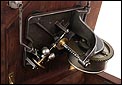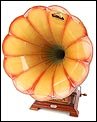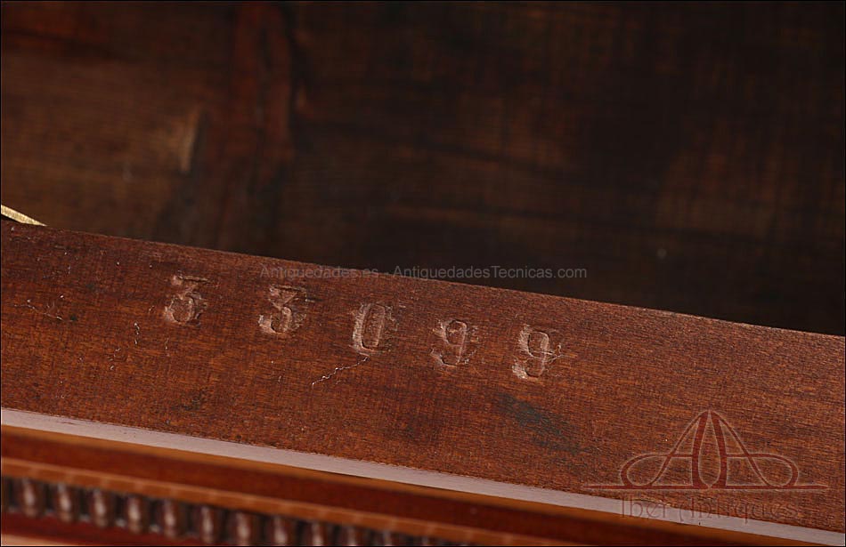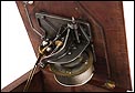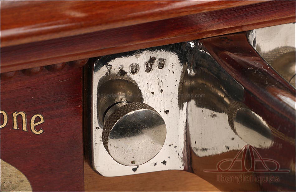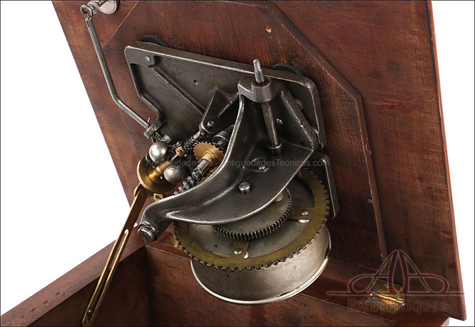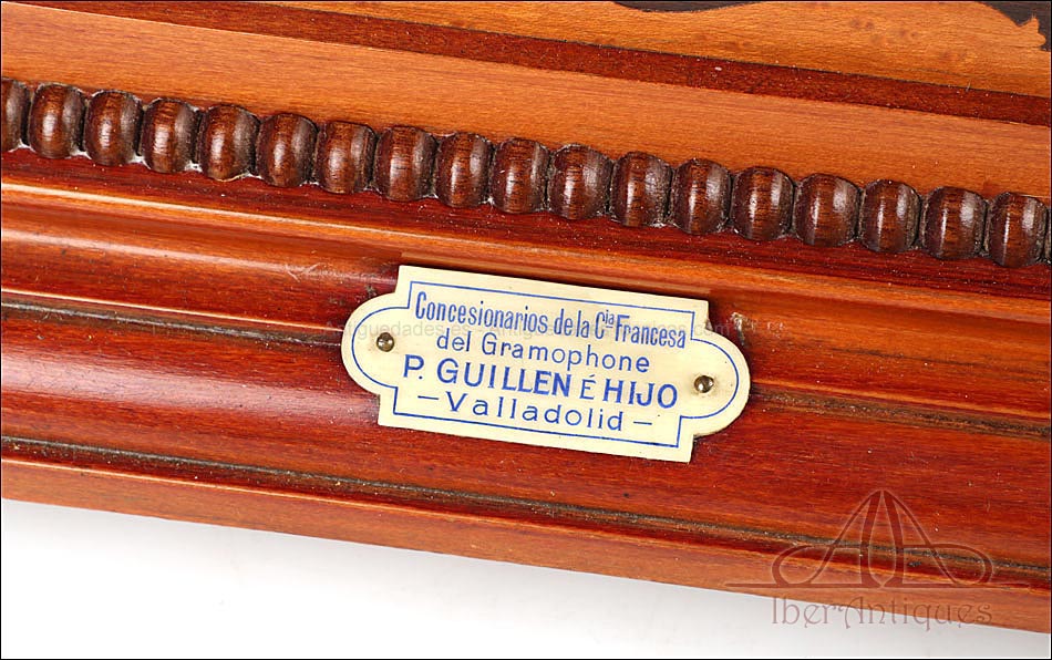 En la caja se conserva también la placa con el distribuidor original, situado en Valladolid. En el interior podemos ver grabado el número de serie 330099, que coincide con el que aparece en el brazo de metal. Por su parte, la trompa de metal estilo “morning glory” conserva la pintura original en color amarillo vainilla con degradado anaranjado en el borde, los nervios y la base. Excepto por una pequeña reparación en el brazo, está en un estado casi impecable, desplegando toda su belleza de época. El motor ha sido ajustado y engrasado para garantizar un buen funcionamiento, que permite disfrutar del nostálgico sonido de los discos de época con todos sus matices y gran claridad.