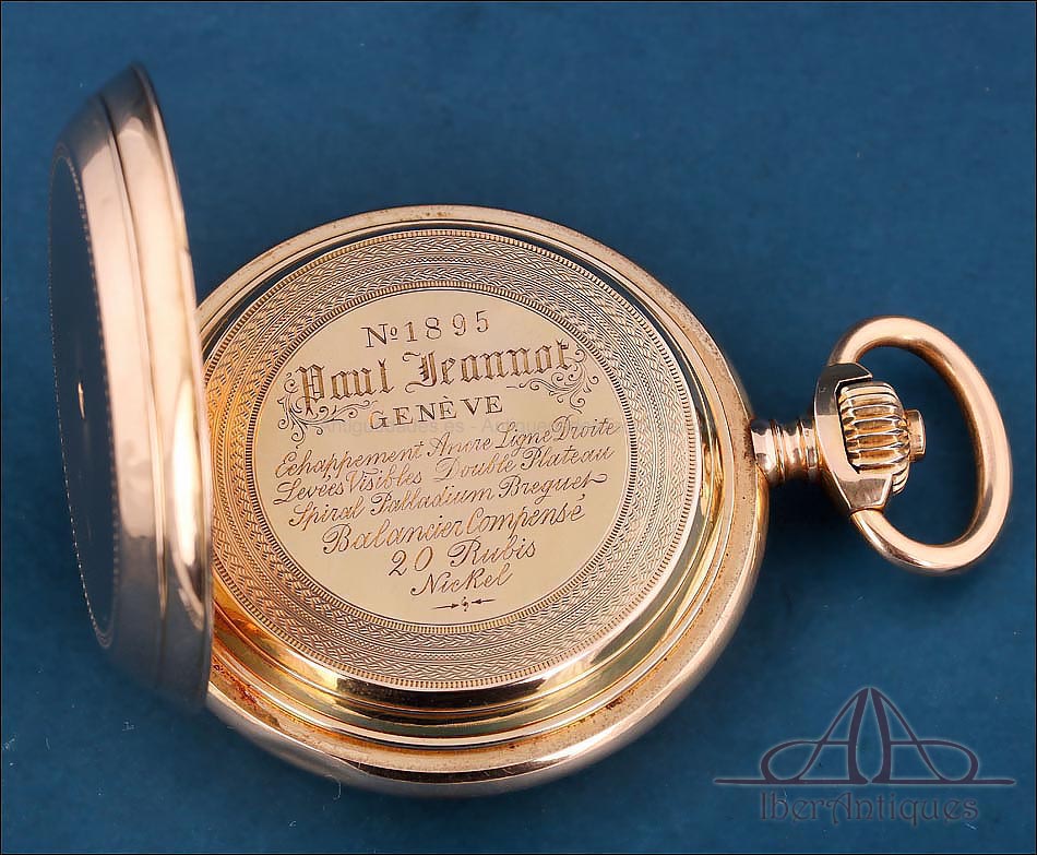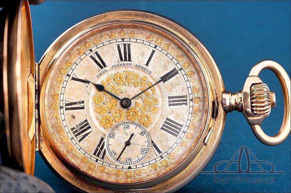 Paul Jeannot fue un reputado relojero ginebrino activo en la segunda mitad del siglo XIX, especialmente reconocido por la elaboración de relojes de bolsillo en metales preciosos y movimientos de alta gama. Su firma “Paul Jeannot Genève” está asociada a piezas de gran precisión, muchas de ellas dotadas de complicaciones técnicas y con movimientos decorados con gran esmero. Jeannot desarrolló relojes que a menudo incluían características avanzadas para su tiempo, como espirales Breguet, volantes compensados y escapes de alta precisión, elementos muy valorados por los coleccionistas actuales. Sus obras eran exportadas a mercados exigentes como el francés, inglés y americano, donde la demanda de relojes de alta gama suizos crecía constantemente en la época victoriana.