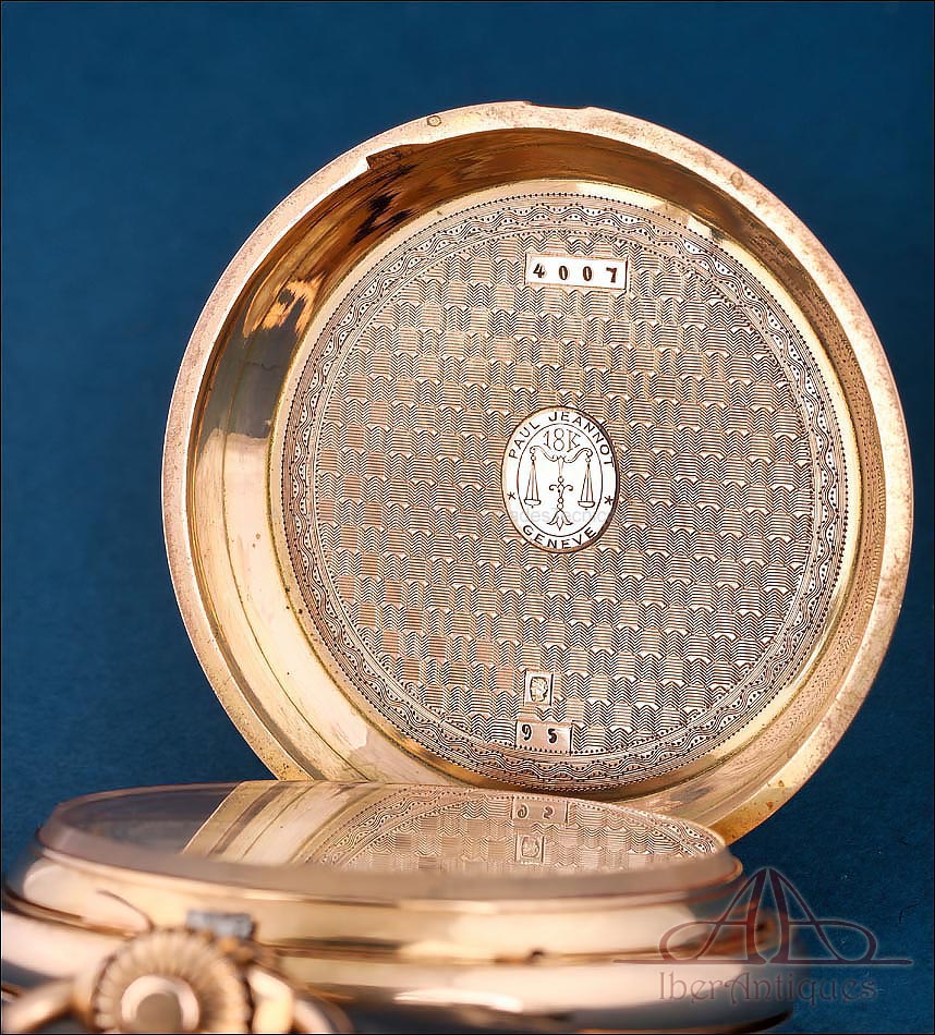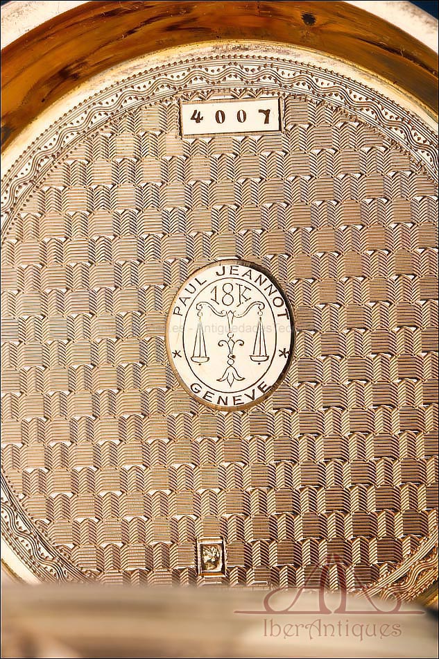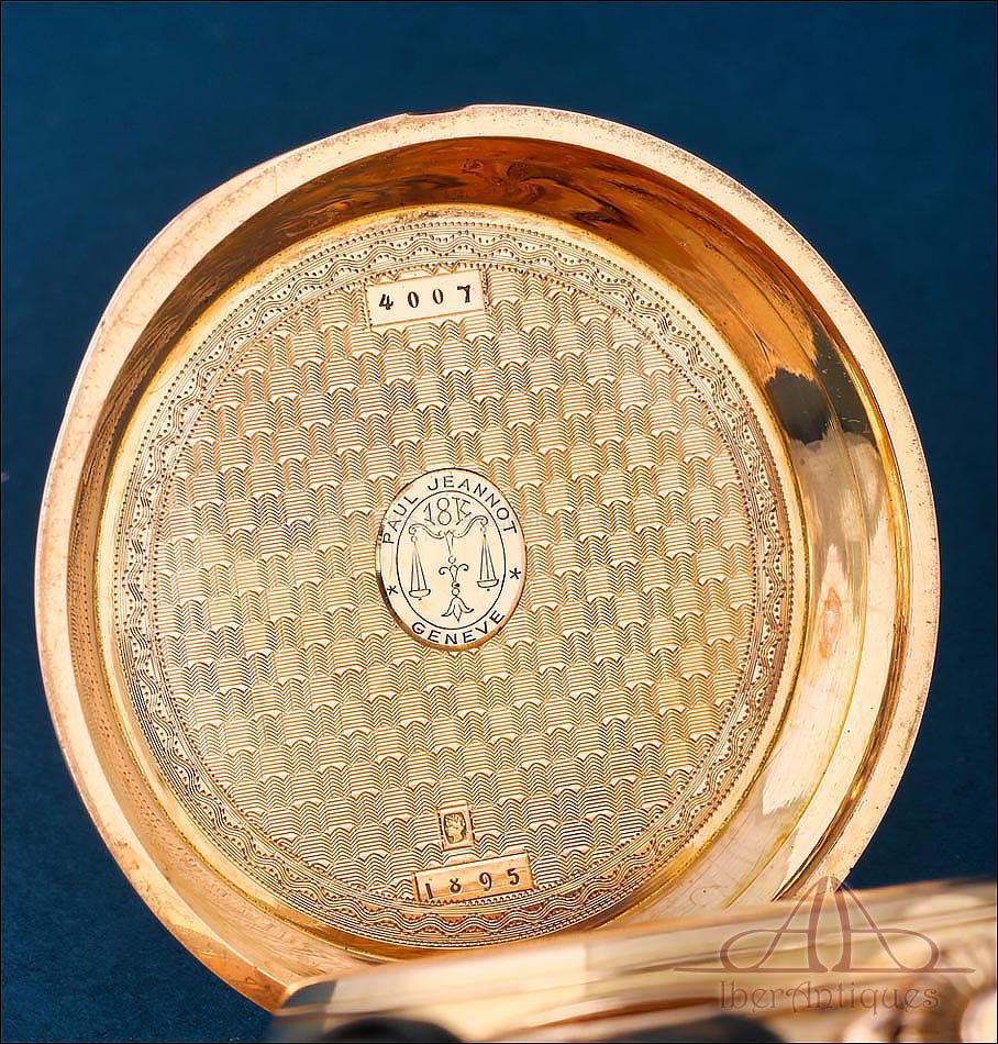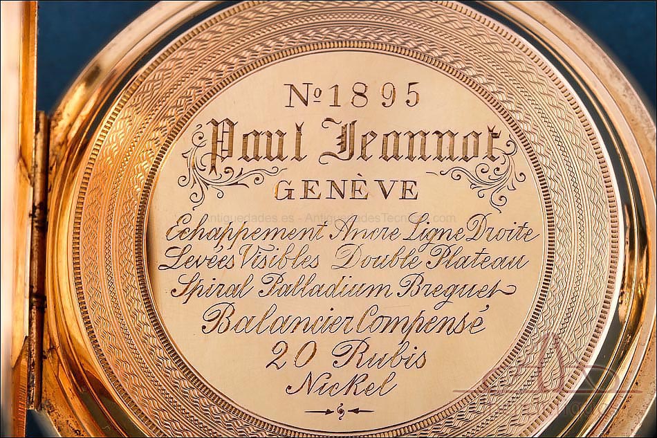 El ajuste micrométrico del escape es una característica poco común en relojes de esta época, lo que permite un control preciso de la oscilación del volante, incrementando la fiabilidad del reloj. El número de serie grabado (1895) junto con los punzones de oro suizos y la firma “Paul Jeannot Genève” garantizan su autenticidad y su procedencia noble.