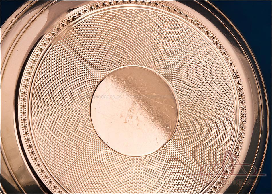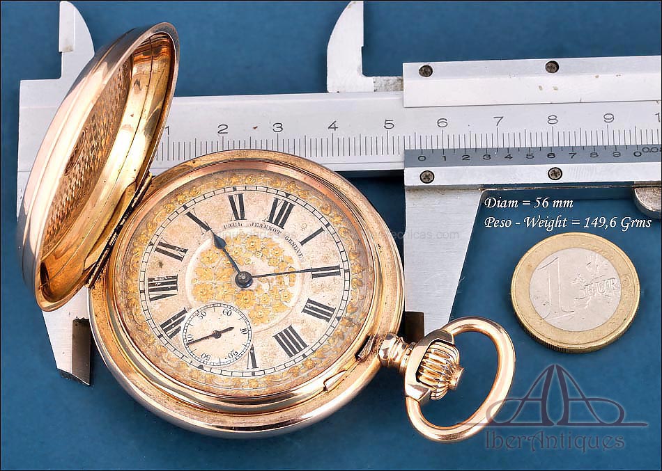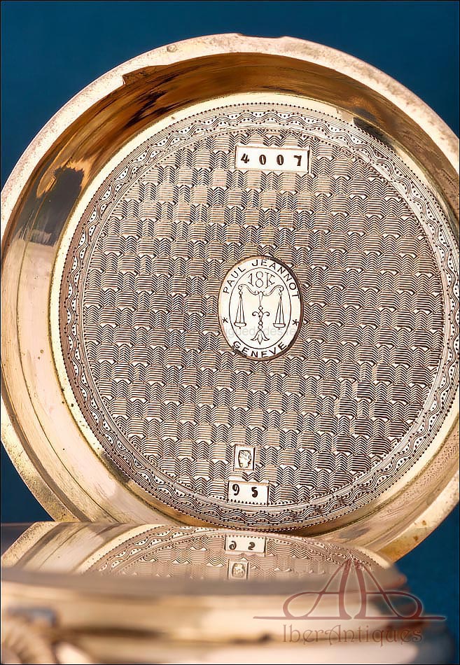 Este espléndido reloj de bolsillo fabricado por Paul Jeannot en Ginebra alrededor del año 1880 es una auténtica joya de la relojería suiza del siglo XIX. Elaborado completamente en oro de 18 quilates (18K), con un peso total de más de 149 gramos, de los cuales más de 70 gramos son de oro de 18K, este reloj saboneta presenta una elegante construcción de triple tapa: exterior, guardapolvo y cubre maquinaria, todas finamente labradas. La tapa frontal luce un refinado grabado guilloché que aporta textura y profundidad, rodeado por un fino bisel perlado y un círculo central liso perfecto para un escudo familiar o una dedicatoria.