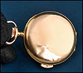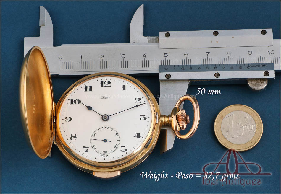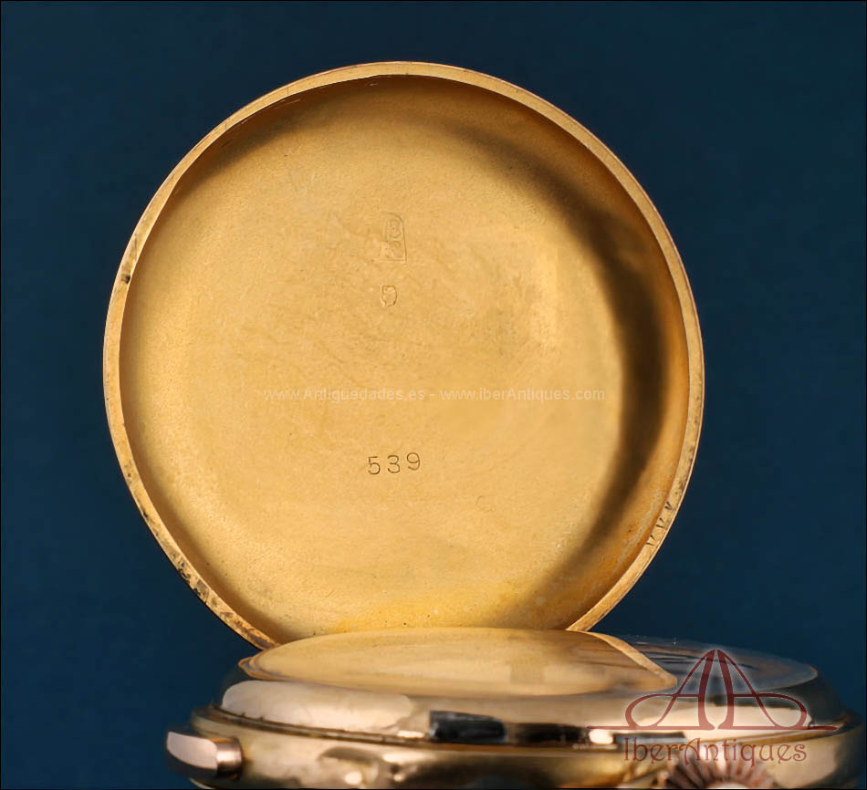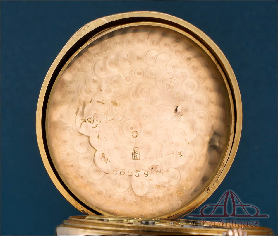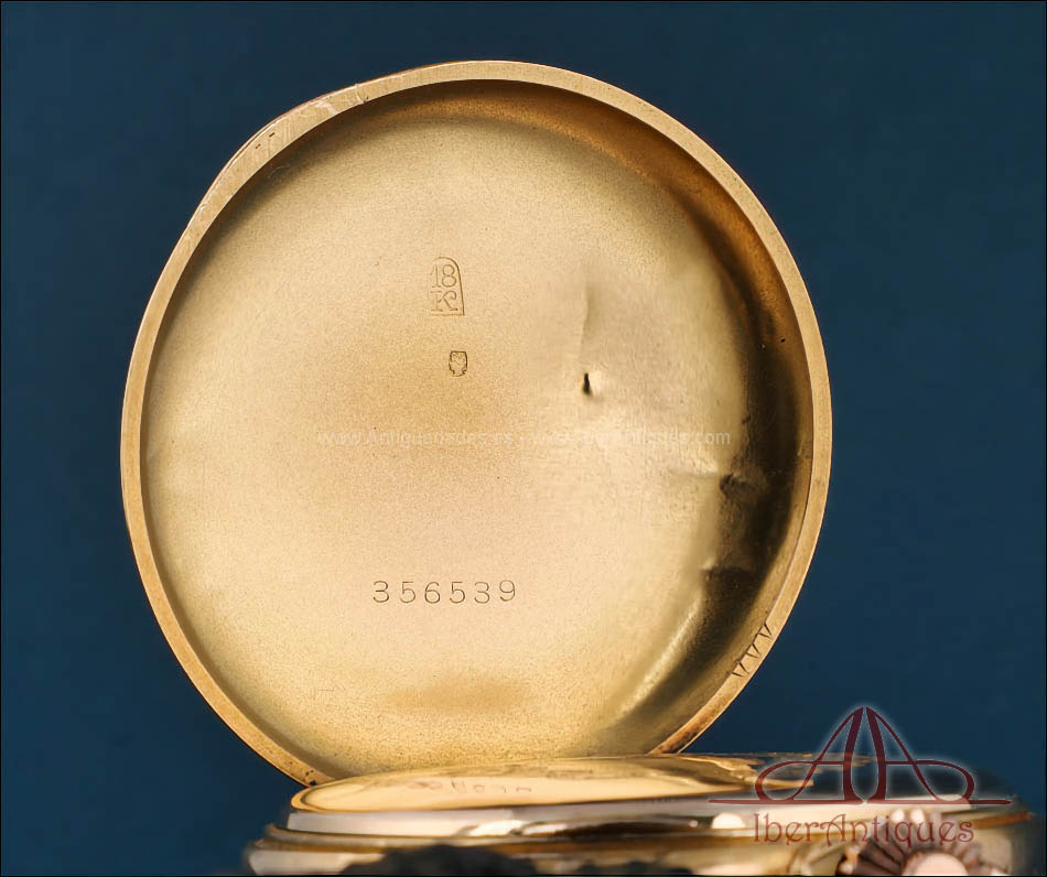 Las tres tapas de oro muestran los mismos números de serie, prueba de que el conjunto se ha conservado completo desde su origen. En las tapas exteriores se aprecian pequeños golpes visibles, sobre todo en la parte trasera, típicos de la vida de un reloj de bolsillo usado y querido, pero que no afectan en absoluto a la solidez de la caja ni a su perfecto funcionamiento. Incluso con estas marcas de uso, el reloj mantiene un encanto auténtico y sincero, esa pátina de historia que muchos coleccionistas buscan porque hace que la pieza resulte más humana y cercana.