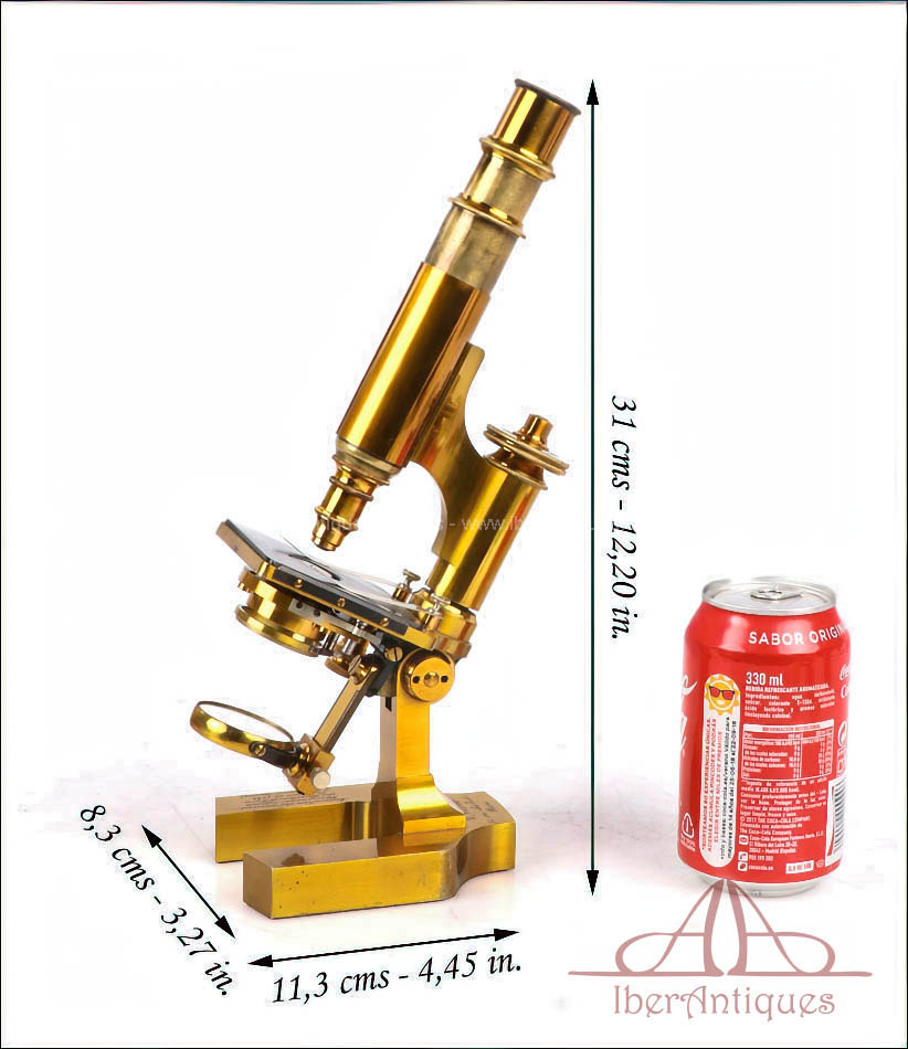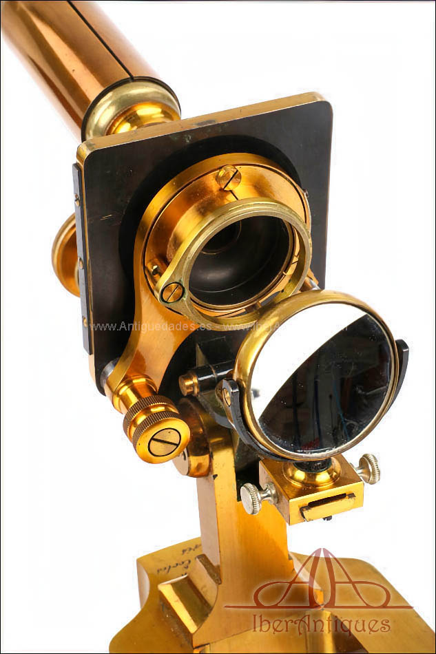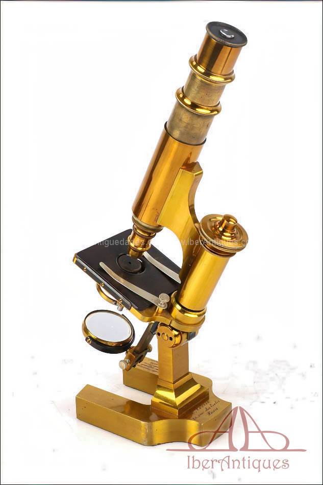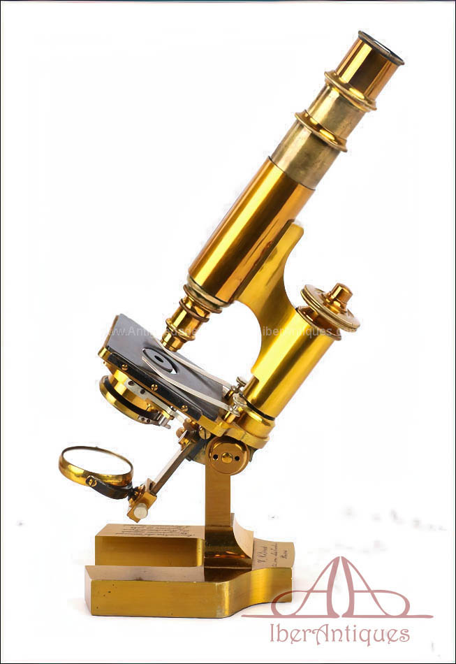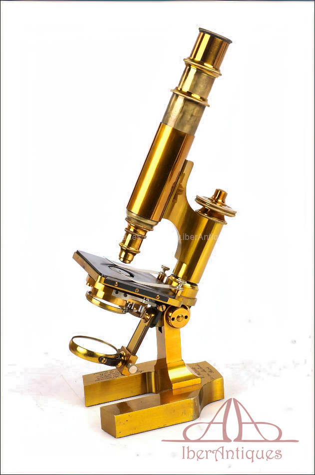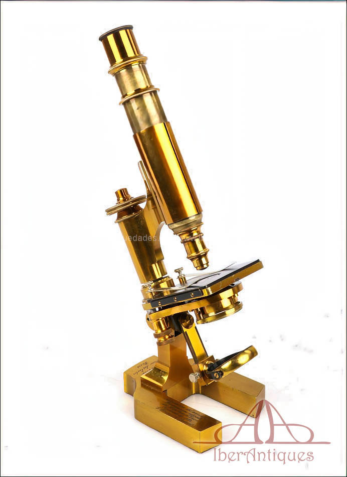 Extraordinario microscopio antiguo francés fabricado en 1890 por la prestigiosa casa C. Verick, una de las firmas más valoradas dentro de la instrumentación científica europea del siglo XIX. La pieza está realizada íntegramente en latón, con una construcción sólida, elegante y perfectamente equilibrada, y presenta un estado de conservación excepcional, prácticamente como nuevo, algo muy poco habitual en instrumentos de este tipo y época.