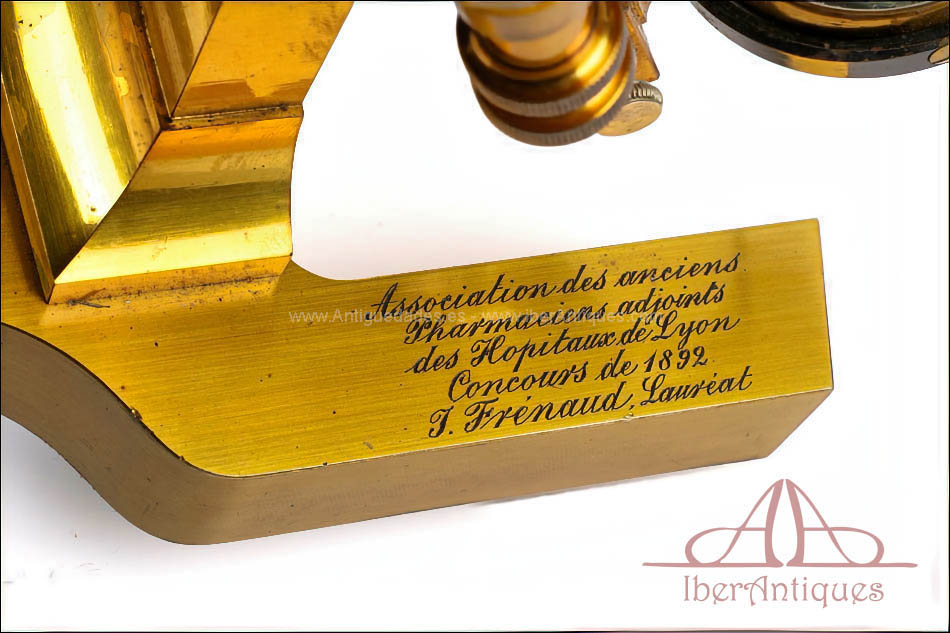Esta inscripción no es decorativa ni conmemorativa sin más. Indica que el microscopio fue entregado como premio institucional a J. Frenaud tras resultar laureado en el concours de 1892. En la Francia de finales del siglo XIX, los concours eran exámenes u oposiciones oficiales de alto nivel, especialmente exigentes, vinculados a la formación científica superior y al acceso o reconocimiento dentro de instituciones hospitalarias y académicas.
