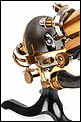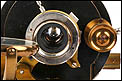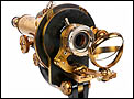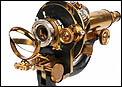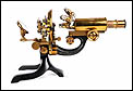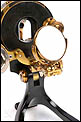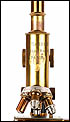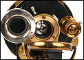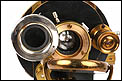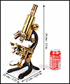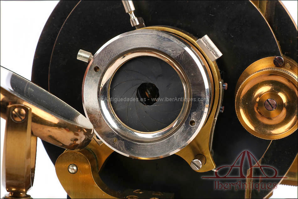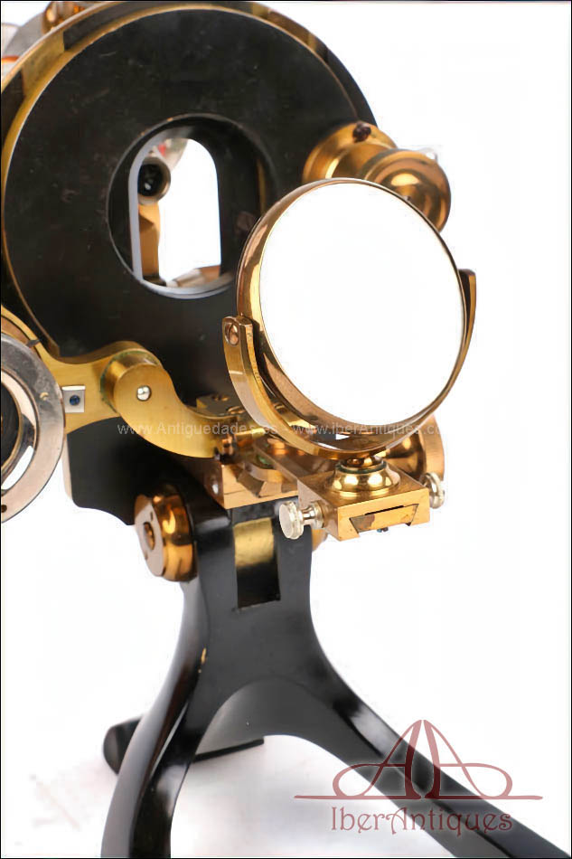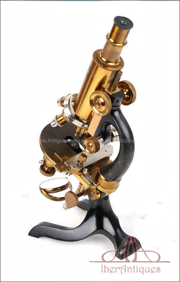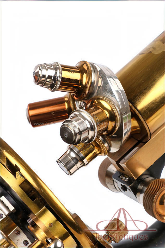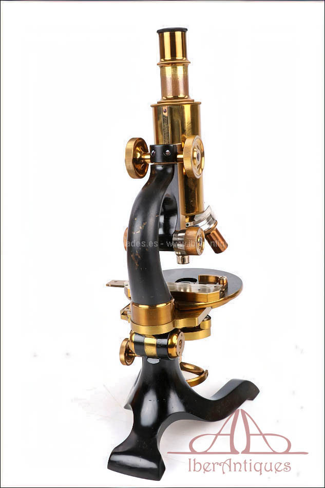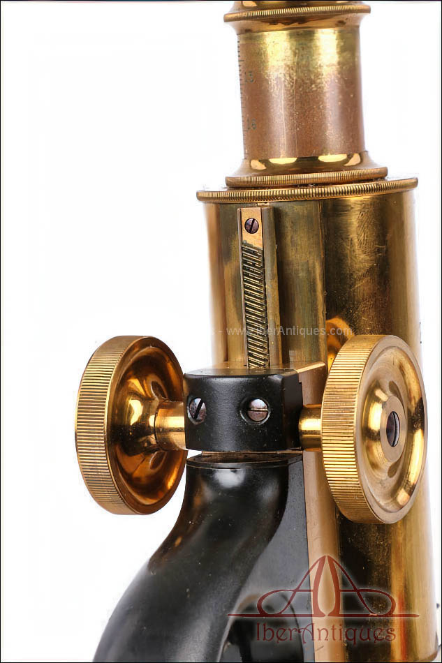 El microscopio está realizado íntegramente en latón dorado con su barniz original de época, que se conserva de forma excepcional. El acabado mantiene un brillo muy atractivo y homogéneo, sin repintes ni restauraciones, lo que transmite una sensación inmediata de pieza cuidada y auténtica. La estructura es sólida, bien proporcionada y visualmente muy elegante, con el arco trasero en acabado negro, que presenta únicamente un desgaste leve y coherente con el paso del tiempo.