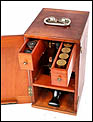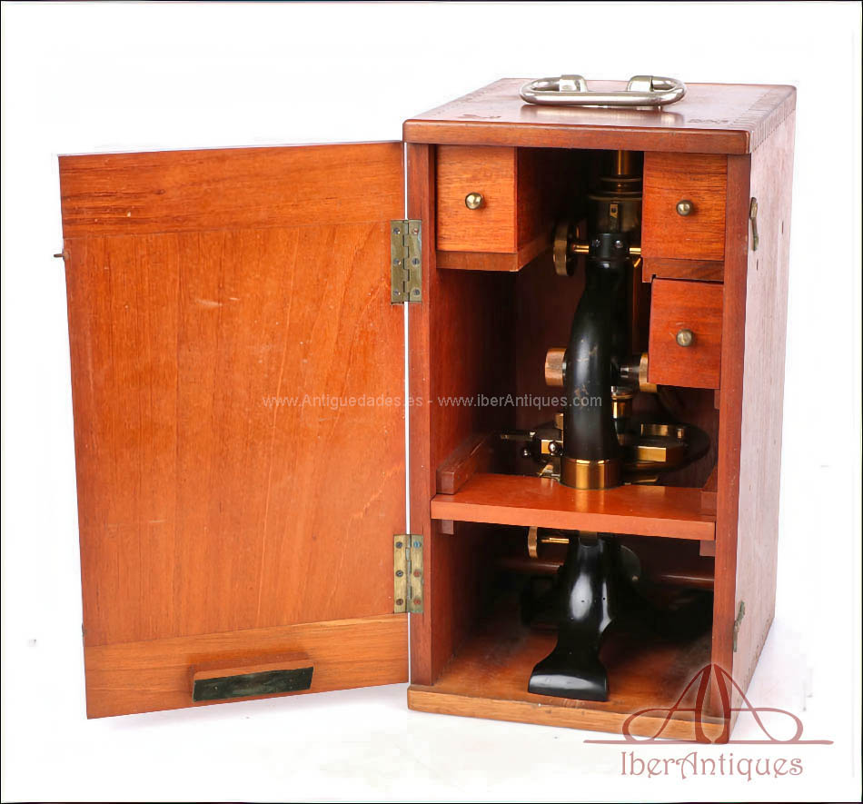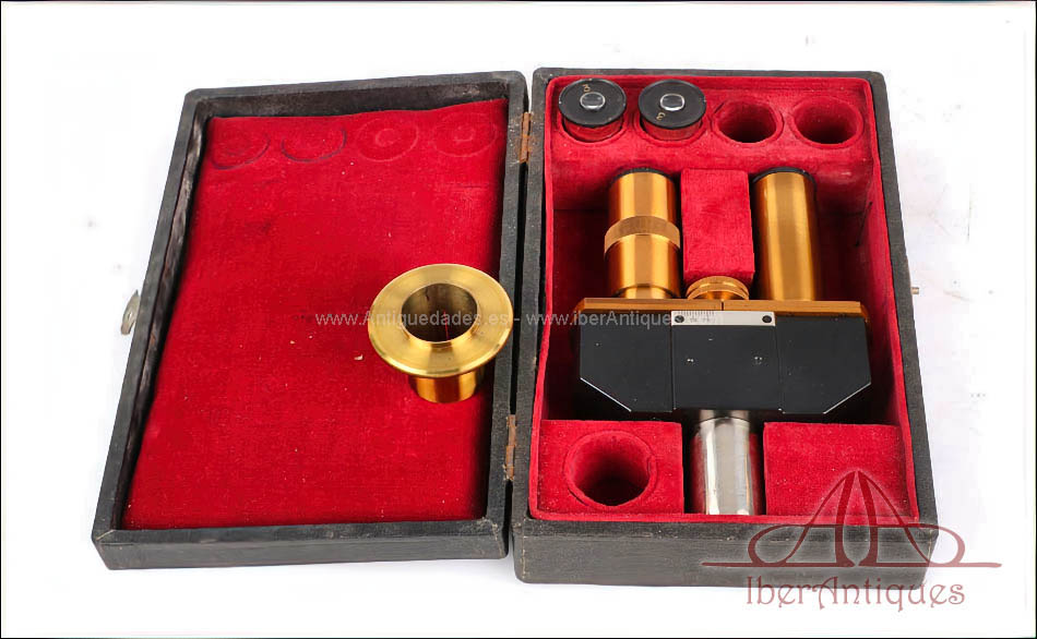 Se presenta con su estuche original de madera, bien conservado y sólido, con compartimentos interiores para el microscopio y los accesorios. Además, se incluyen cristales vírgenes y otros pequeños complementos que no aparecen en las fotografías, pero que forman parte del conjunto.