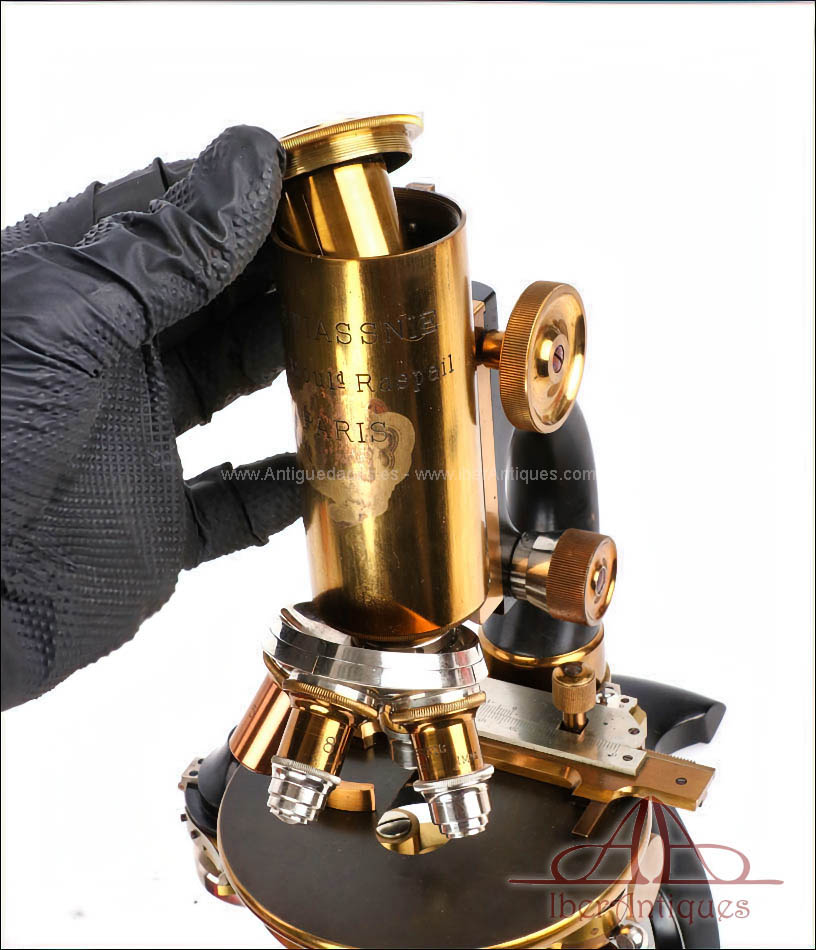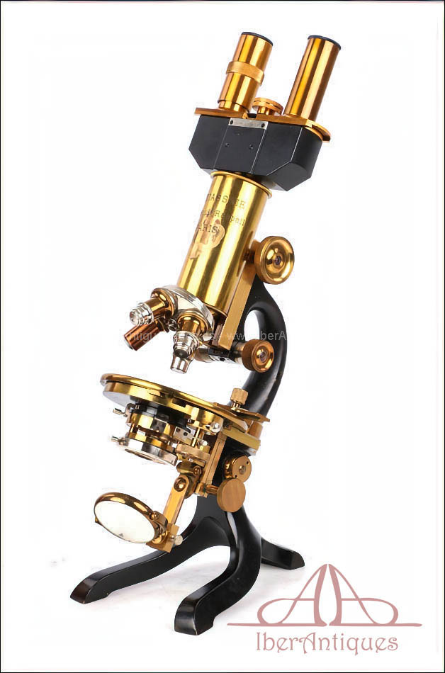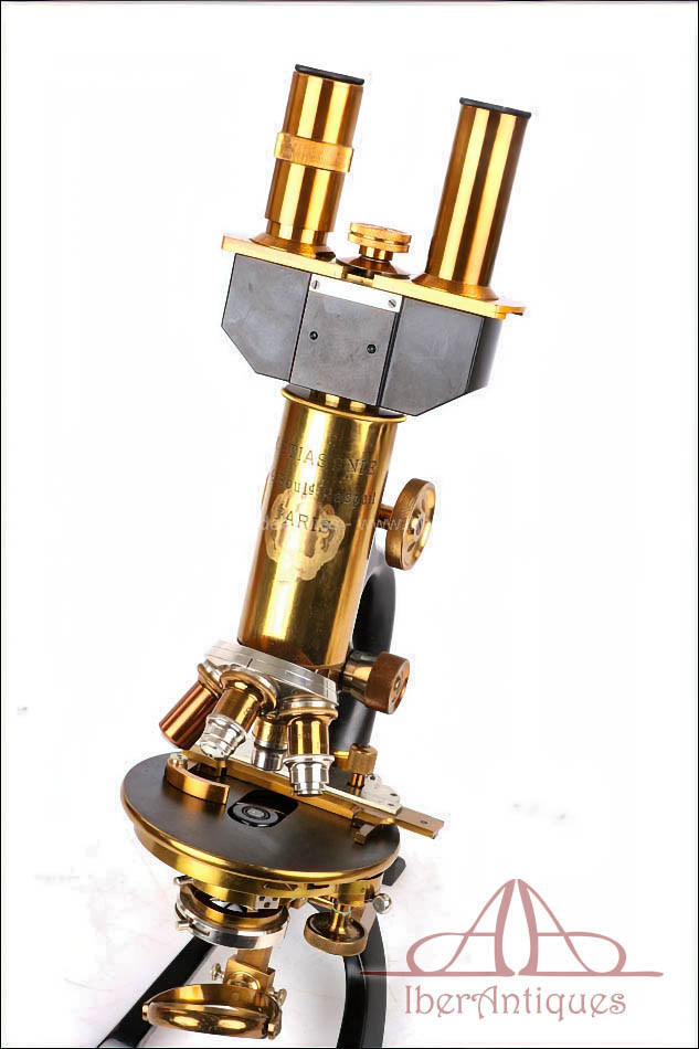 Antiguo microscopio profesional de laboratorio fabricado por la casa M. Stiassnie en París hacia 1920. Se trata de un instrumento científico de calidad, concebido desde el origen para uso médico y de laboratorio, uso profesional, y que destaca por su magnífico estado de conservación y por la amplitud de su conjunto original.
