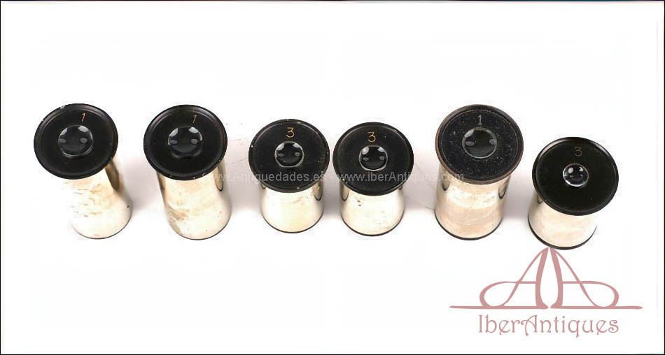 Cuenta con revólver equipado con cuatro objetivos originales de la casa M. Stiassnie, todos en muy buen estado. Este equipamiento profesional permite un uso completo y versátil, propio de microscopios de laboratorio bien dotados. El microscopio se completa con dos oculares para el uso monocular y dos pares de oculares destinados al sistema binocular.