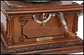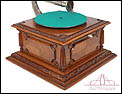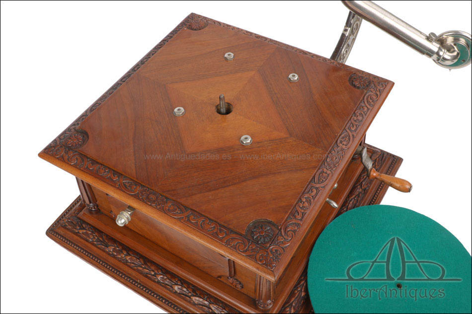 La caja de madera de nogal macizo, de forma cuadrada y sólida, presenta elegantes tallas florales y geométricas en cada una de sus caras. El trabajo de taracea y la moldura inferior tallada aportan un aire distinguido, digno de una máquina de alta gama. Se conserva con su barniz original en un tono cálido y homogéneo, solo con ligeras señales de uso propias del paso del tiempo. El plato gira con suavidad y está forrado con fieltro nuevo, colocado siguiendo el diseño original.