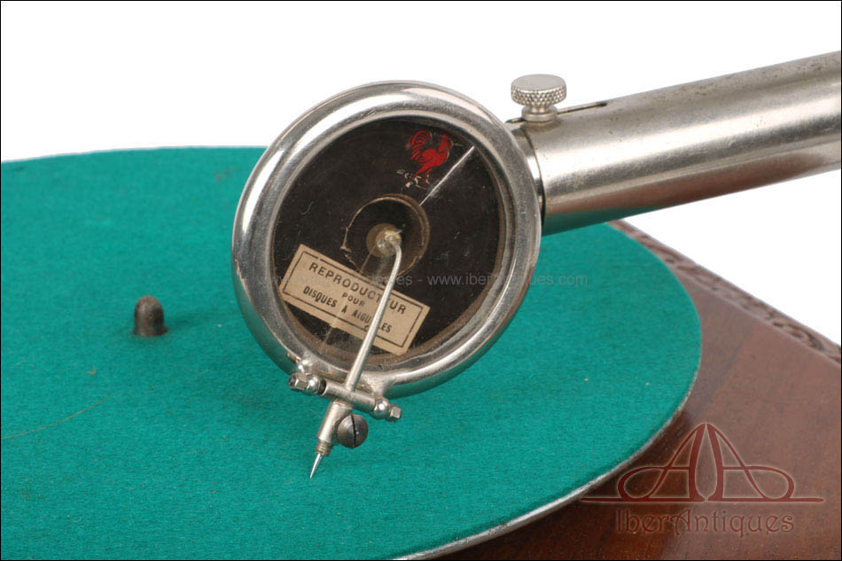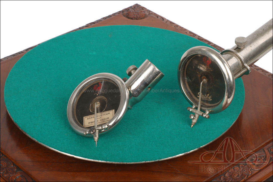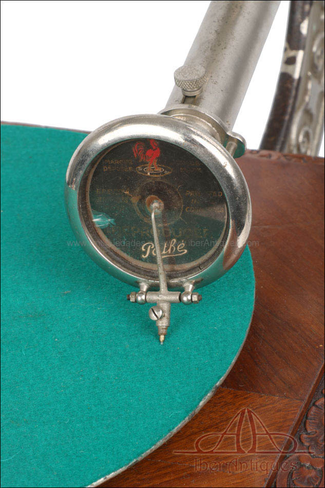Extraordinario gramófono Pathéphone Nº12, fabricado en Francia hacia el año 1915 por la prestigiosa casa Pathé, una de las firmas más influyentes en la historia de la fonografía. Se trata de uno de los modelos más lujosos y completos de la marca, pensado tanto para uso doméstico distinguido como para audiciones de alta fidelidad. Este ejemplar cuenta con dos reproductores originales: uno para discos convencionales de 78 rpm con aguja de acero, y otro de aguja permanente de zafiro, diseñado para reproducir los discos verticales de la casa Pathé. Ambos están marcados con el logotipo del gallo rojo, emblema de autenticidad de la firma.