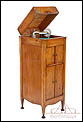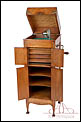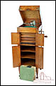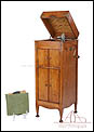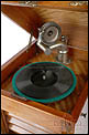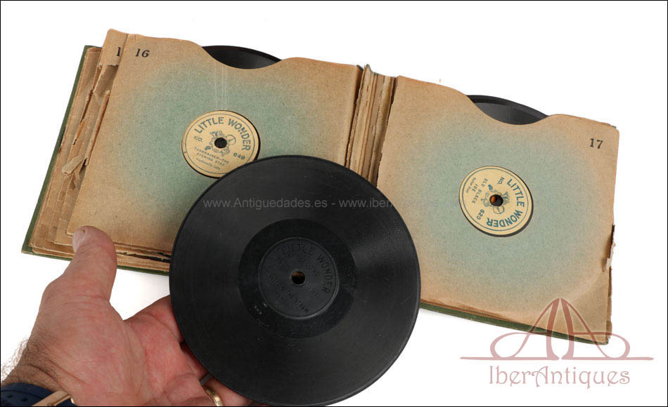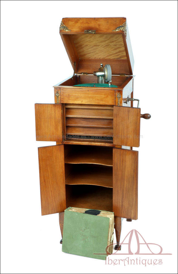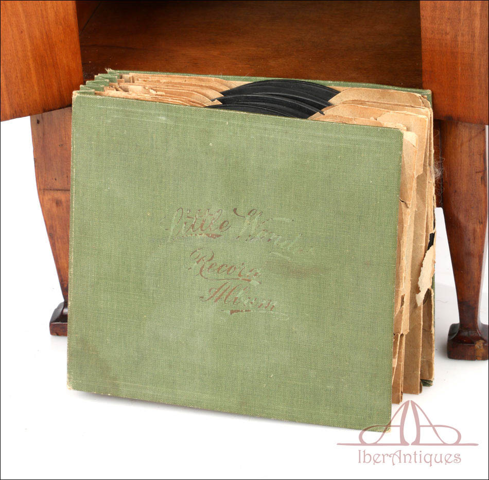 El mueble, de notable calidad, incluye dos compartimentos inferiores con puertas, destinado uno de ellos al almacenamiento de discos y el superior siendo la salida del sonido. Los 17 discos Little Wonder que acompañan a este ejemplar se conservan bien, con etiquetas legibles y sonido reconocible, aunque el álbum que los contiene presenta un avanzado deterioro del papel interior, propio de su composición original en pulpa ácida, que se desintegra al tacto. Es decir, el interior del álbum, los bolsillos de papel que contienen los discos, no están en buen estado y se desintegran solo con tocarlos porque la pulpa de papel con los que los hicieron no ha aguando bien el paso de los años.