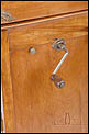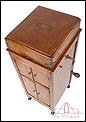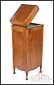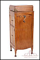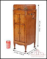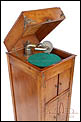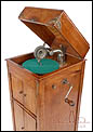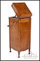 El diseño simula un pequeño sinfonier o mueble fonográfico, pero en escala reducida, con una exquisita estructura de madera maciza clara y remates metálicos decorativos en las esquinas superiores. Su tamaño compacto y la elegante proporción del mueble la convierten en una pieza de transición entre los grandes gramófonos de salón y los modelos domésticos de bajo coste. A pesar de su apariencia sencilla, no se trata de un juguete, sino de una máquina real destinada al público adulto, especialmente a quienes deseaban disfrutar de la música grabada sin poder costear los aparatos de lujo.