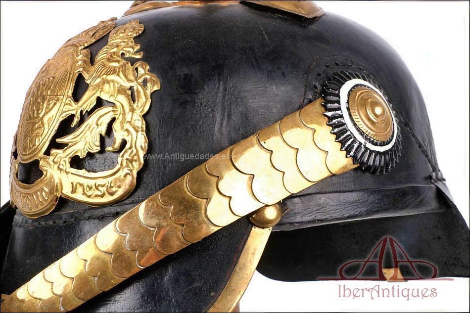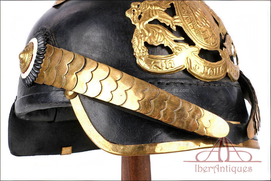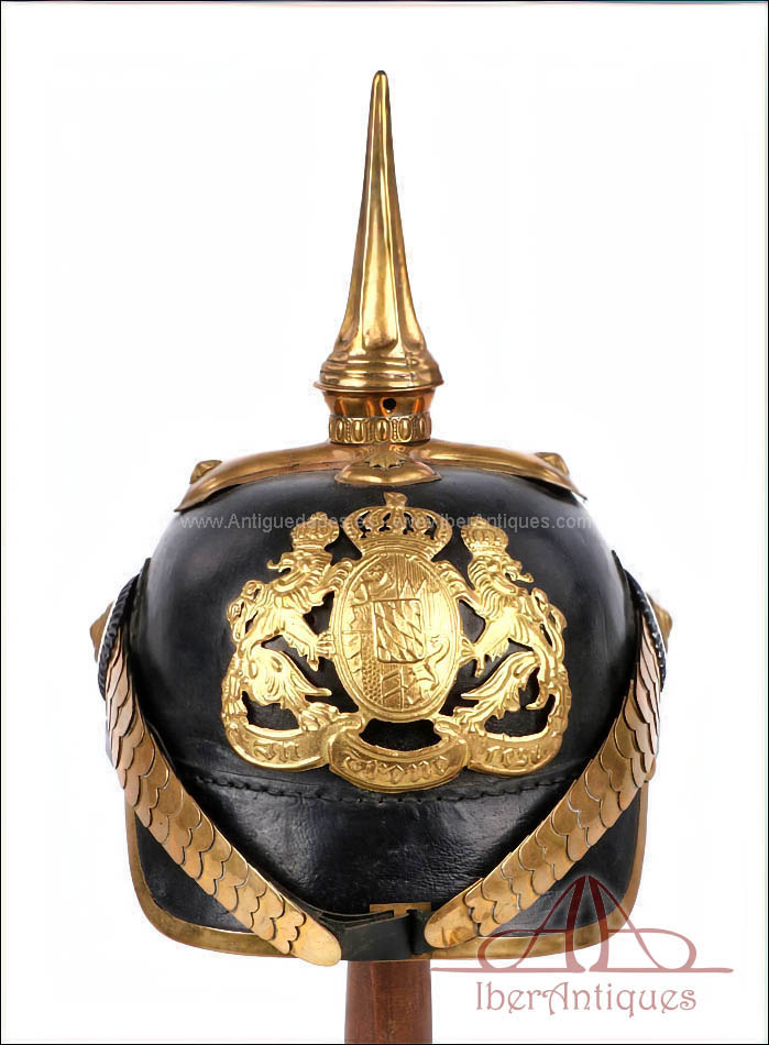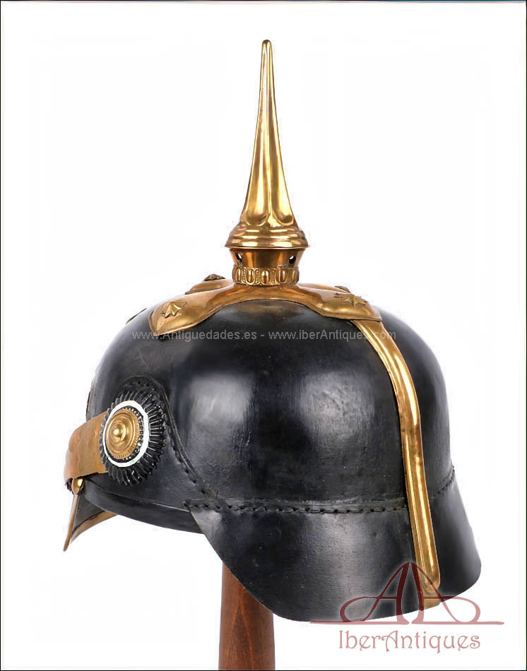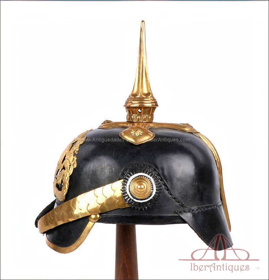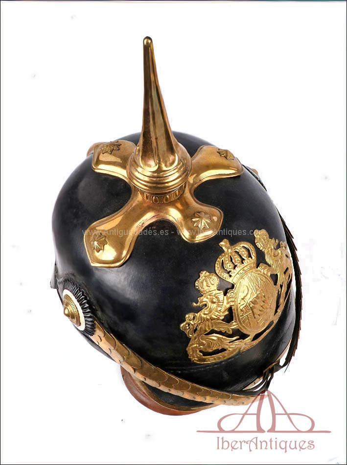 El casco conserva la forma, el volumen y la estructura propios del Pickelhaube alemán de finales del siglo XIX y comienzos del XX. Sobre la base original de suboficial se han montado herrajes antiguos de oficial. La única pieza que no es original de época es la placa frontal, que es posterior. El resto de los herrajes visibles corresponden a piezas antiguas, correctamente integradas en el casco.