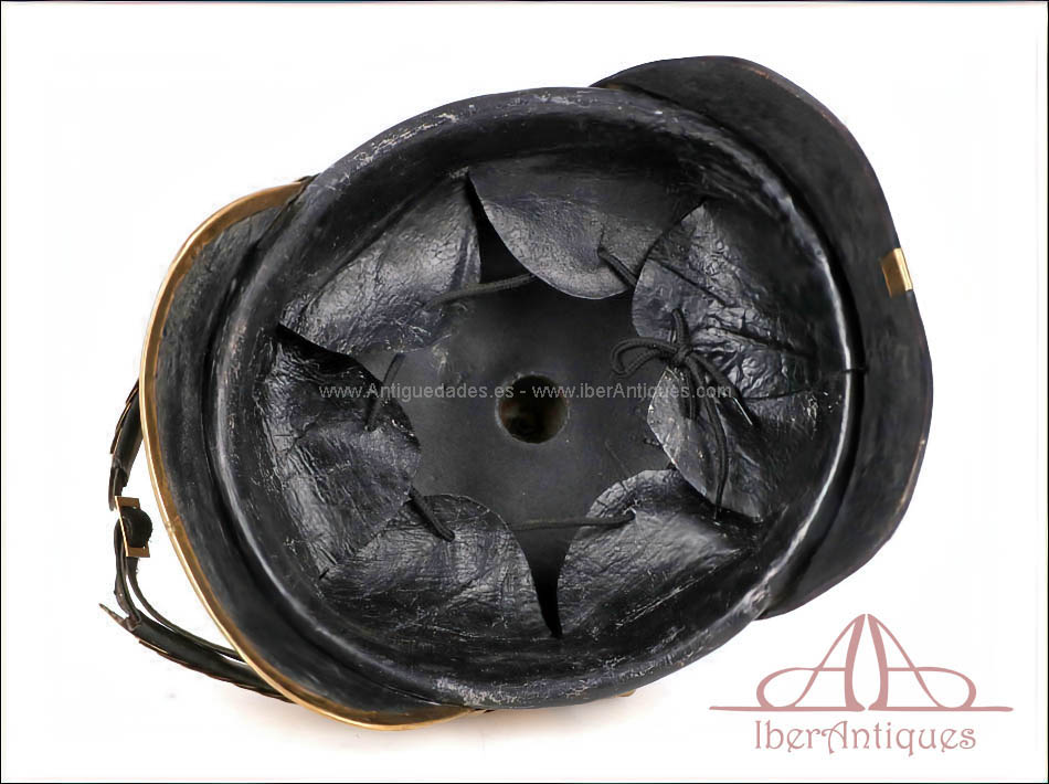 El casco ha sido restaurado completamente. El cuero presenta un acabado limpio y homogéneo, con buena solidez estructural y sin deformaciones acusadas. Los elementos metálicos muestran un tono dorado uniforme, bien ajustado al conjunto y con una pátina acorde a la antigüedad de las piezas. El interior se encuentra en consonancia con la restauración realizada.