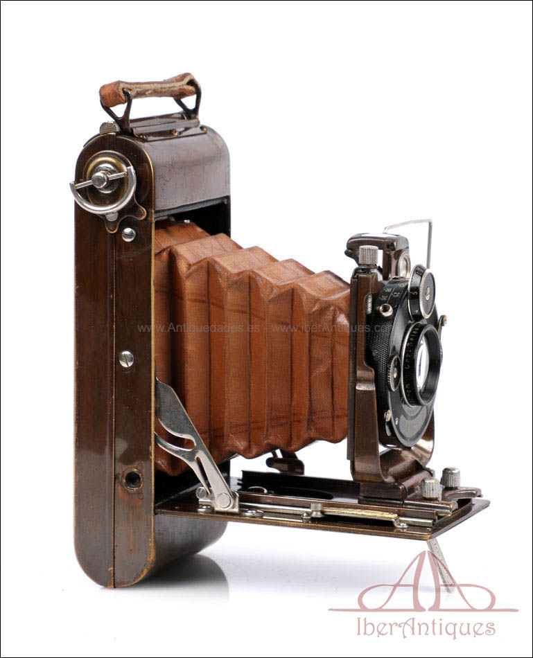 El conjunto óptico presenta un objetivo anastigmático de fabricación británica, montado sobre el Compur y con sistema de enfoque frontal mediante extensión de fuelle. El visor abatible lateral y el marco de alambre permiten un encuadre rápido y preciso, mientras que la base integra un indicador de distancia graduado en pies y metros. El armazón metálico frontal mantiene su pátina original con discreto desgaste coherente con la edad, sin corrosión relevante ni deformaciones estructurales.