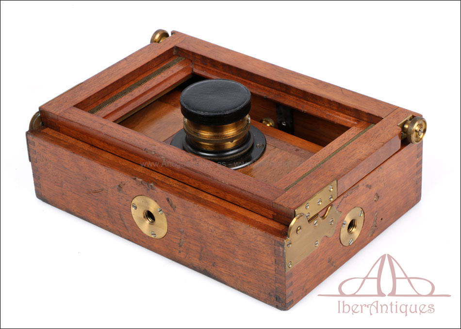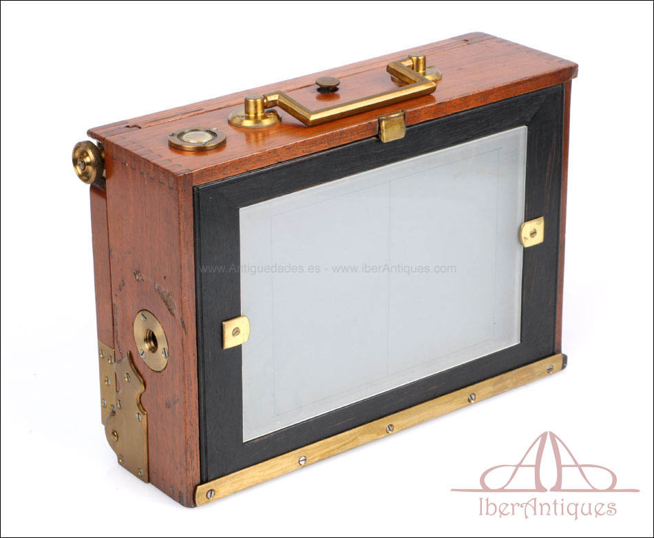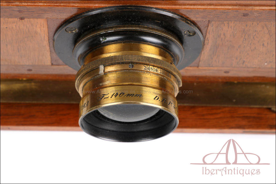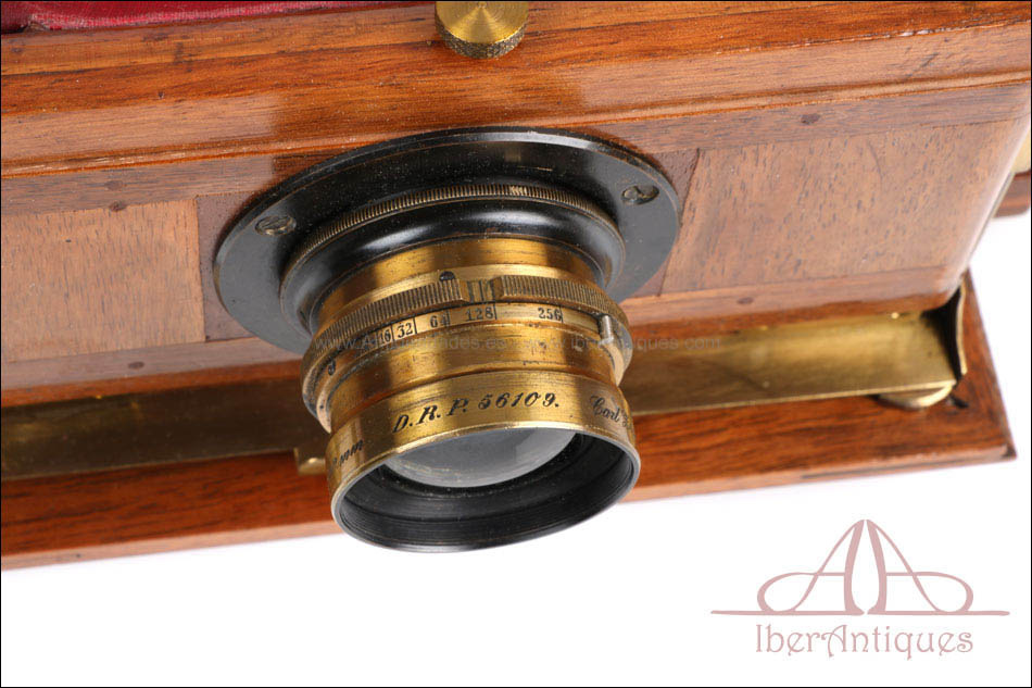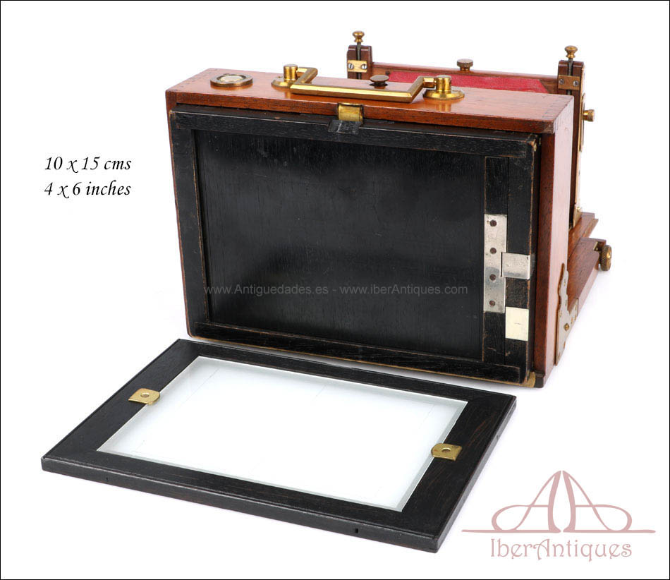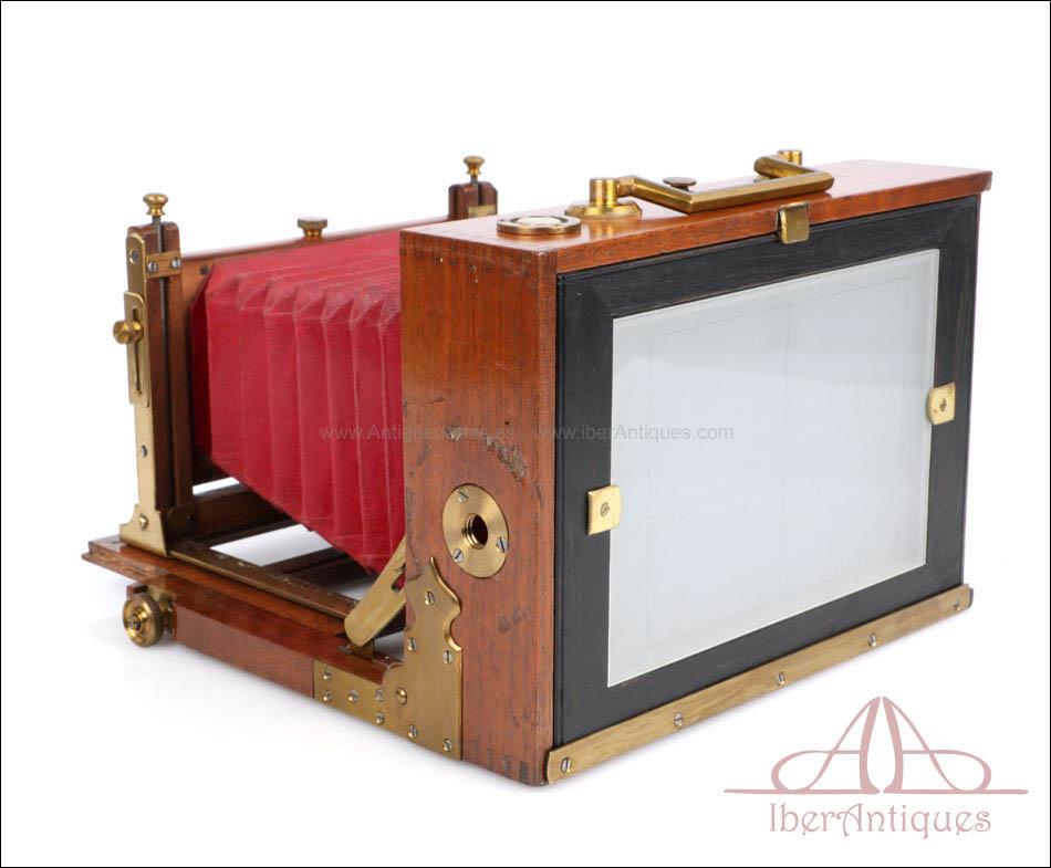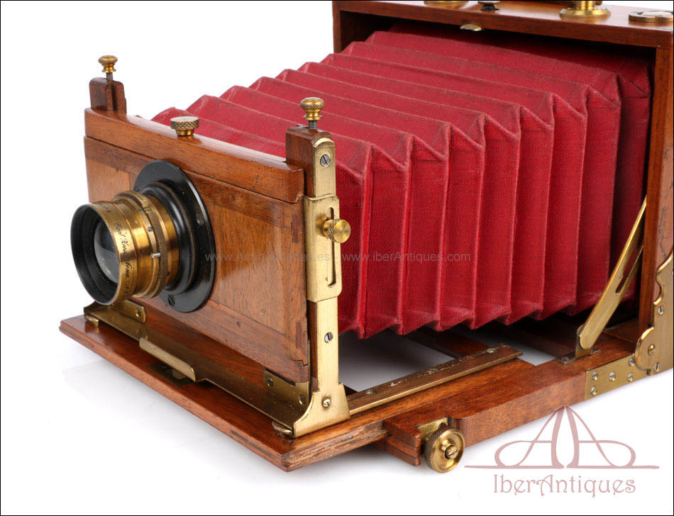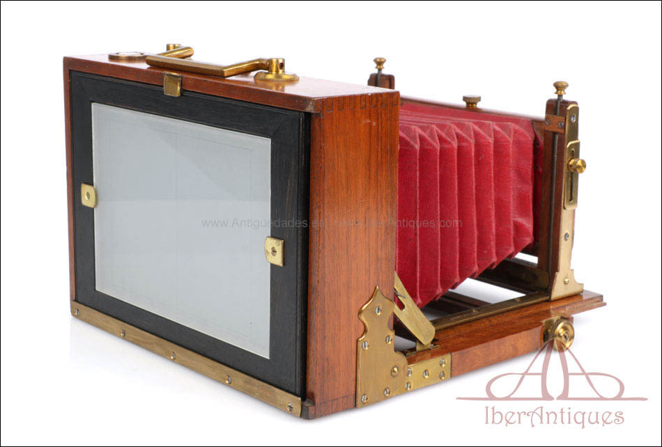 El conjunto que se presenta mantiene todas sus partes originales y se conserva en excelente estado. El cuerpo de madera muestra un barniz profundo y brillante que resalta la veta natural del nogal. Los herrajes, pomos y bisagras de latón se encuentran completos, firmes y funcionales. El sistema de enfoque mediante cremallera frontal desliza con suavidad y precisión, permitiendo ajustes milimétricos del plano focal. El fuelle, de intenso color burdeos, se encuentra impecable, sin grietas ni filtraciones de luz. El vidrio esmerilado trasero muestra claridad perfecta, y el chasis incluido se ajusta sin holgura alguna, lo que permite todavía su uso con placas del formato original.