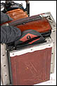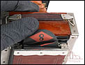 Su cuerpo está construido en madera tropical barnizada, con herrajes de níquel brillante, cierres metálicos reforzados y fuelle de cuero color miel. La textura cálida de la madera contrasta con el negro satinado del conjunto frontal, confiriendo al instrumento una elegancia técnica inconfundible. En la parte superior conserva la asa de cuero original y el visor óptico plegable lateral, perfectamente alineado.