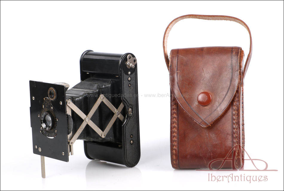 Su cuerpo metálico, lacado en negro brillante y con textura de cuero prensado, guarda la elegancia funcional de las Kodak de preguerra. La cámara mantiene su fuelle de cuero original, completamente íntegro y flexible, sin grietas ni roturas, algo poco común tras más de un siglo. En su parte trasera conserva el estilus metálico autográfico original, finamente grabado y alojado en su soporte superior, perfectamente conservado, lo que demuestra que la cámara está completa y original.